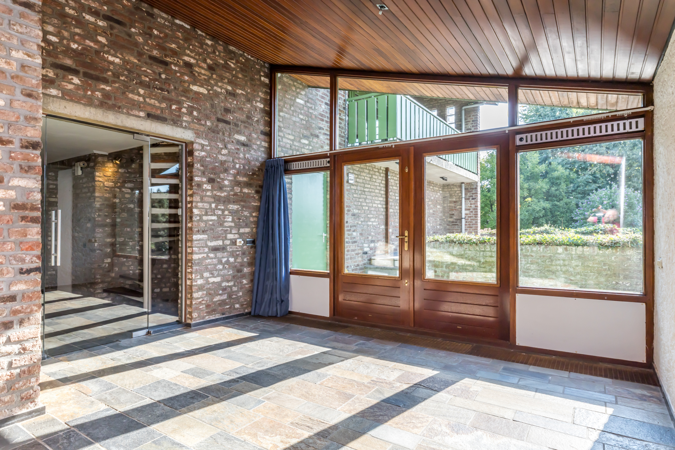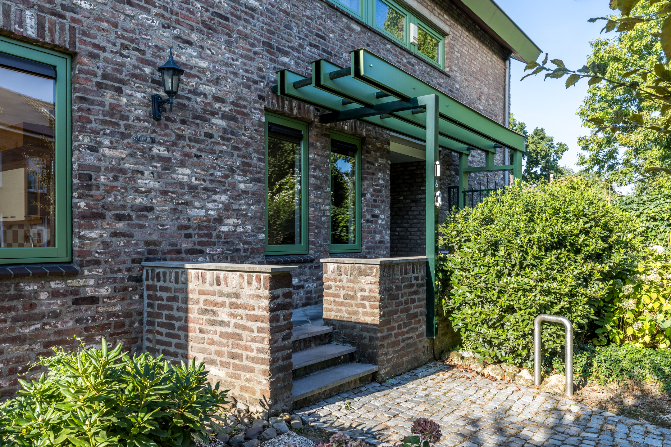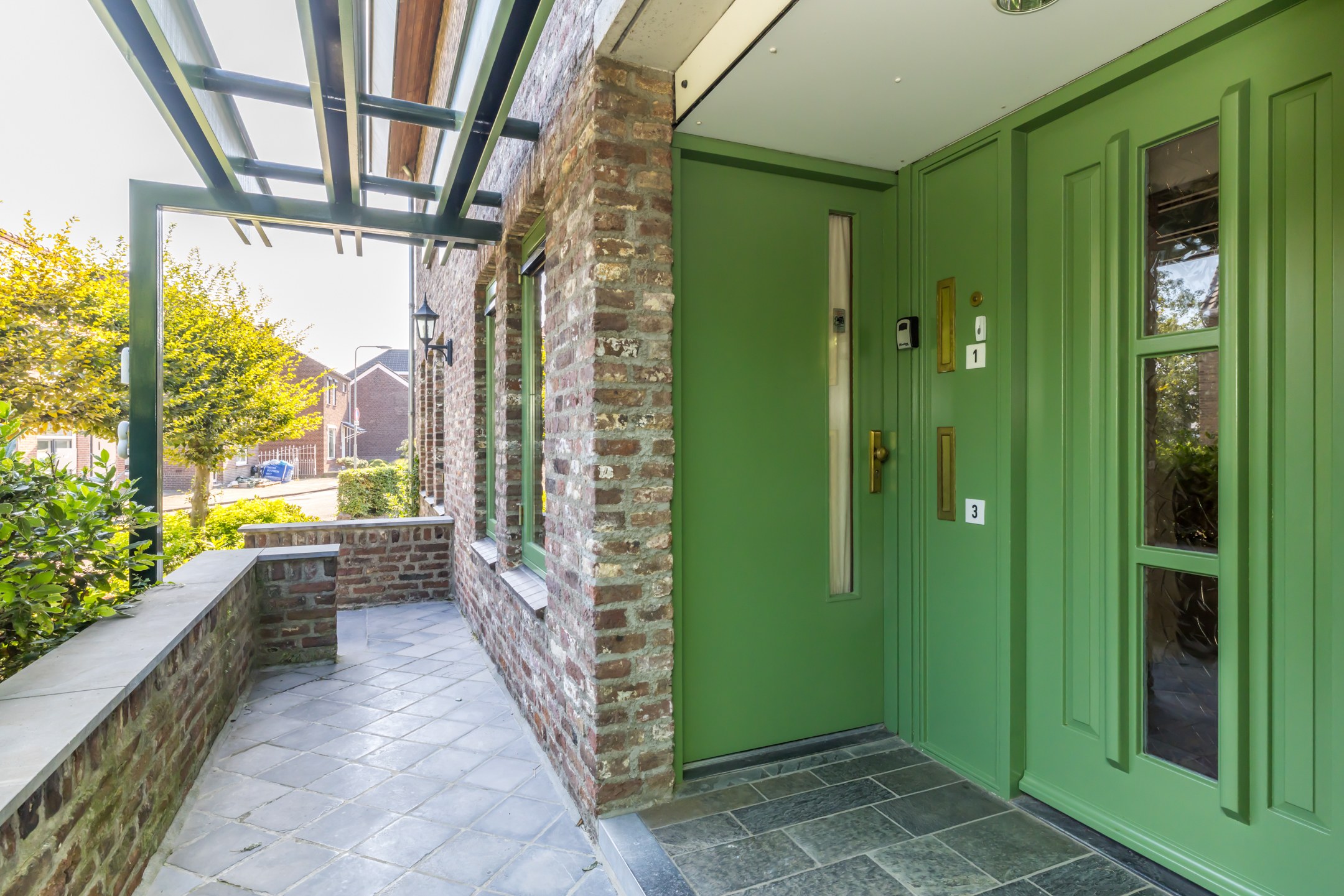 Aan de kant van de Meesweg loopt u, via de voortuin en de buitentrap, naar de overdekte entree van dit bijzondere woonhuis. Hier zijn twee voordeuren, twee brievenbussen en ook twee huisnummers.