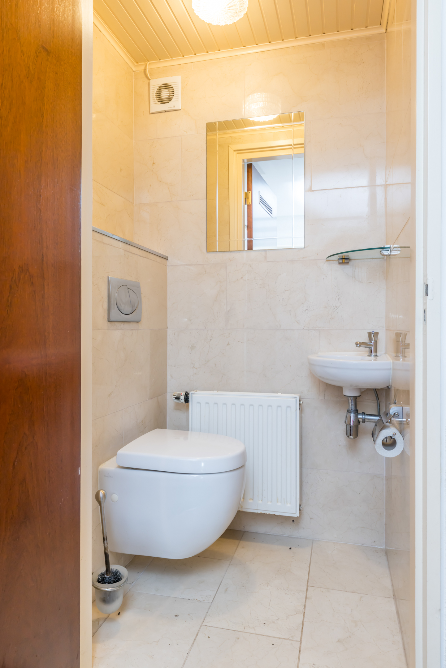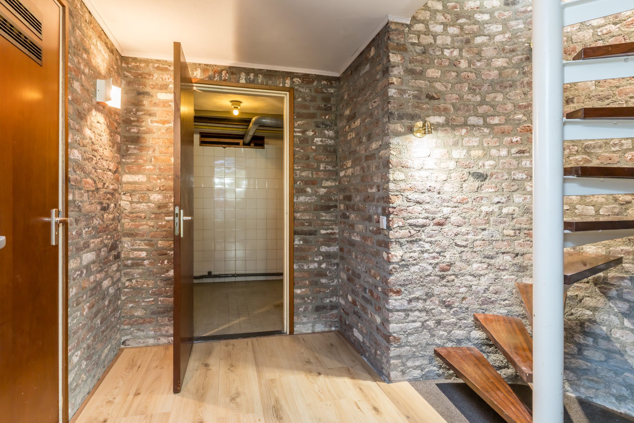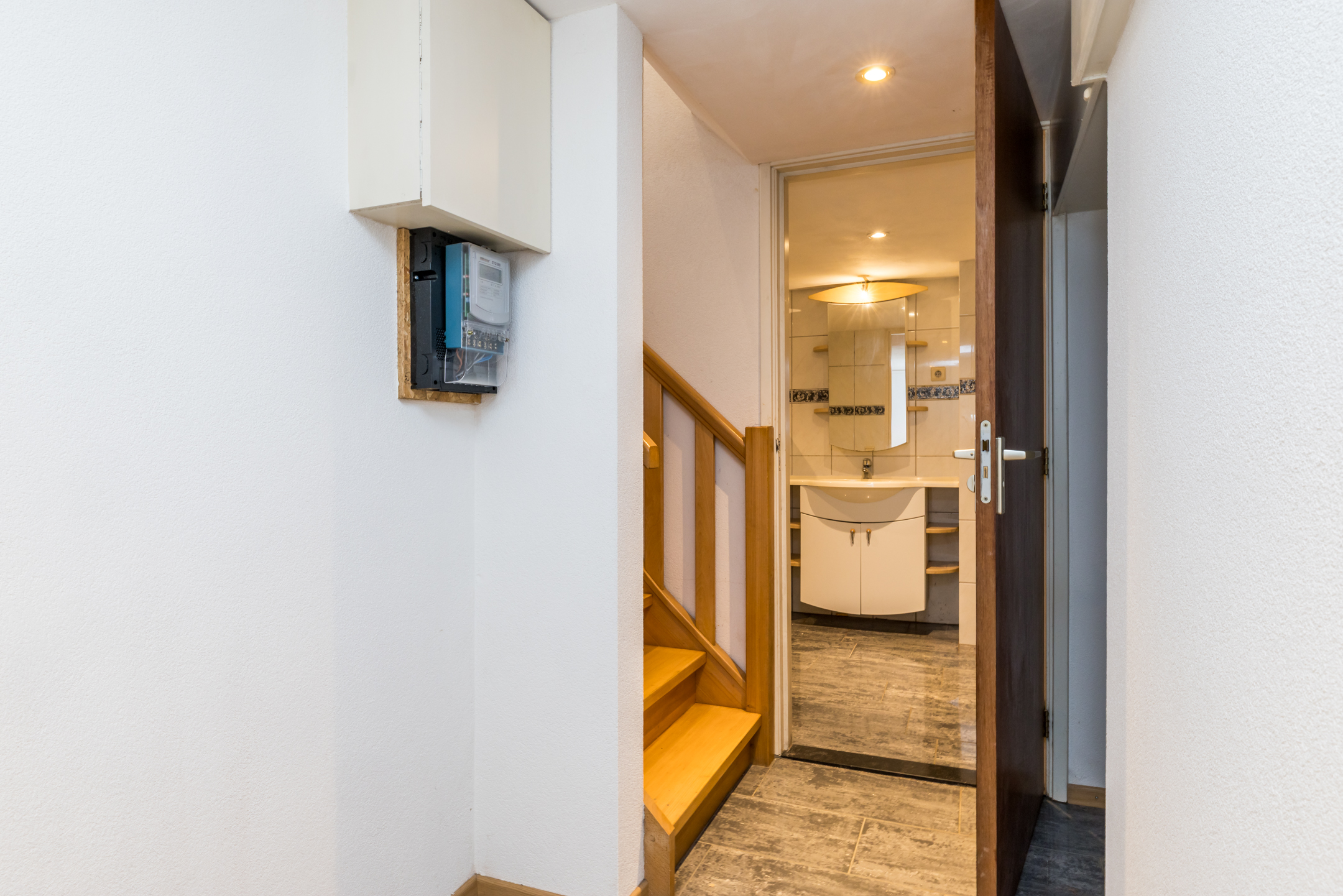 De deur aan de linkerzijde is van huisnummer 1, en geeft toegang tot een lichte hal. Hier ligt een donkere travertinvloer, en is de trap naar het souterrain. Links van de trap is een toiletruimte met fonteintje, uitgevoerd in een lichte kleurstelling.