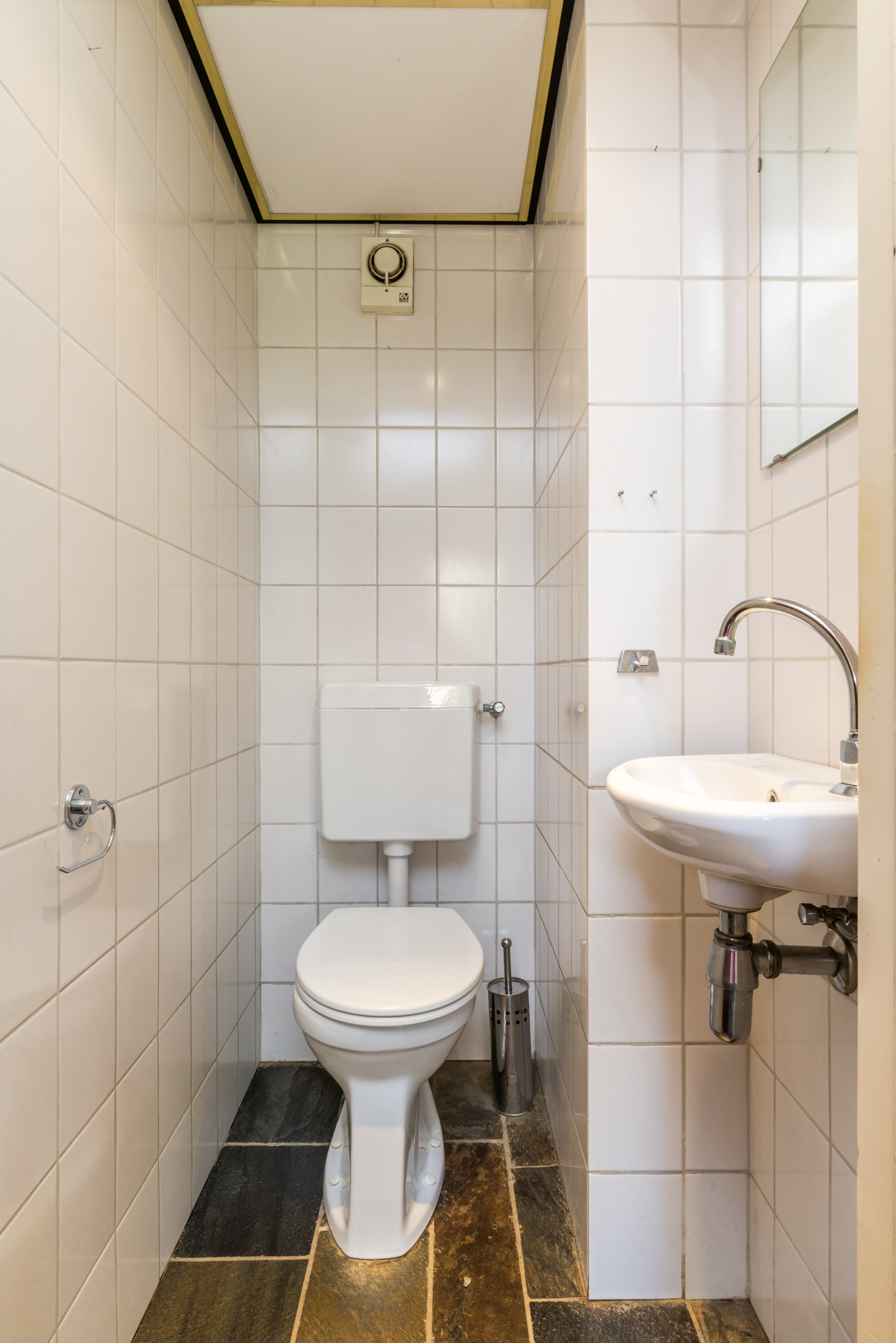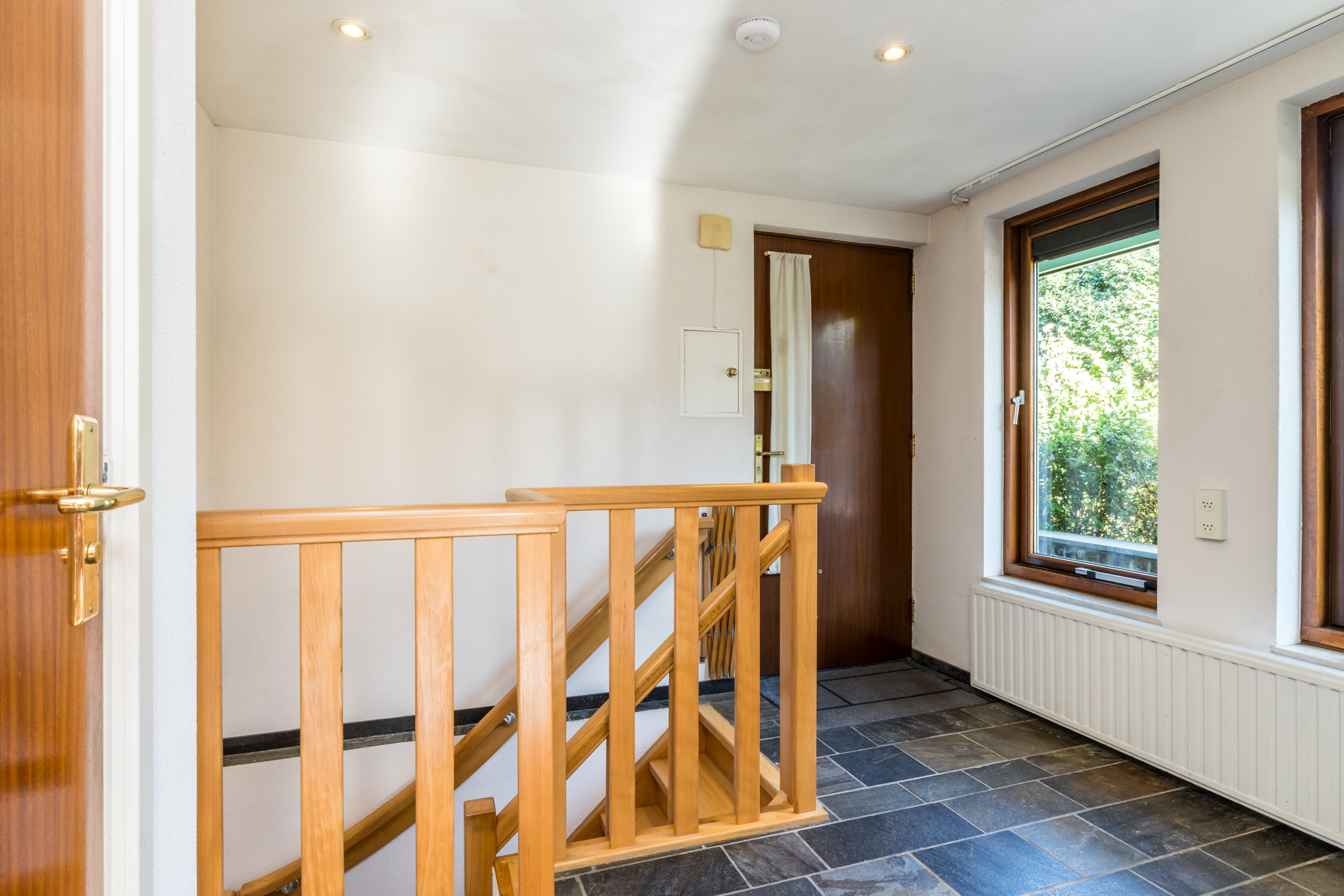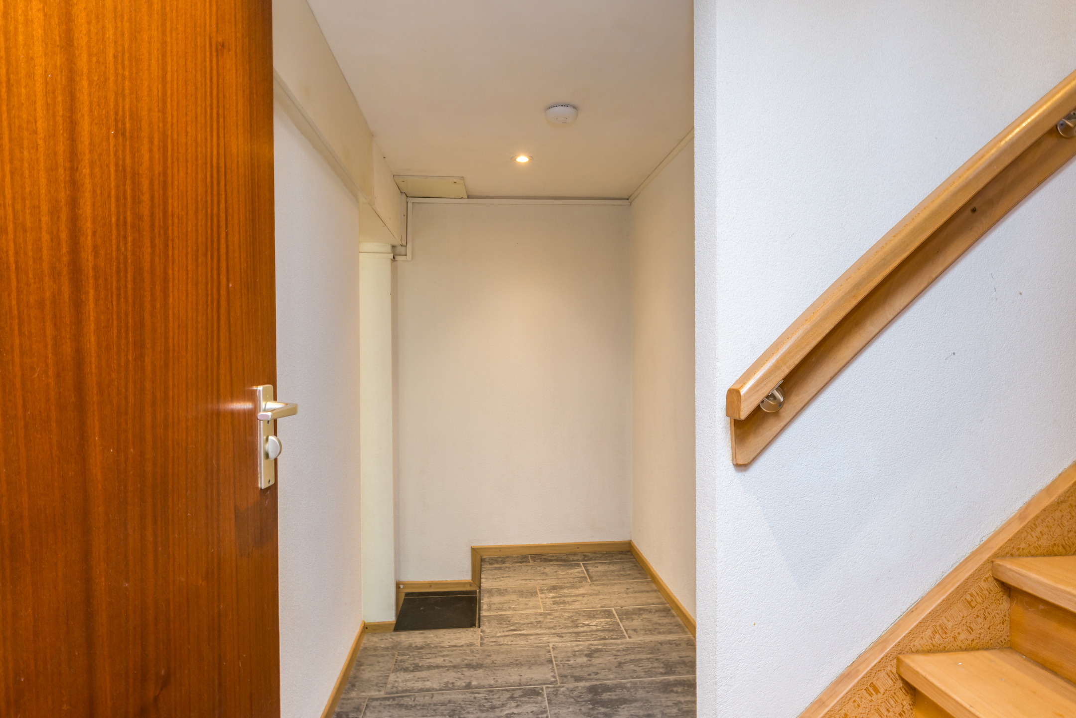 De deur aan de linkerzijde is van huisnummer 1, en geeft toegang tot een lichte hal. Hier ligt een donkere travertinvloer, en is de trap naar het souterrain. Links van de trap is een toiletruimte met fonteintje, uitgevoerd in een lichte kleurstelling.