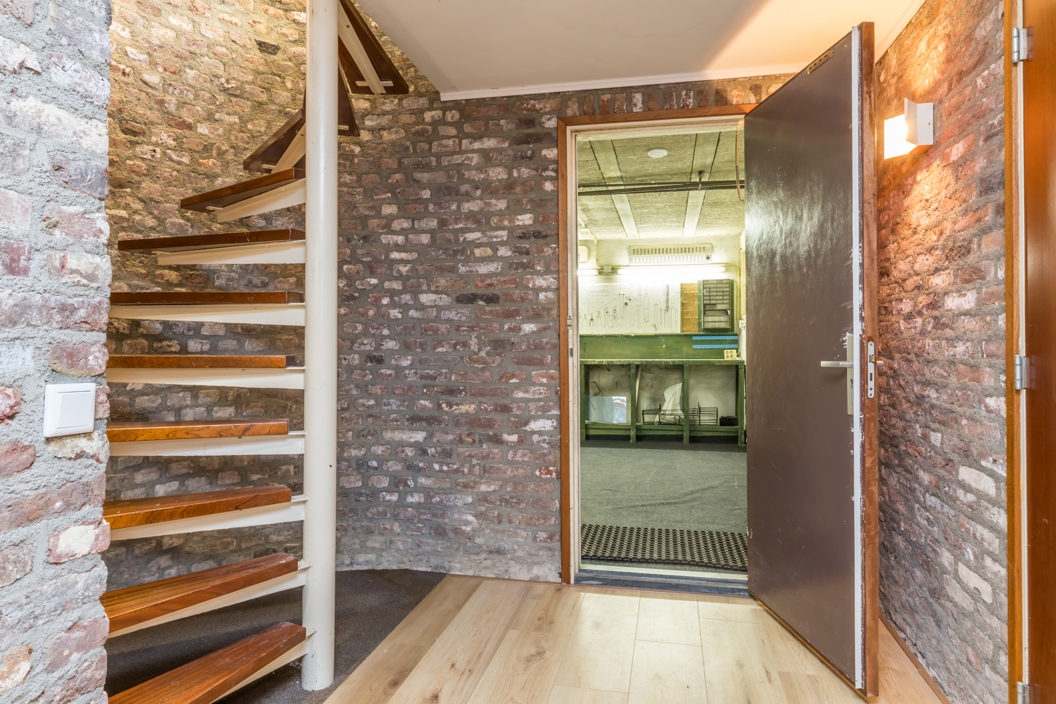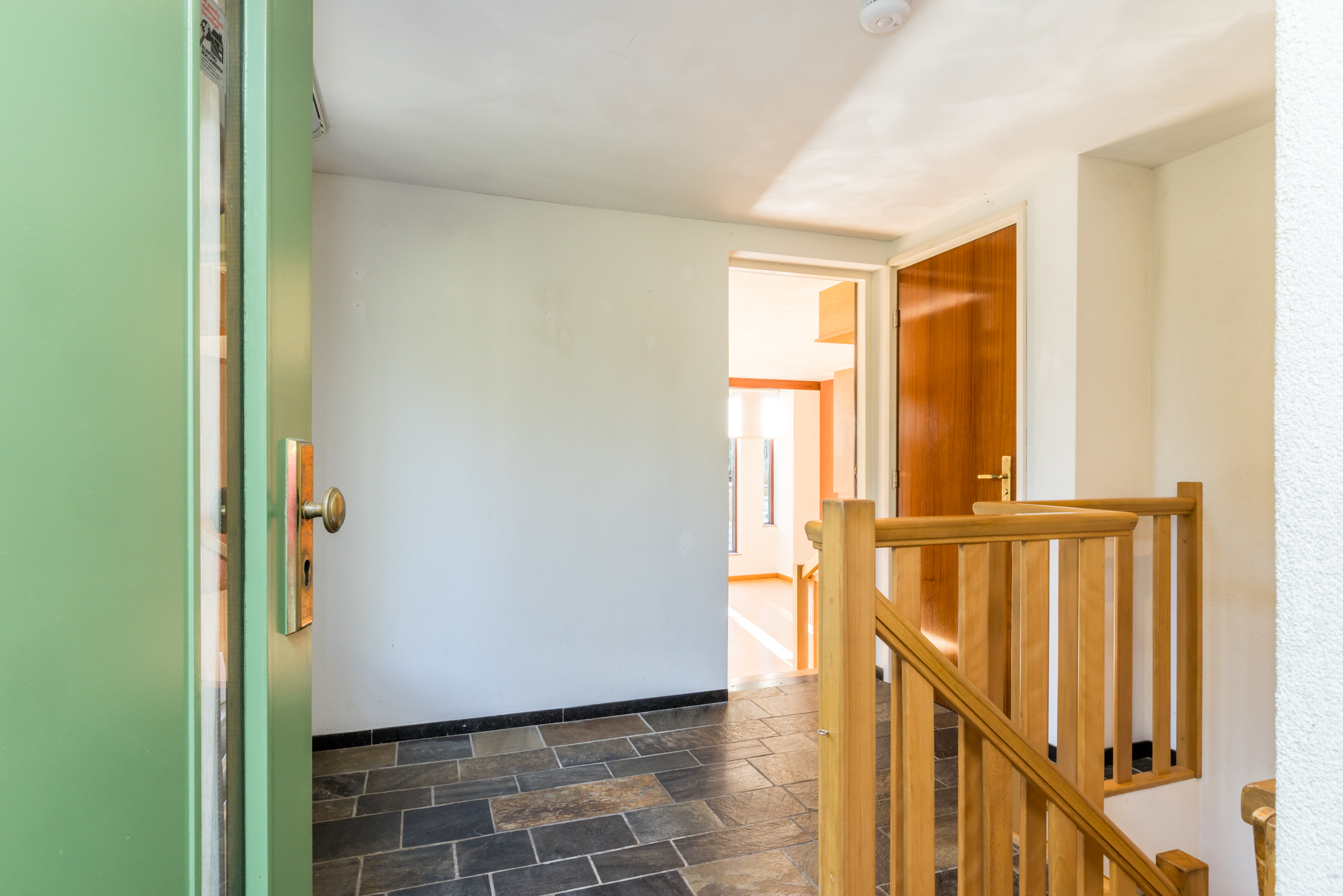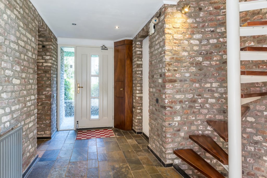 Betreedt u het woonhuis via de andere voordeur, dan stapt u een royale ontvangsthal in. Aan de rechterzijde zijn de garderobe, meterkast en een toiletruimte met fonteintje. Een grote, glazen deur verbindt de hal met de eetkamer en aan de linkerzijde zijn de wenteltrappen, naar het souterrain en de eerste verdieping.