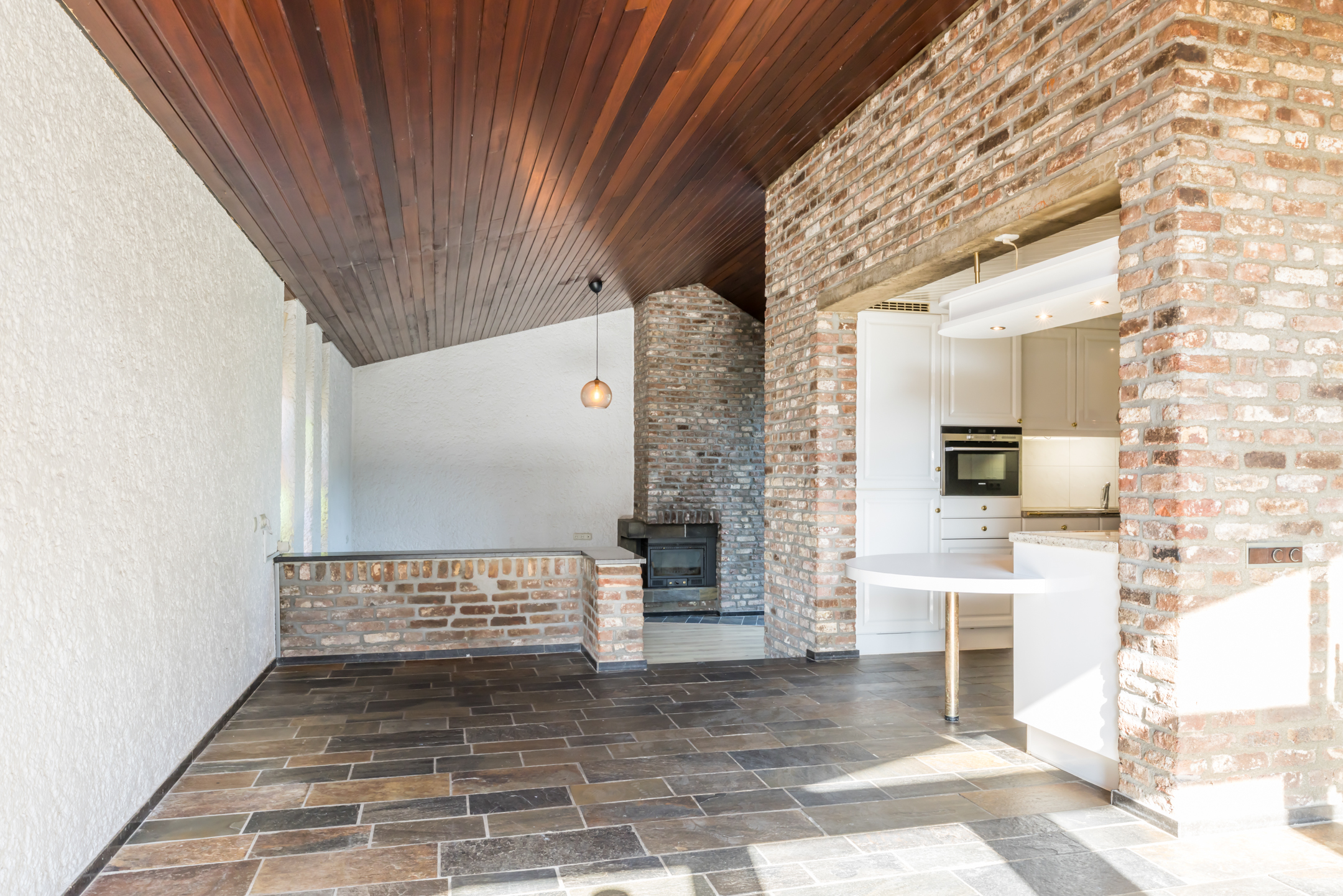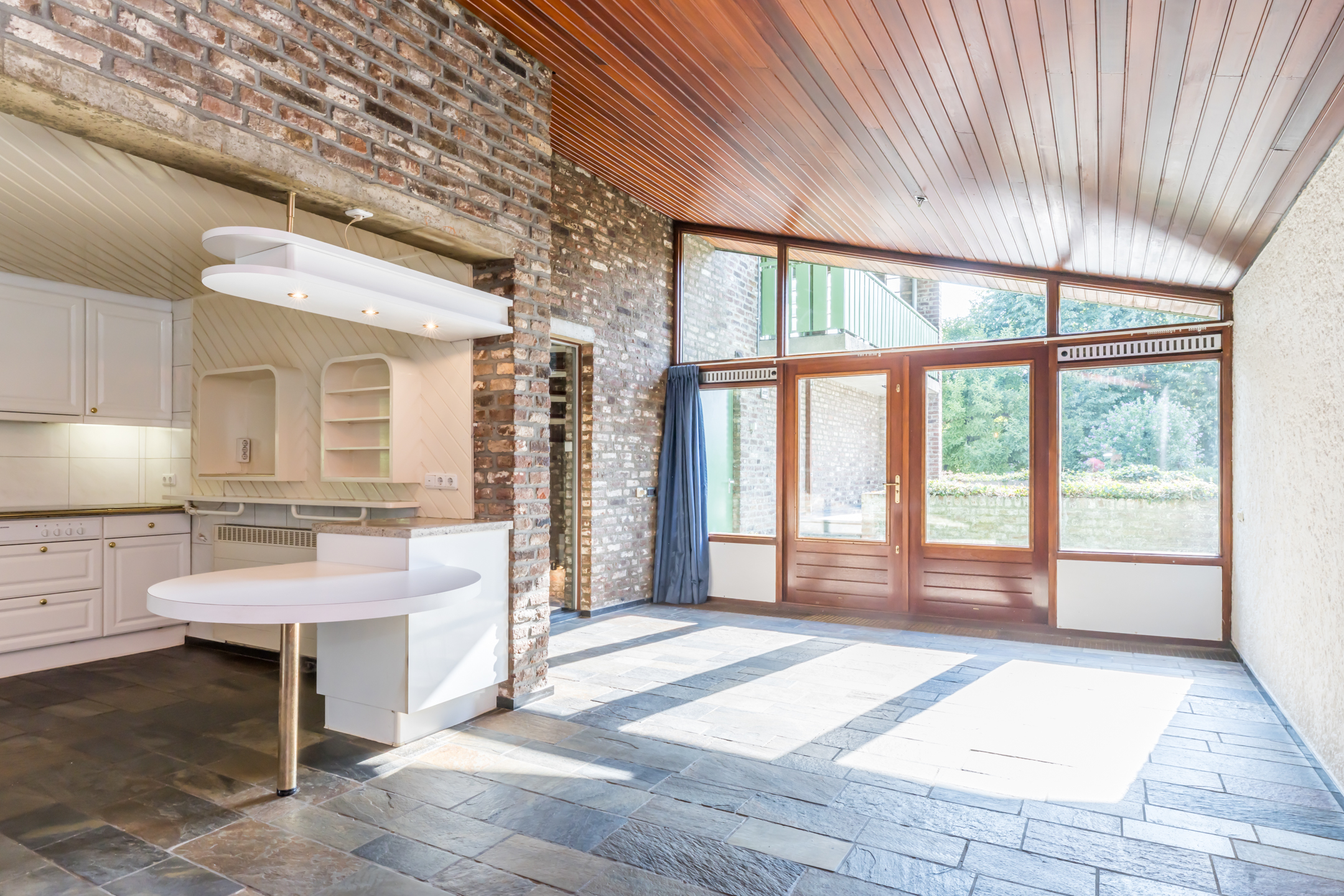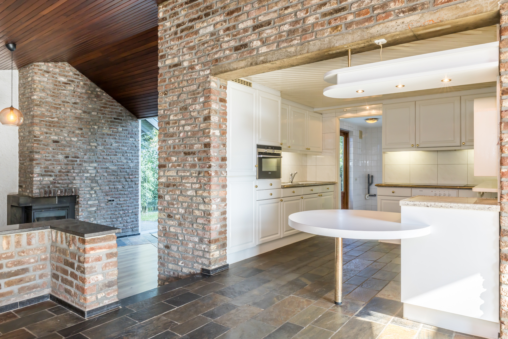 In de eetkamer is de typische architectuur van de jaren ’70 goed zichtbaar, met het schuine dak en een open verbinding met de lager gesitueerde woonkamer. In de eetkamer en de aansluitende keuken ligt, net als in de hal, een travertinvloer en de grote pui met openslaande deuren biedt toegang tot het terras en de tuin.