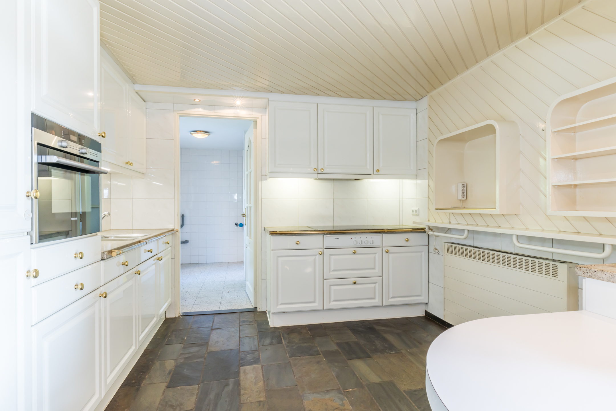 De ruimte in de keuken is optimaal benut, met een royale keukenopstelling en een vaste ontbijttafel. De aanrechtbladen zijn van marmer en alle apparatuur is ingebouwd: een inductie kookplaat, afzuiging, combi-oven, koelkast en een vriezer. Naast de keuken is een praktische bijkeuken, met een inbouwkast en de wasmachineaansluiting. De bijkeuken heeft een directe toegang tot de tuin.