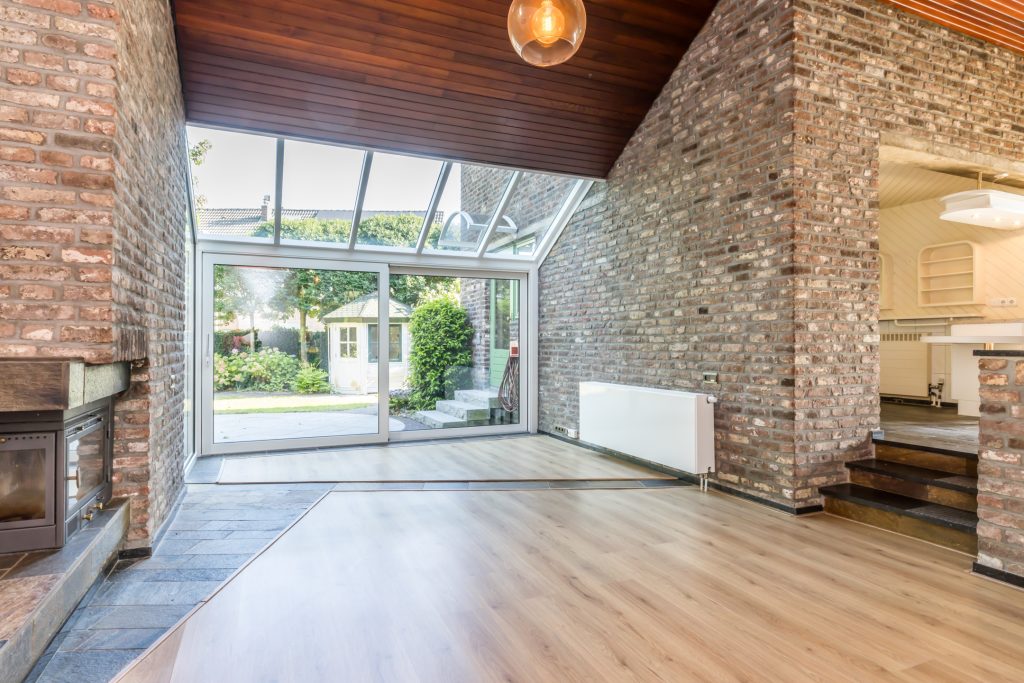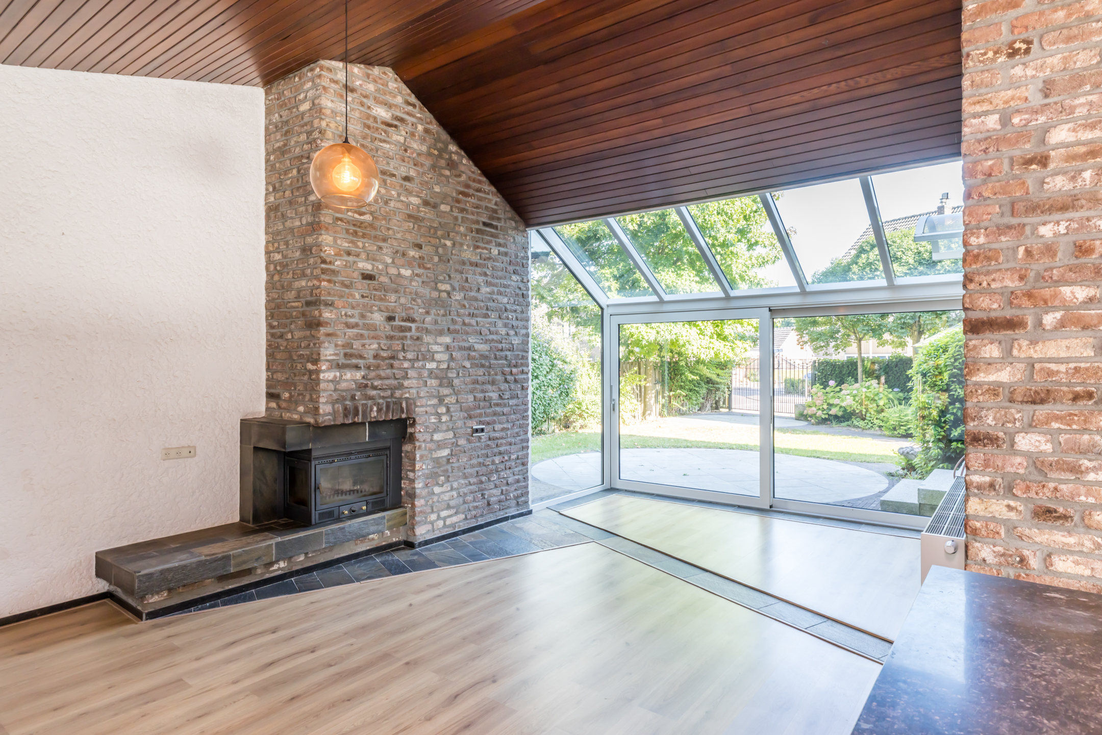 Een trap van slechts enkele treden verbindt de eetkamer met de woonkamer, met een inbouwhaard en drie kleurrijke ramen als sfeermakers. Er is een optimale verbinding met de tuin, zowel visueel of fysiek via de grote schuifpui. De royale hoogte van de woonkamer, met zicht tot in de nok, maakt deze woonkamer tot een hele aantrekkelijke ruimte.