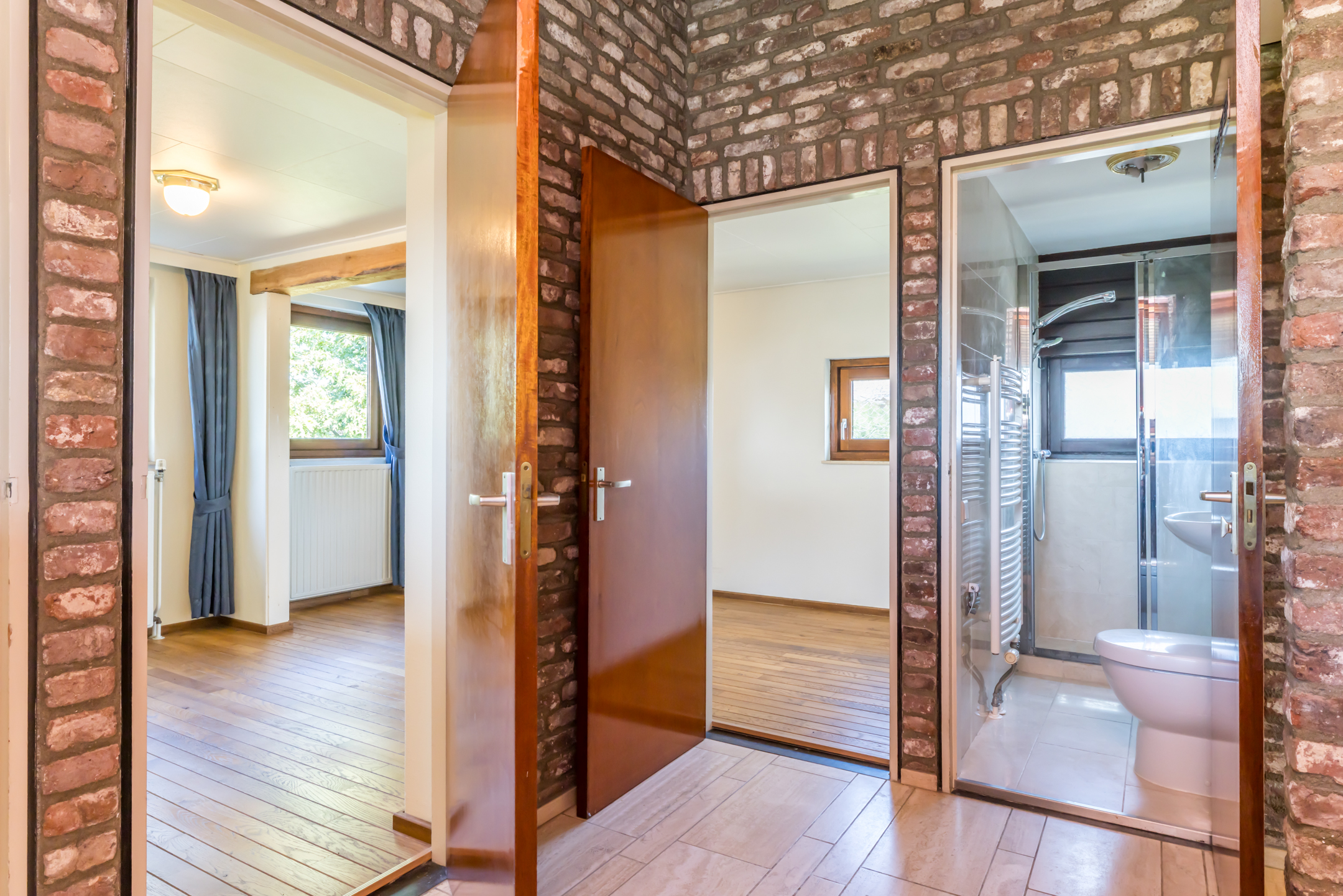 De gehele eerste verdieping, met drie slaapkamers en twee badkamers, hoort bij huisnummer 3. Een van de kamers kan op eenvoudige wijze worden gesplitst in twee kinderkamers, en de master bedroom met vaste kastenwand heeft openslaande deuren naar een ruim 5 meter breed balkon met een fraai uitzicht over het heuvelland.