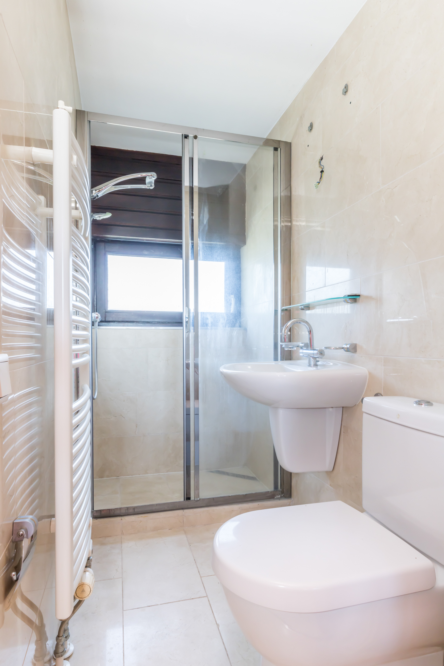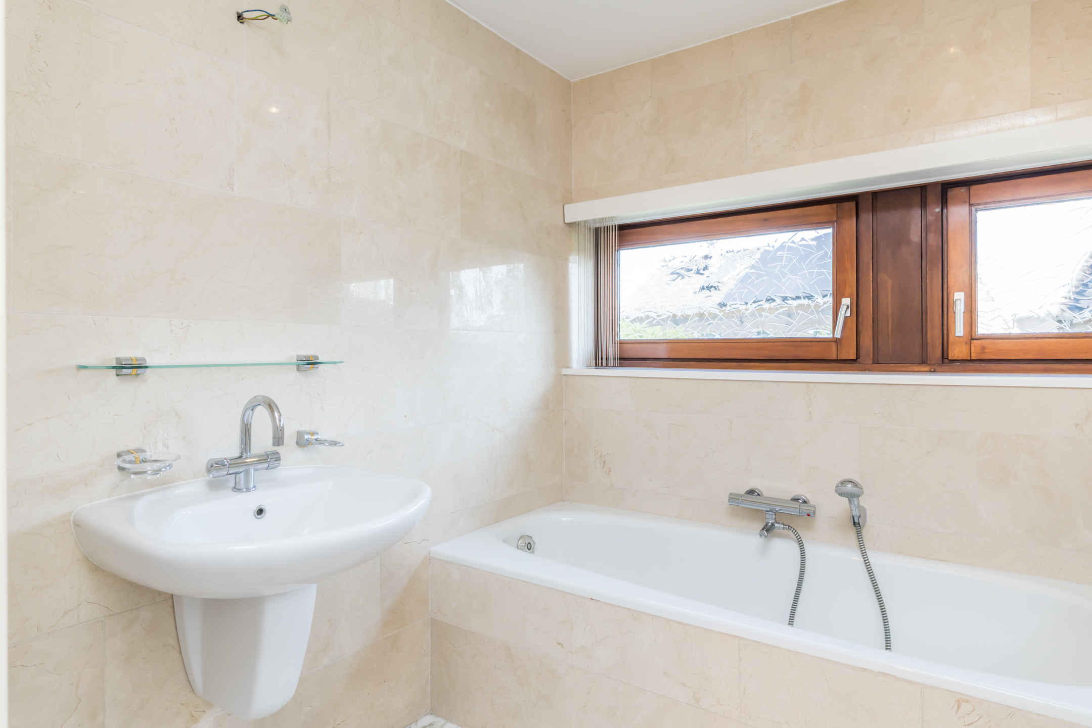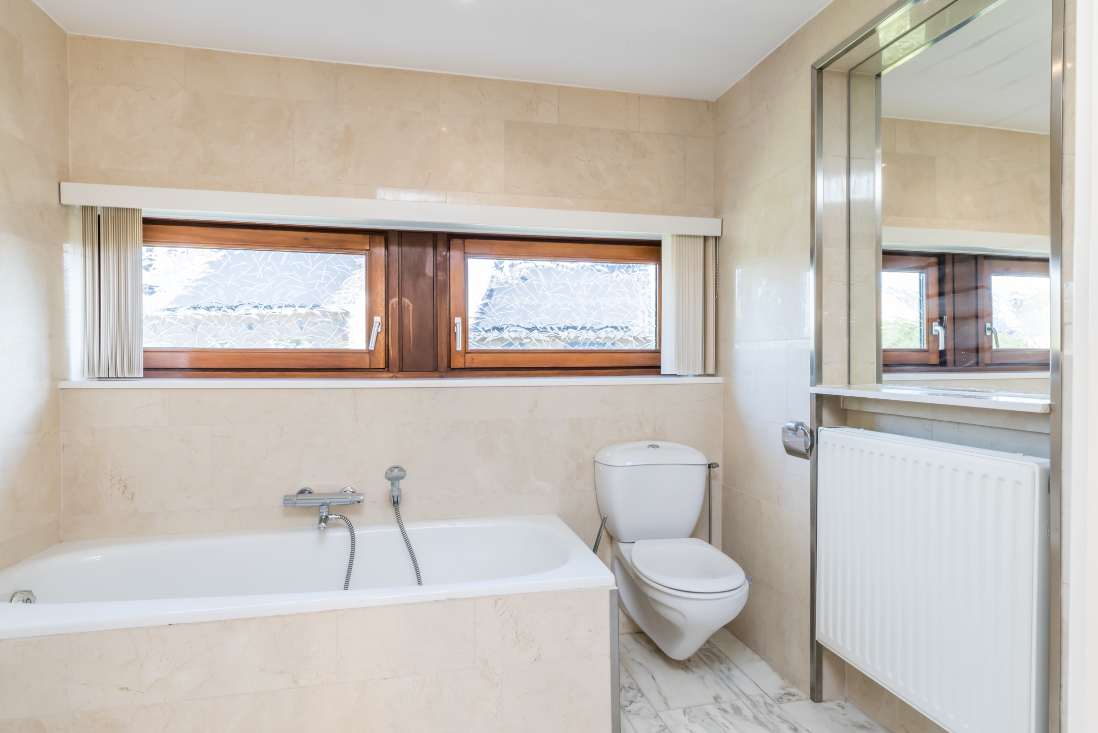 De eerste badkamer, te bereiken vanuit de master bedroom, is ingedeeld met een ligbad, wastafel en een toilet. Zowel de wanden als de vloer zijn afgewerkt met marmer, net als in de tweede badkamer. Deze badkamer, perfect voor de kinderen, biedt ruimte aan een douche, wastafel en een toilet.