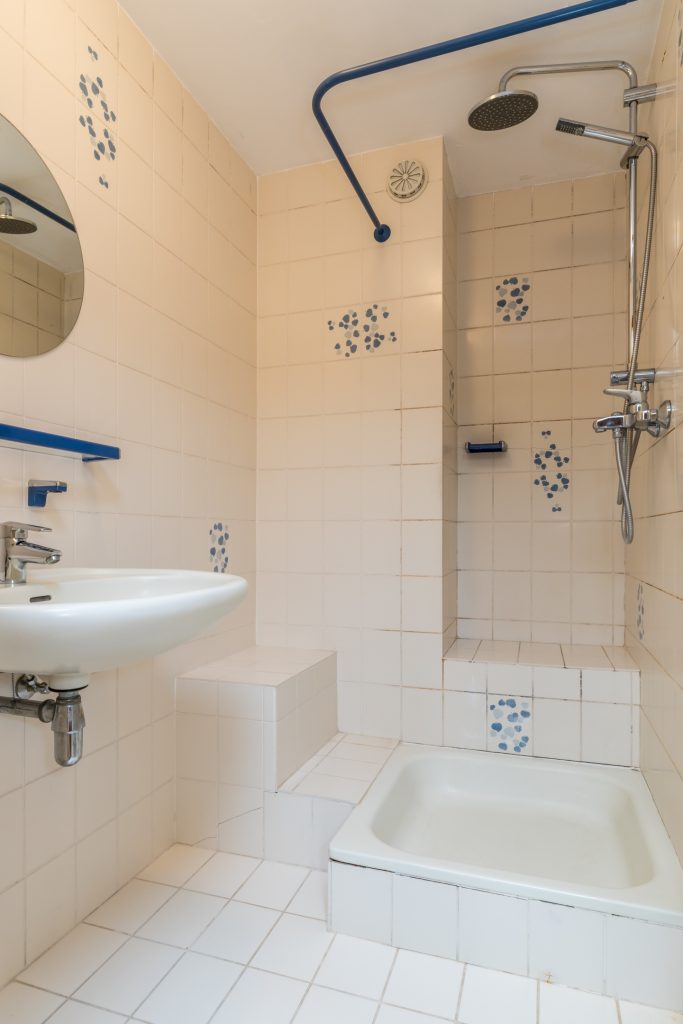 De volledig betegelde badkamer beschikt over een ligbad, toilet, bidet en dubbele wastafel. Daarnaast is er een tweede, kleinere badkamer met douche en wastafel.
