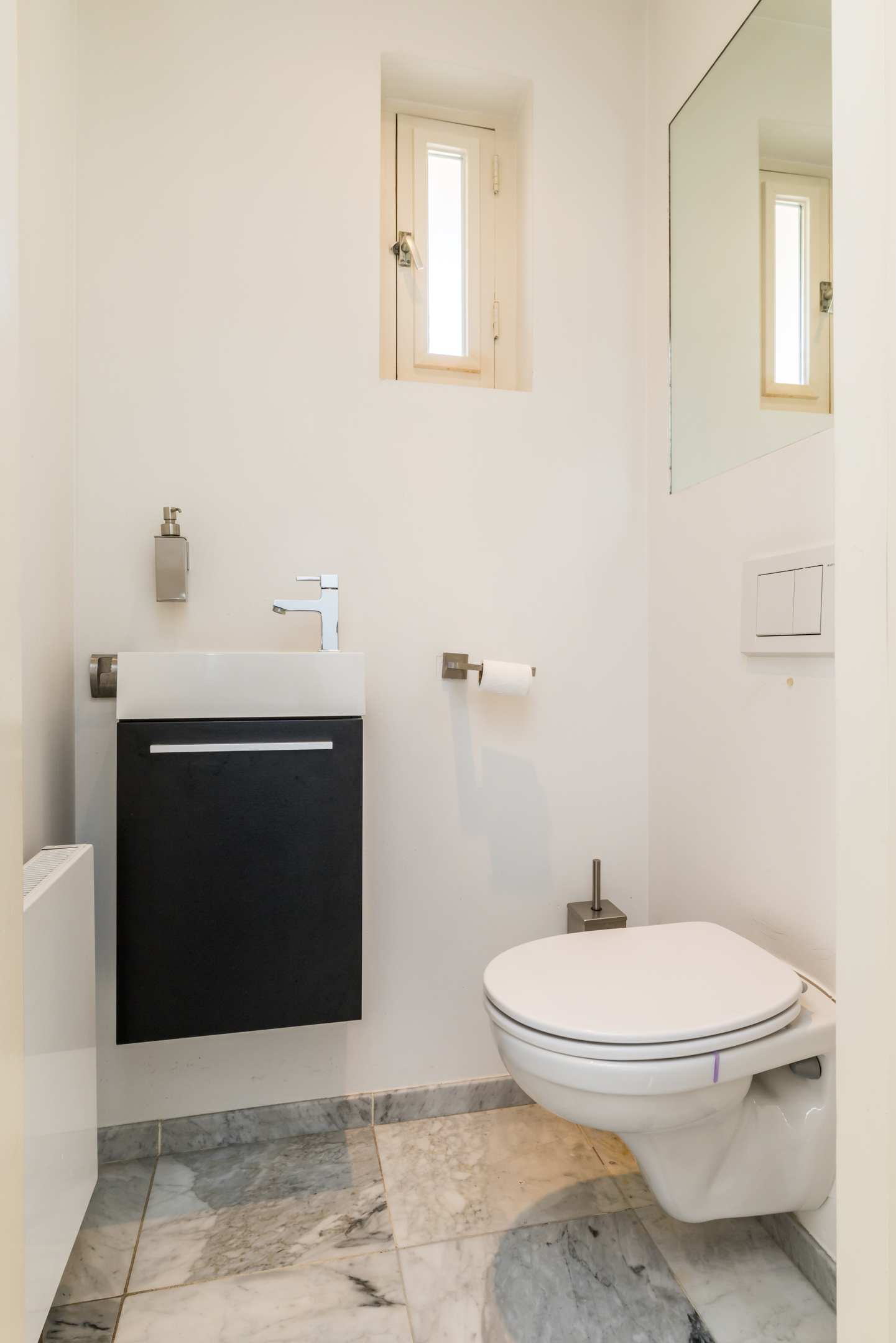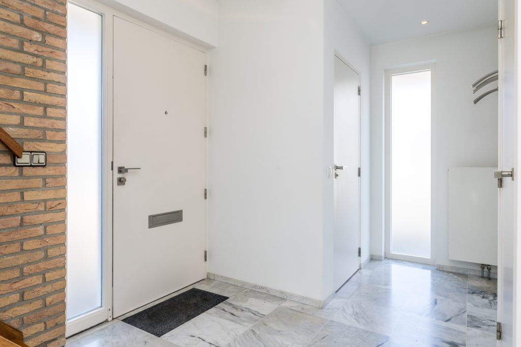 De ruime hal met meterkast, garderobenis en trapopgang naar de verdieping geeft toegang tot de toiletruimte welke is voorzien van een zwevend closet en fonteintje, en via een glazendeur tot de leefruimten.