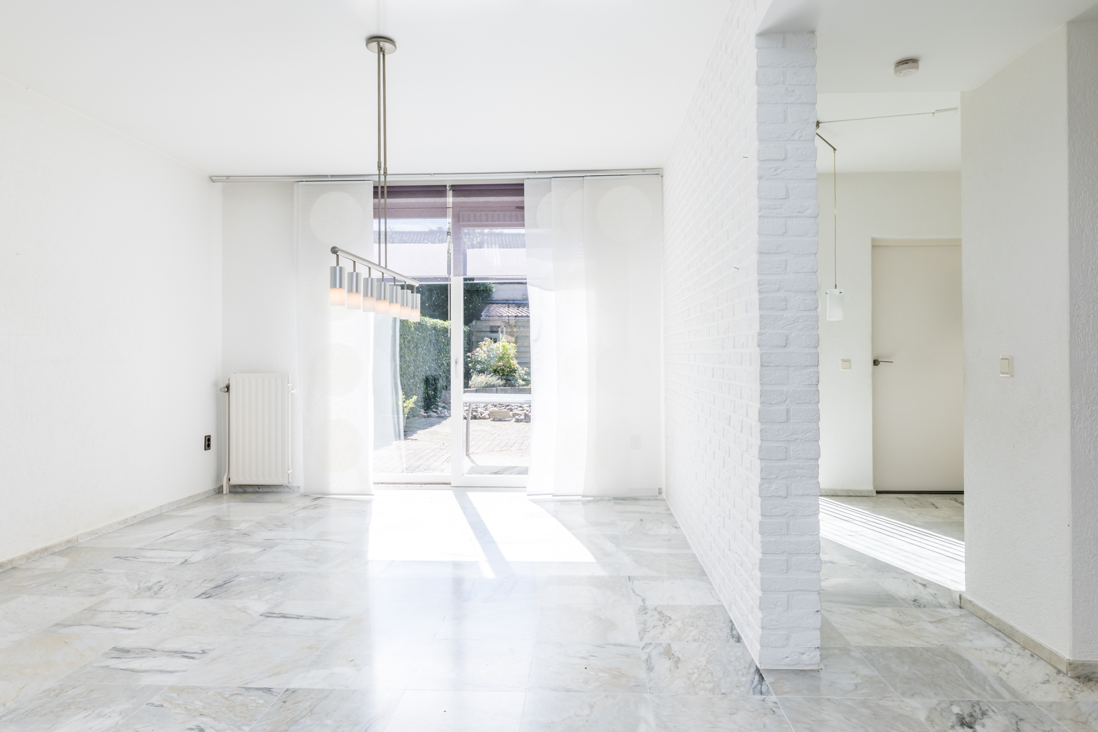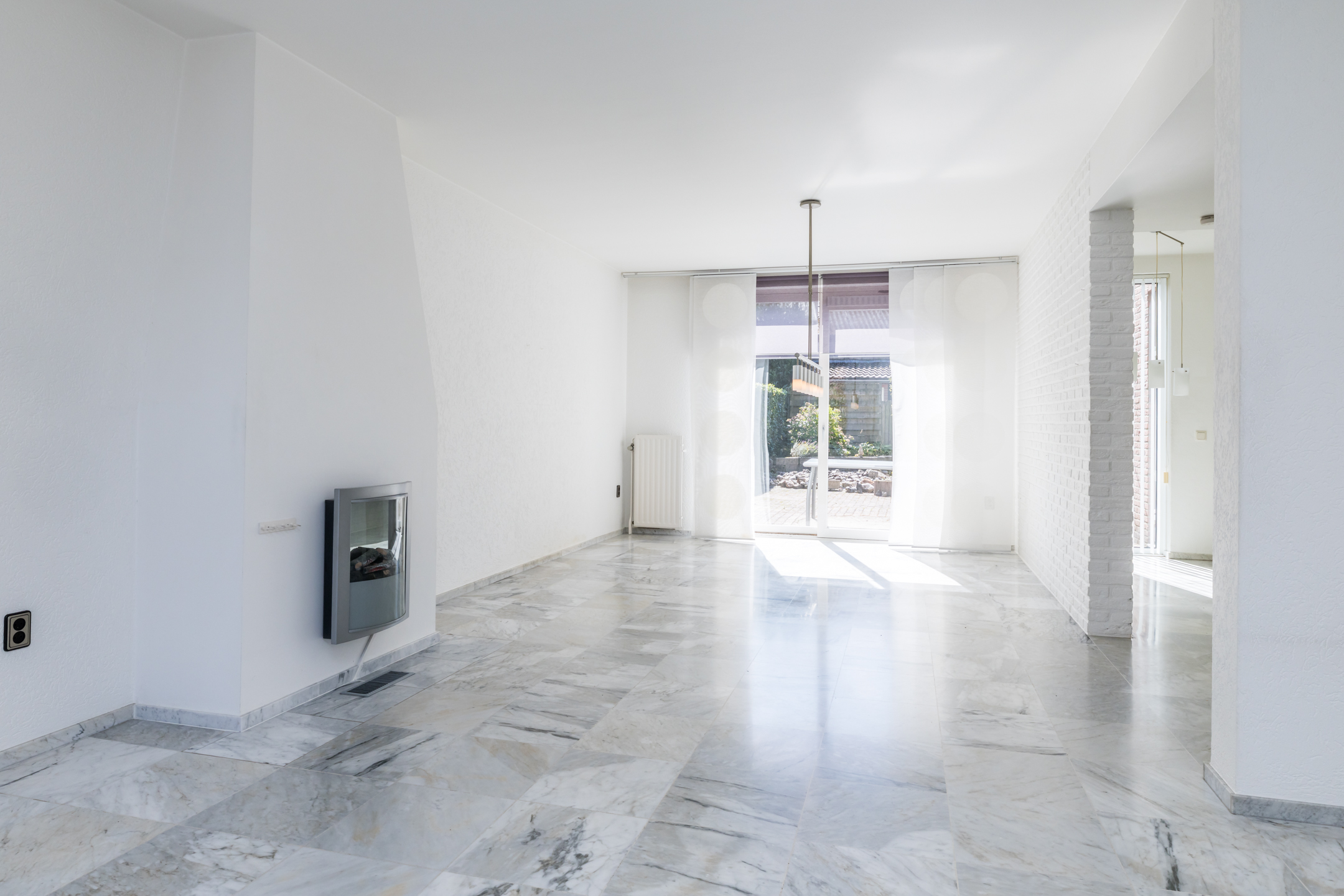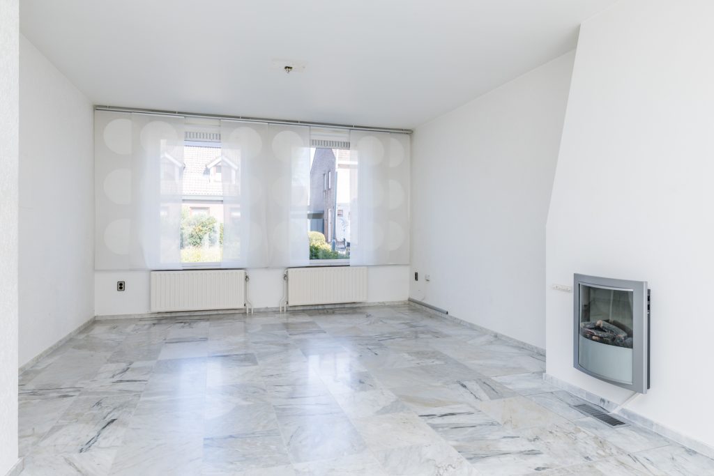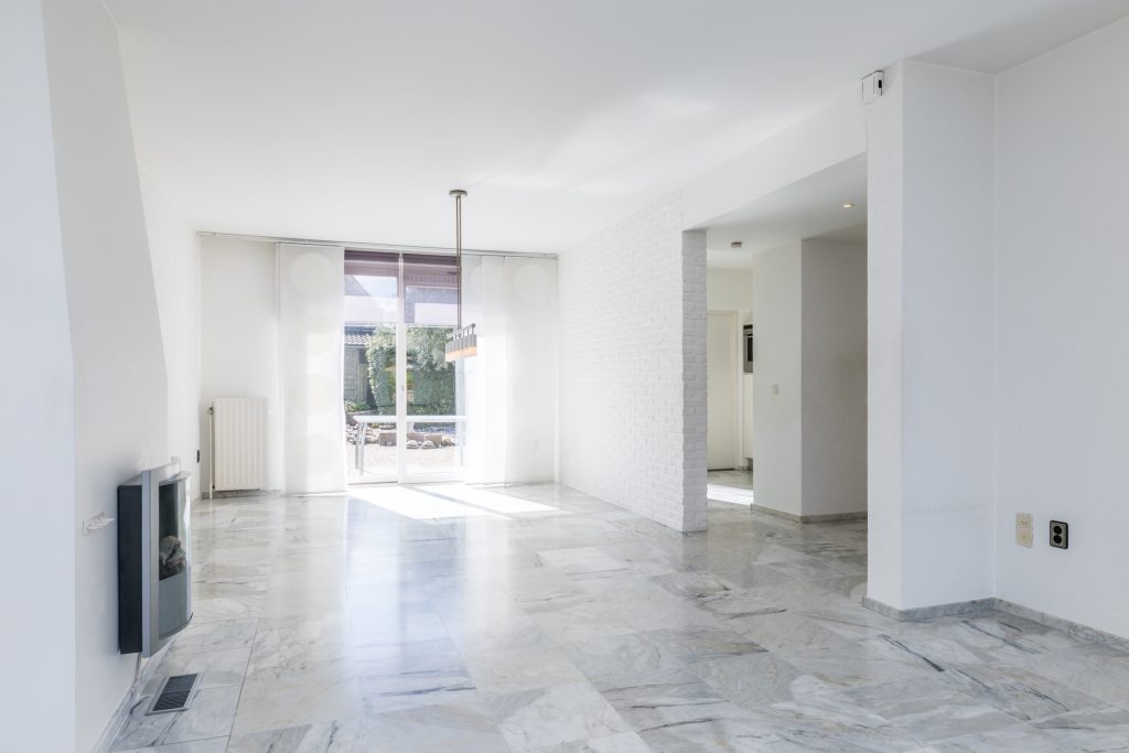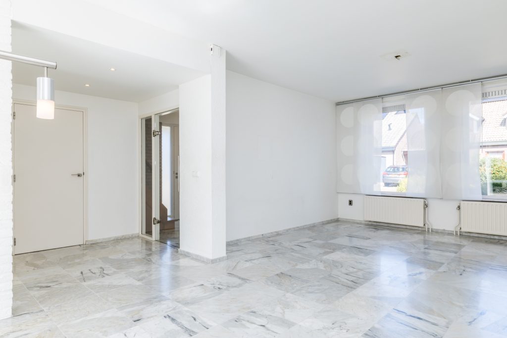 De royale leefruimte (circa 50 m²) is verdeeld in een woonkamer, eetkamer en gesloten keuken. Dankzij de lichte tegelvloer en de grote raampartijen aan zowel de voor- als achterzijde geniet de ruimte van een aangename lichtinval. Een centraal geplaatste elektrische haard zorgt voor extra sfeer. Via de schuifpui aan de achterzijde is er direct toegang tot de tuin.