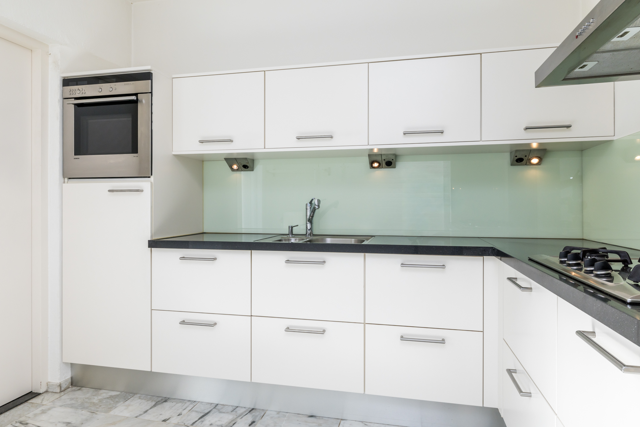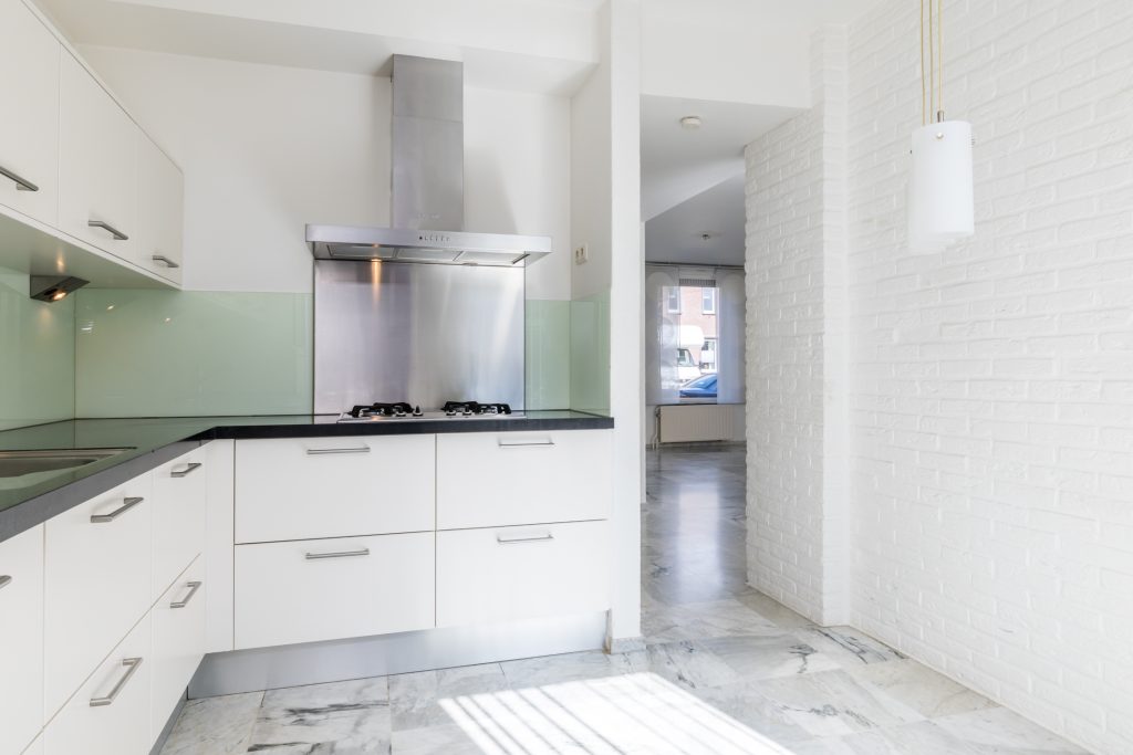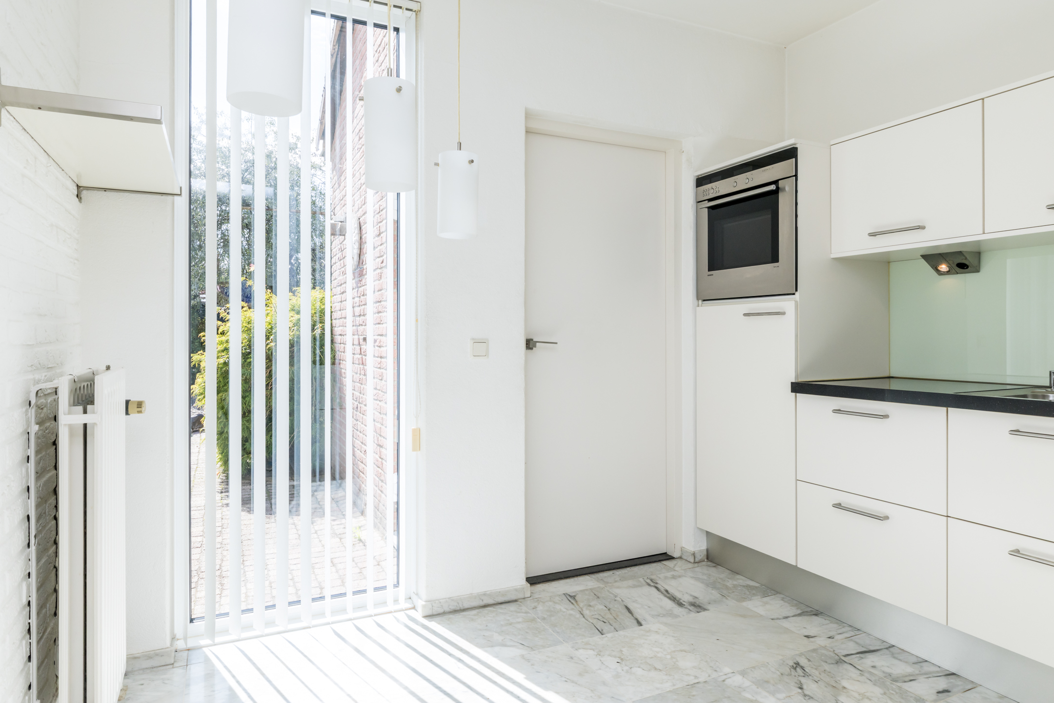 De keuken is uitgevoerd in een witte hoekopstelling met composieten werkblad en uitgerust met de volgende inbouwapparatuur: combi-oven/magnetron, koelkast, vaatwasser, 4-pits gasfornuis met afzuiging en gootsteen. Aansluitend bevindt zich de praktische bijkeuken met was-droogaansluiting en een keukenblok voorzien van gootsteen. Vanuit de bijkeuken zijn zowel de achtertuin als de garage bereikbaar.