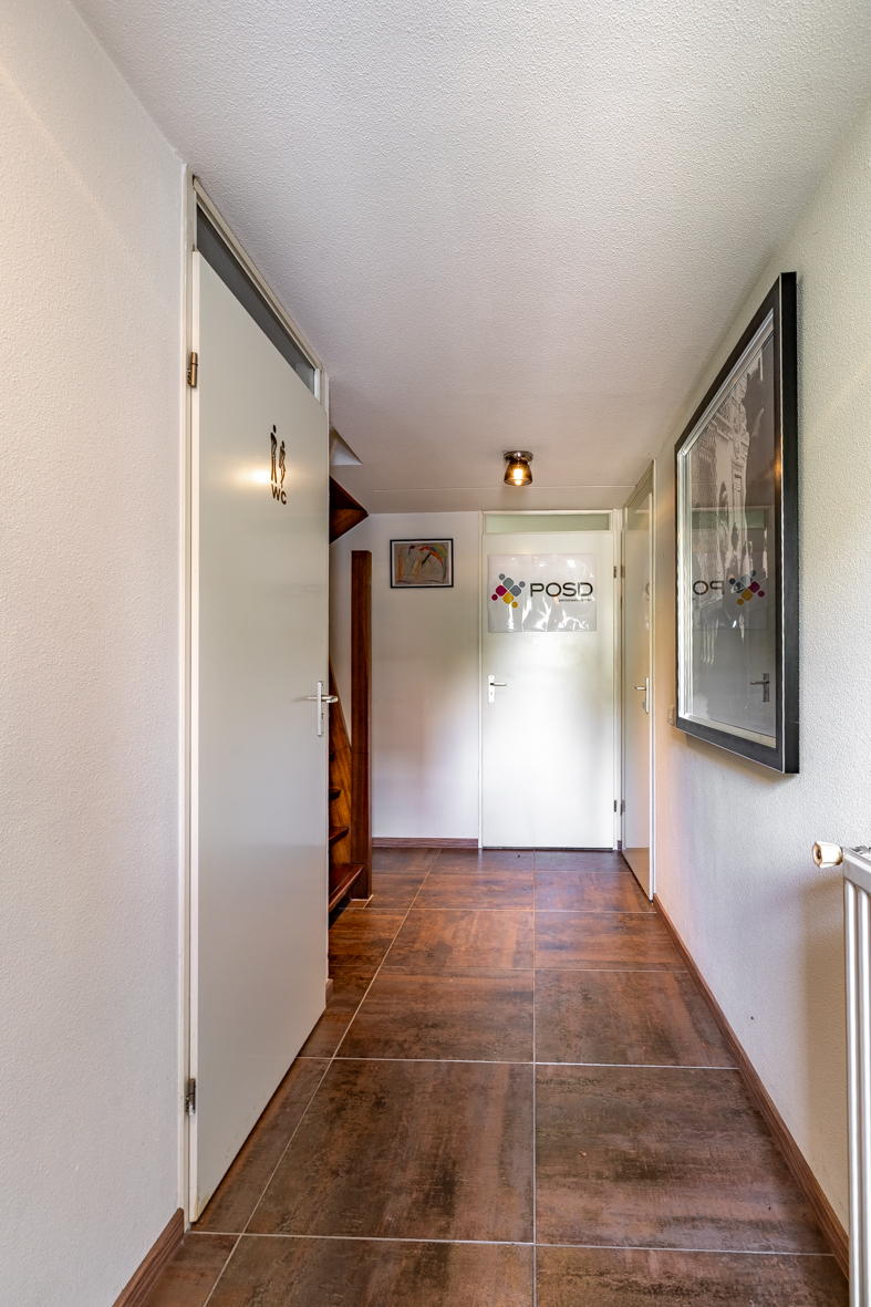 Parkeren van meerdere voertuigen kan op de eigen oprit, waarna u via de overdekte entree de woning betreedt. De entree/hal is voorzien van een nette tegelvloer en biedt toegang tot de garderobenis, meterkast en toiletruimte met fonteintje. Daarnaast is de garage van ca. 15 m² te bereiken, welke voorzien is van openslaande poortdeuren. Eveneens zijn er een bergruimte en 2 werkkamers te bereiken vanuit de hal van respectievelijk 5 m², 6m² en 13 m². Deze ruimtes zijn ideaal voor de uitvoering van een kantoor of praktijk aan huis.