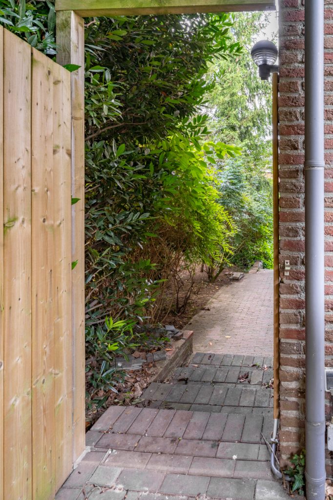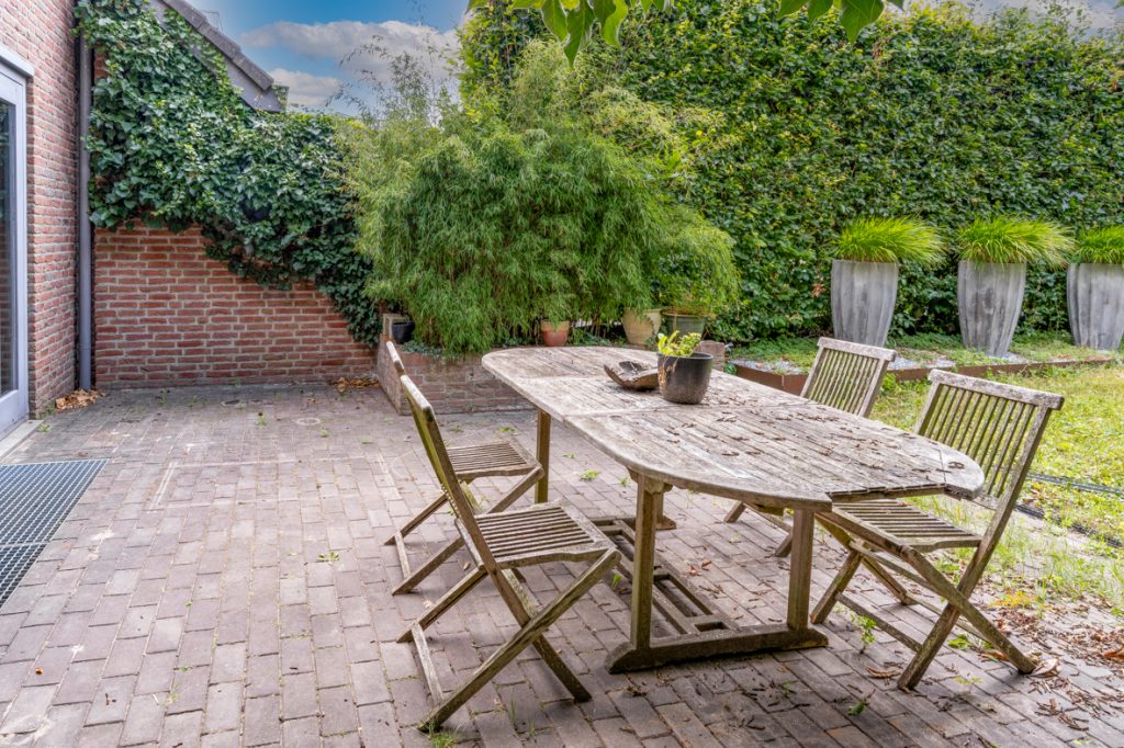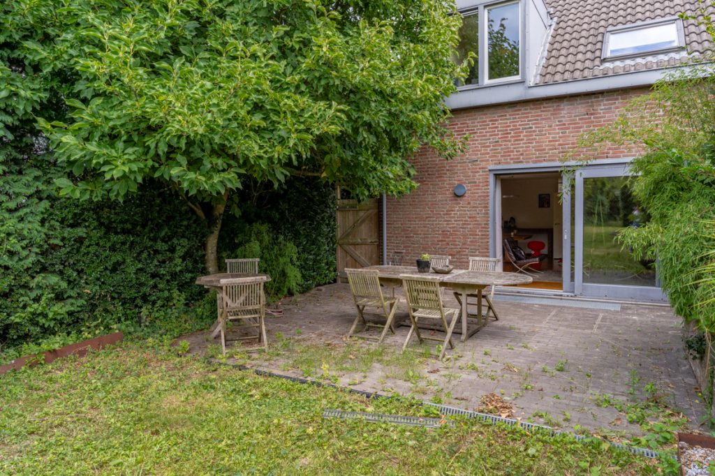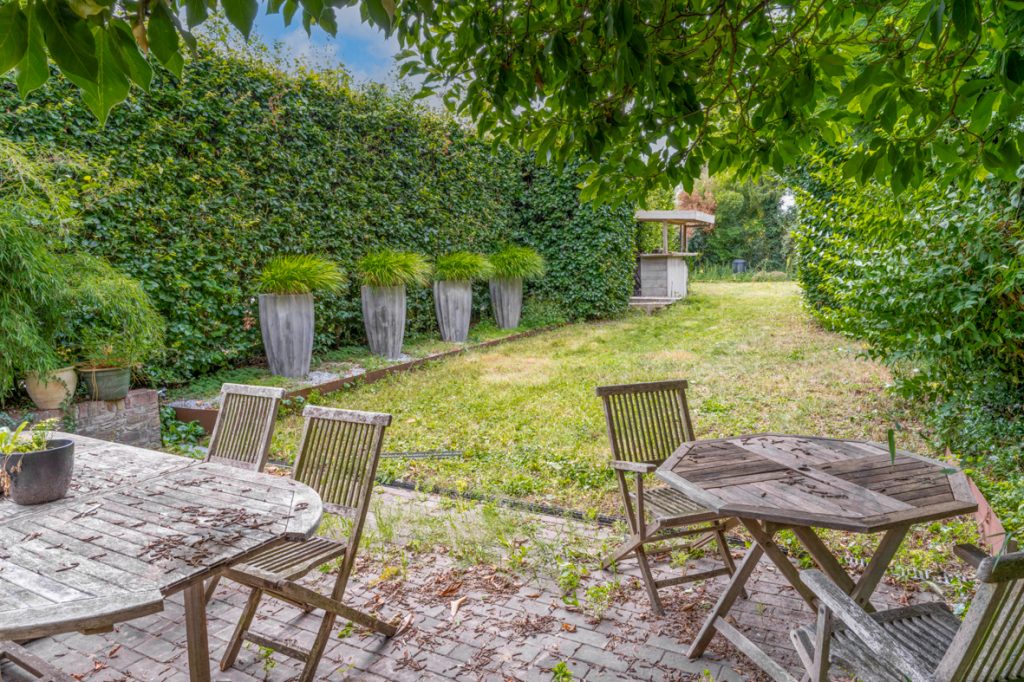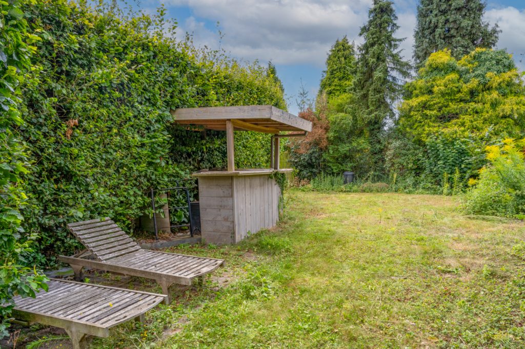 De op het Zuiden gelegen diepe achtertuin biedt veel privacy en voorziet in een terras met toegang tot de oprit. Het gazon is ingericht met een buitendouche en een bar voor de gezellige zomeravonden.