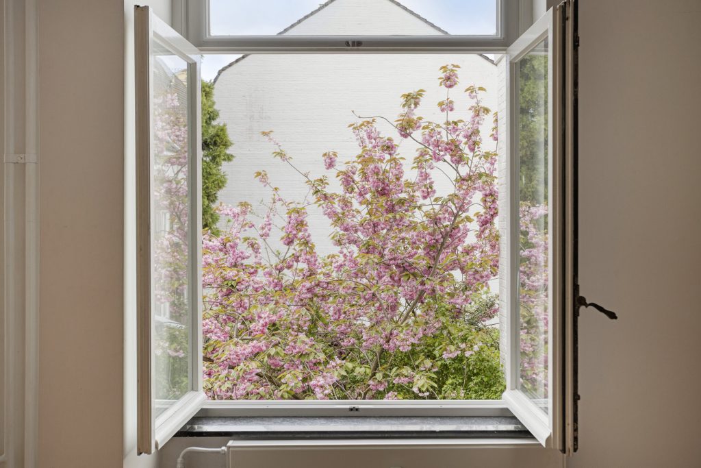 Aan de achterzijde van de woning bevindt zich de royale leefruimte van circa 45 m². Deze sfeervolle ruimte wordt gekenmerkt door twee fraaie schouwen en biedt een mooi uitzicht op een bloesemboom en een stadstuin.