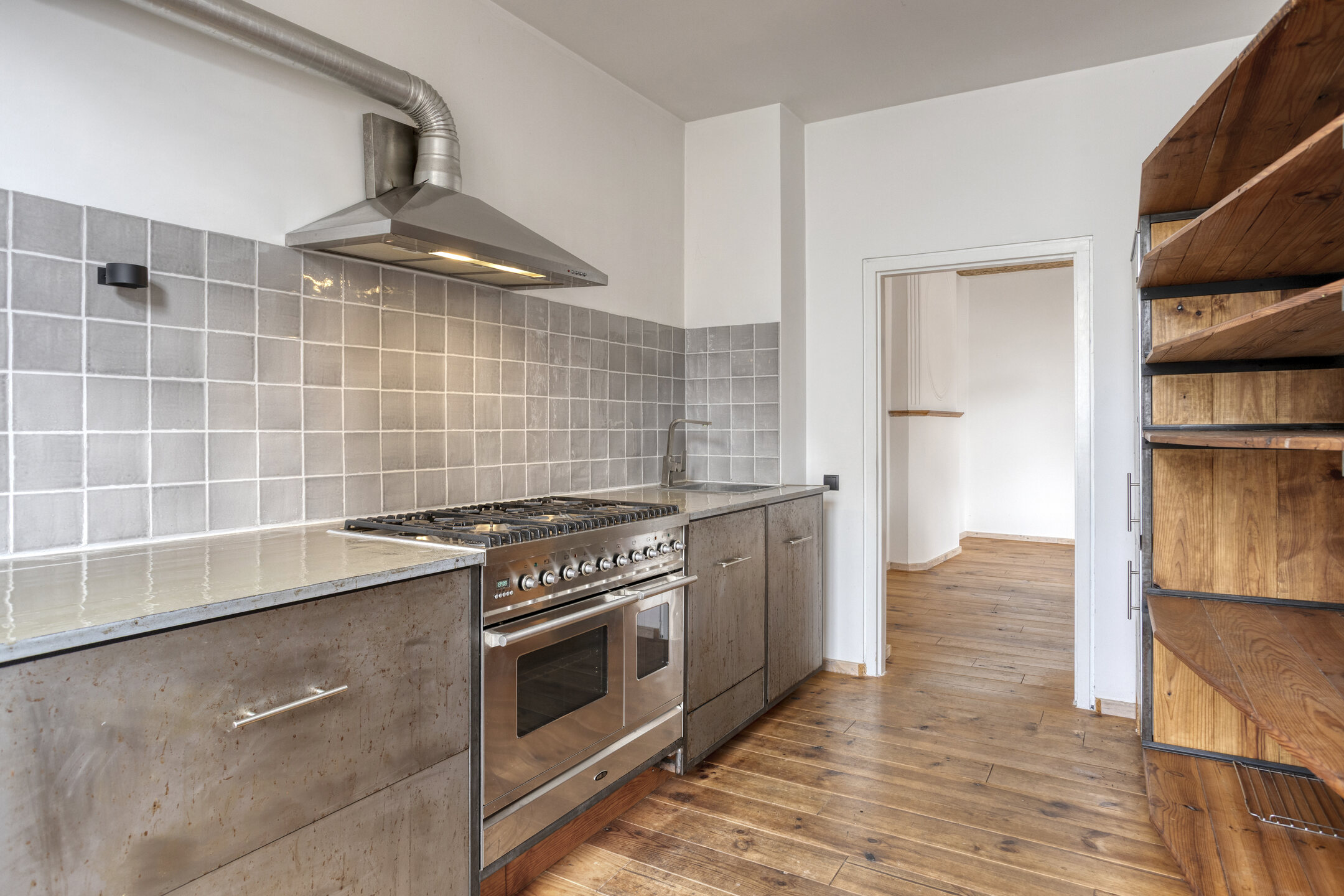 Aansluitend ligt de keuken, uitgevoerd in een industriële stijl en voorzien van een 6-pits gasfornuis met dubbele oven van Boretti, afzuigkap, vaatwasser en een koelkast met vriesvakken.
