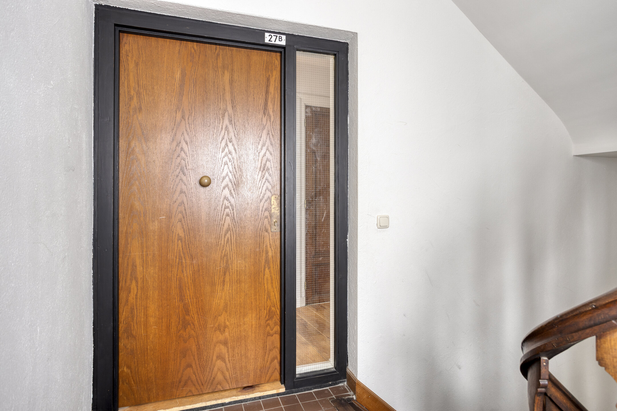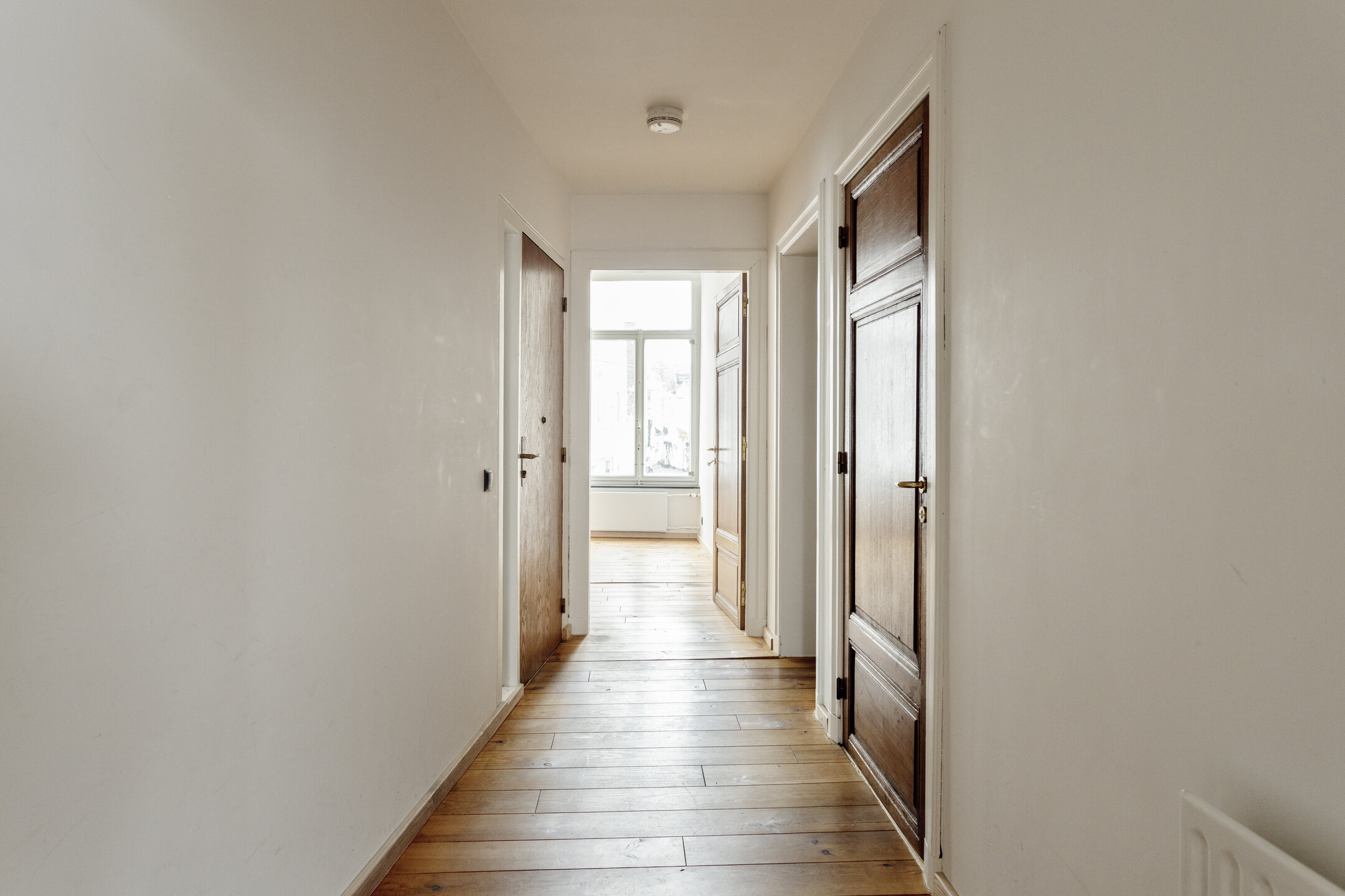 Via de trap bereik je de eerste verdieping van dit kleinschalige complex. De voordeur van het appartement opent naar een hal die toegang biedt tot alle vertrekken.