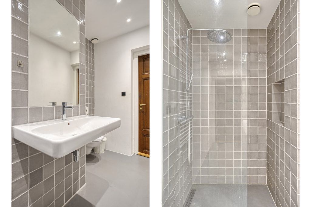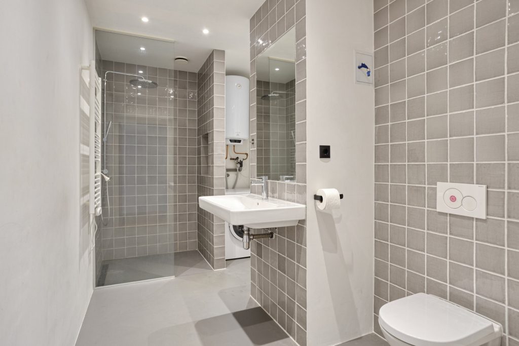Aan de voorzijde van het appartement zijn twee ruime slaapkamers gesitueerd van respectievelijk circa 17 m² en 20 m². Centraal in de woning bevindt zich de moderne badkamer, uitgerust met een toilet, zwevende wastafel, inloopdouche, witgoedaansluiting en een boiler voor de warmwatervoorziening.