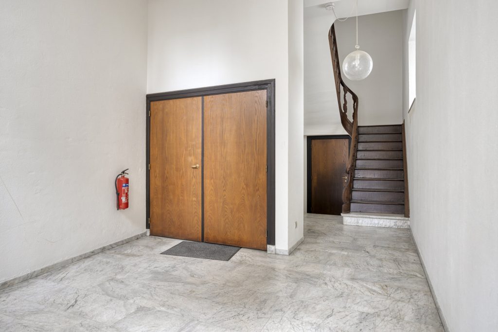 Bij binnenkomst op de begane grond tref je een verzorgde en ruime centrale hal. Hier bevinden zich de brievenbussen en meterkasten, evenals de toegang tot de ondergelegen kelder, waar het appartement beschikt over een eigen berging.