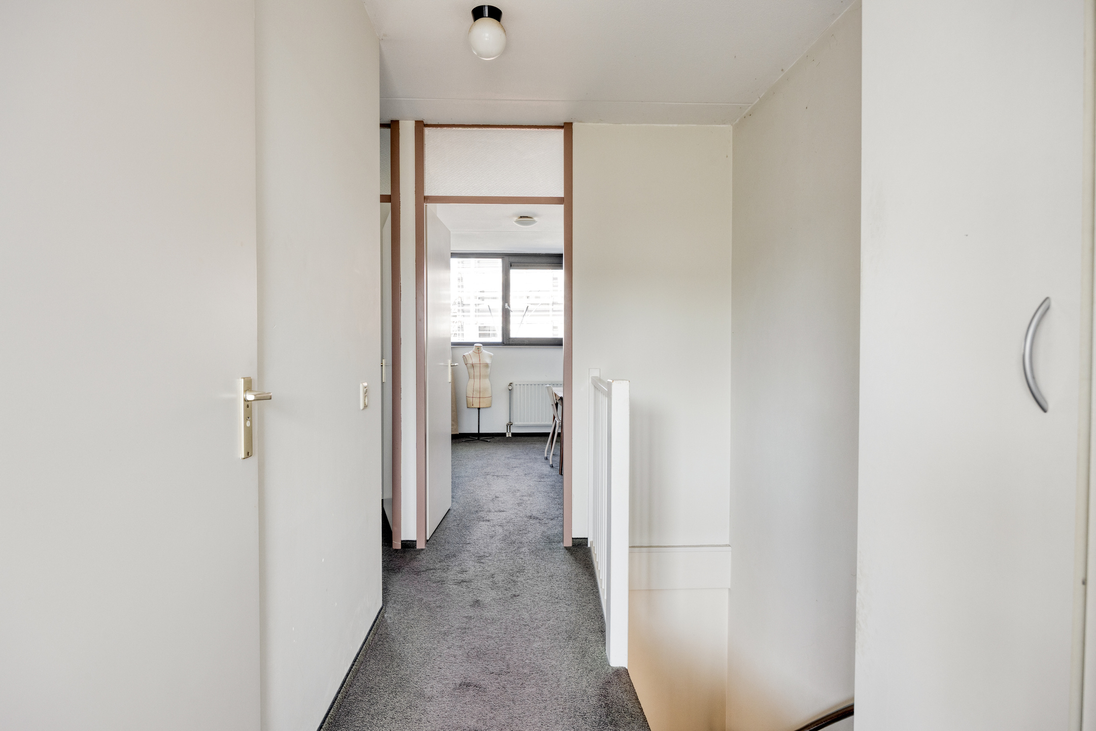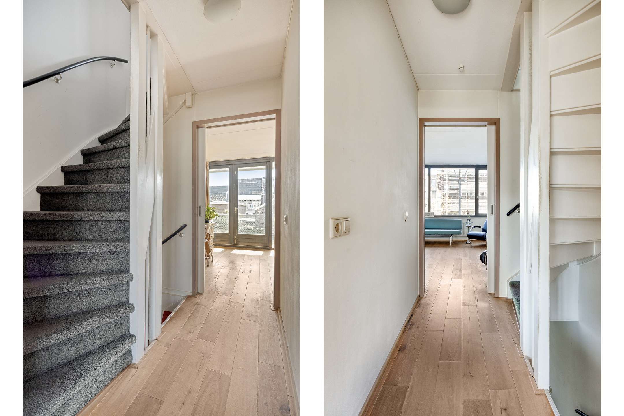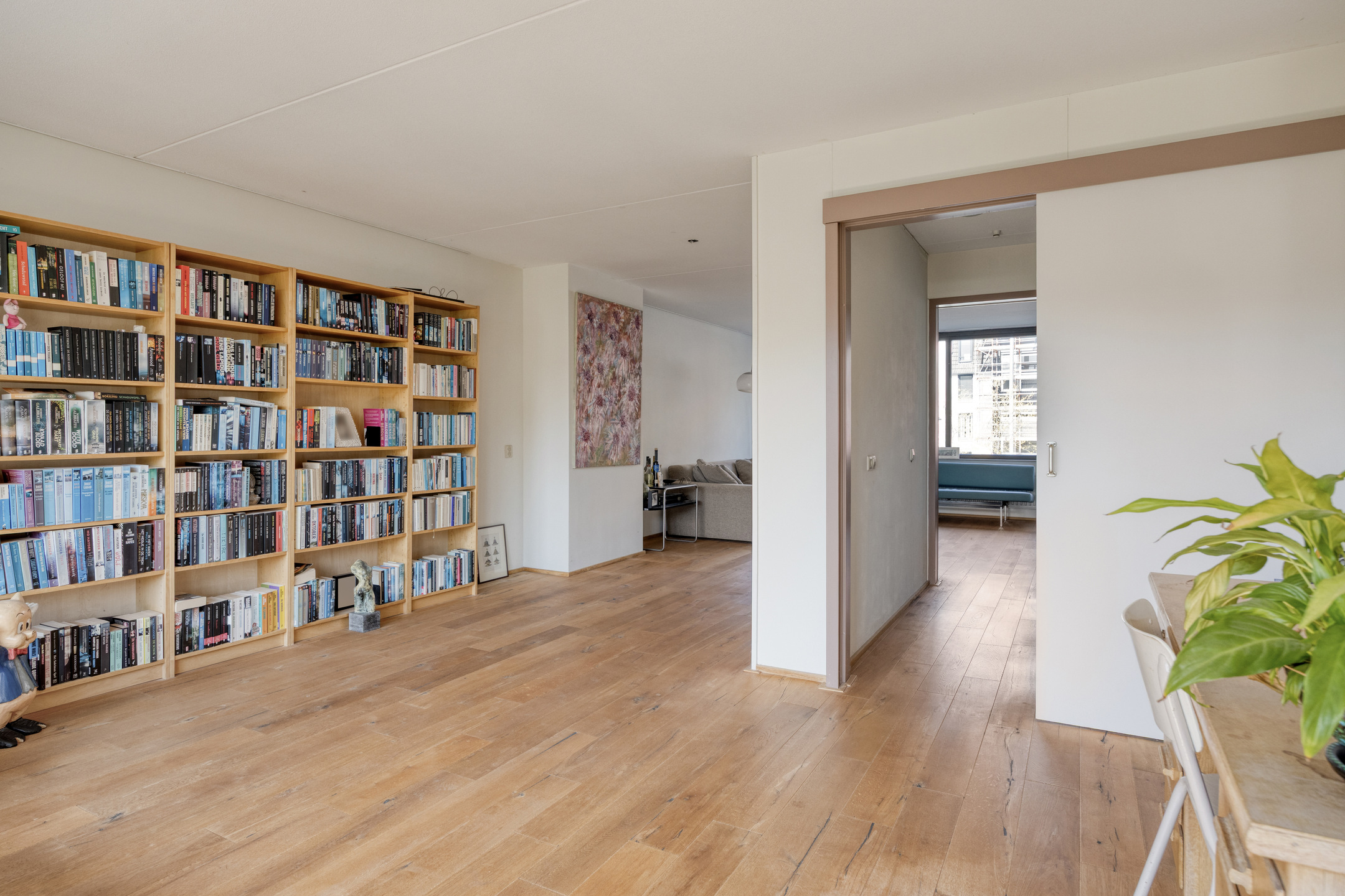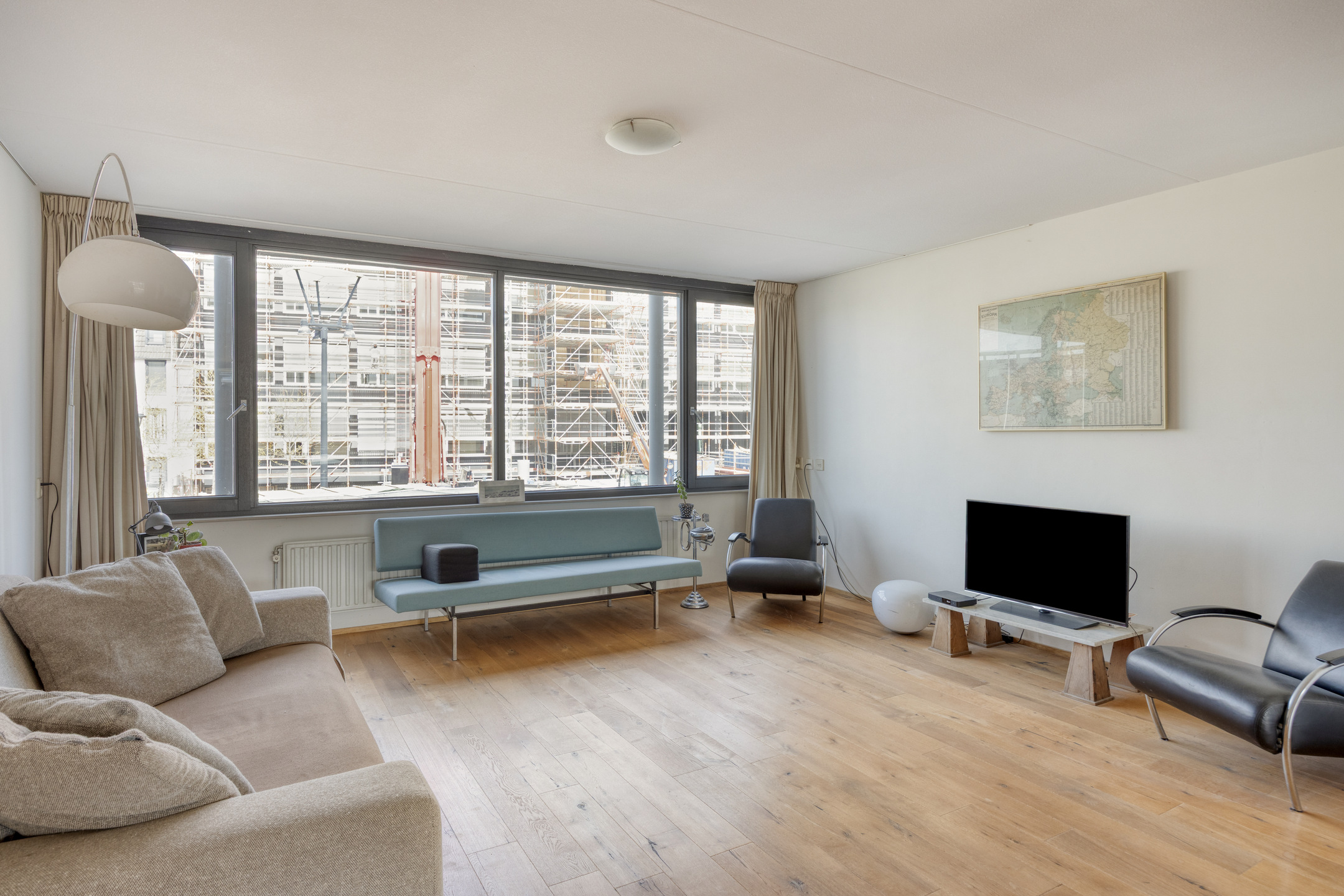 De woonkamer beslaat de volledige eerste verdieping en biedt een riante, lichte leefruimte van ca. 47m². Het royale balkon van 11m² over de gehele breedte van de woning maakt het mogelijk om hier in de zon te genieten of een plekje buiten te creëren met uitzicht over de stad.
