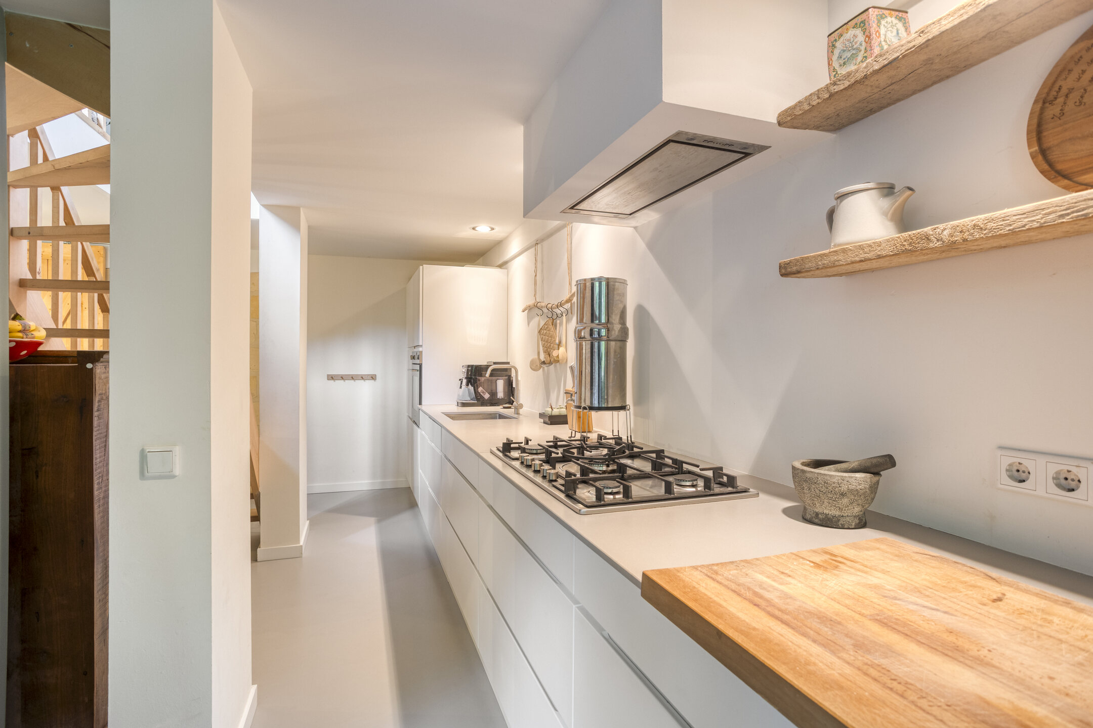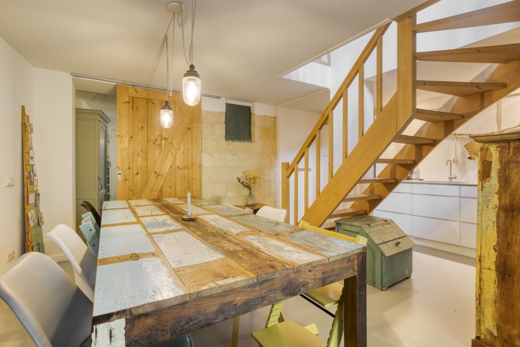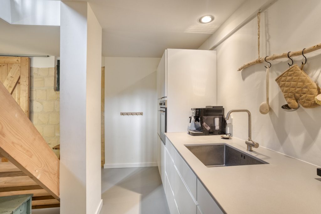 De stijlvolle en tijdloze keuken complimenteert de landelijke stijl van de mergelmuur met houten loftdeur, een mooie combinatie.