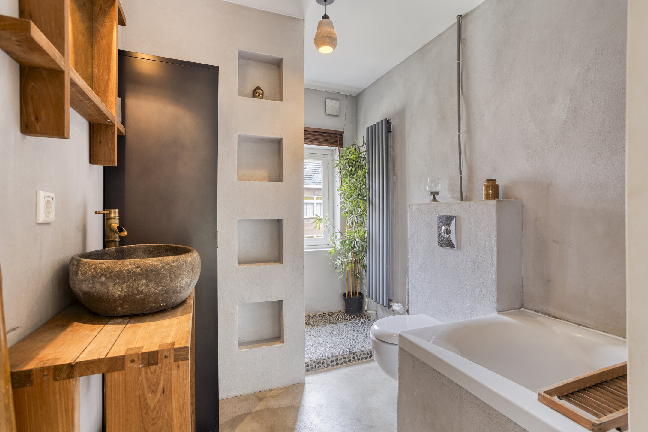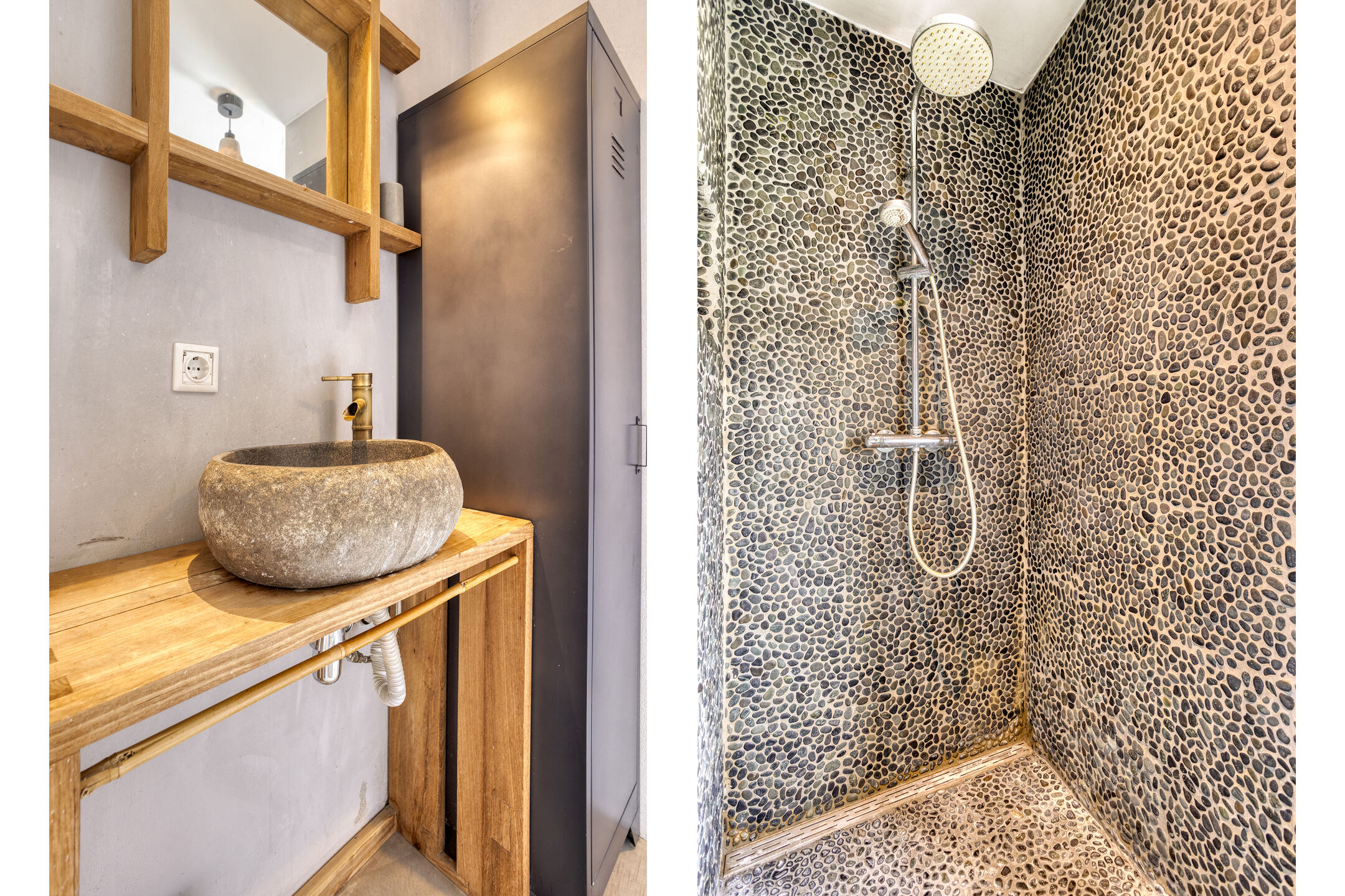 De houten trap leidt naar de eerste verdieping, waar u beschikking heeft over twee ruime slaapkamers van 12 en 15m² en de badkamer. De natuurstenen wastafel, de pebble stone vloer en wand in de inloopdouche in combinatie met de ecologische kalkverfwandafwerking in beton ciré look zorgen voor een mediterrane sfeer waardoor u zich elke ochtend in vakantiesferen waant.