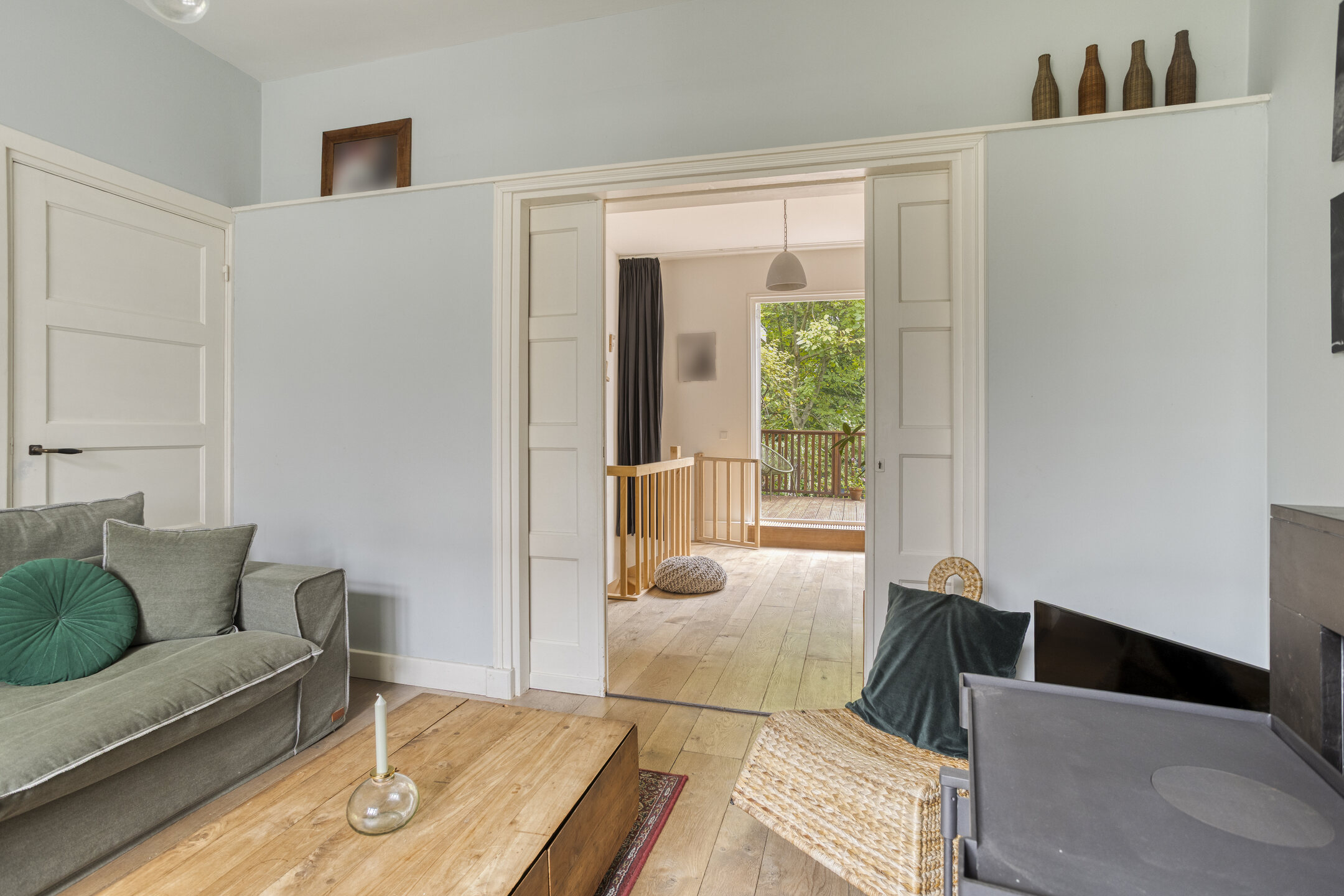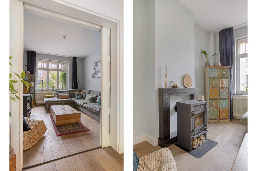 U komt binnen in de lange hal met terrazzo vloer en toegang tot de overige vertrekken. Aan de voorzijde is er een sfeervolle woonkamer met kachel en ensuite deuren naar de achterkamer welke weer toegang geeft tot het terras met uitzicht op de tuin.