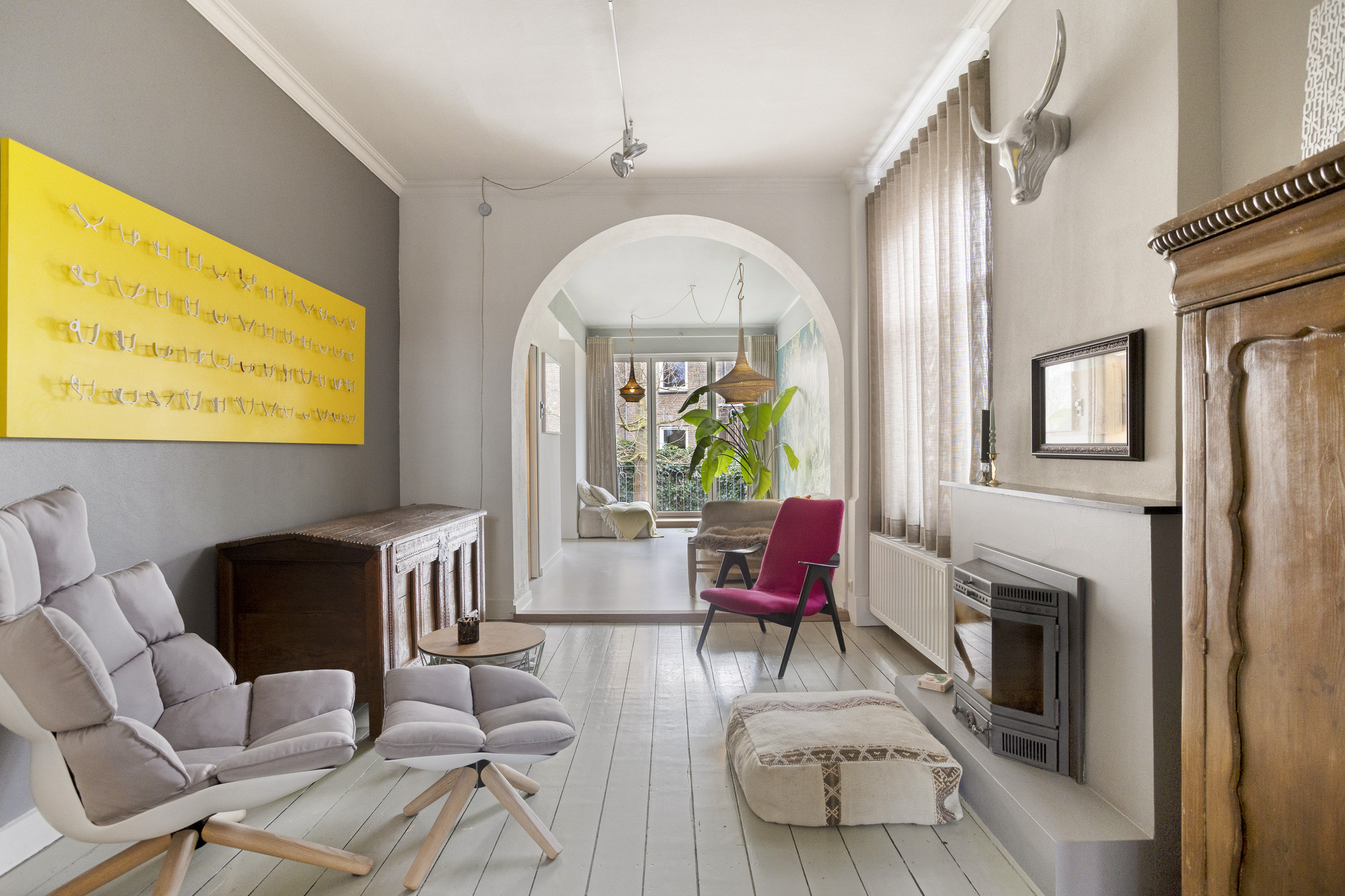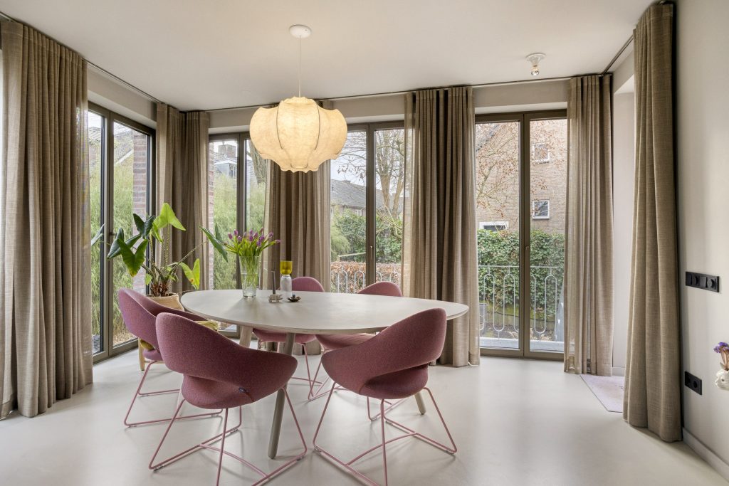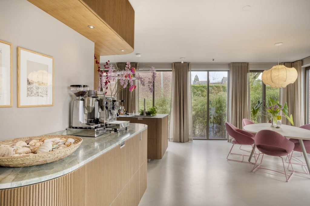 Ook de koffiecorner is met zorg samengesteld: het blad is uitgevoerd in een prachtig licht zeegroene kwartsiet, wat een fraai contrast vormt met het warme walnoothout.In het oorspronkelijke woningdeel bevindt zich de speels ingedeelde woonkamer, verdeeld in meerdere zithoeken. Hierdoor is er op elk moment van de dag een fijne plek om te ontspannen. Zo kunt u zich terugtrekken bij de knusse houthaard in het middengedeelte, of juist kiezen voor extra privacy door de en-suite deuren van de voorkamer te sluiten. Aan de achterzijde geniet u van een prachtig groen uitzicht op de tuin via de harmonicadeuren, die bovendien grenzen aan het balkon, hier voelt buiten als binnen.