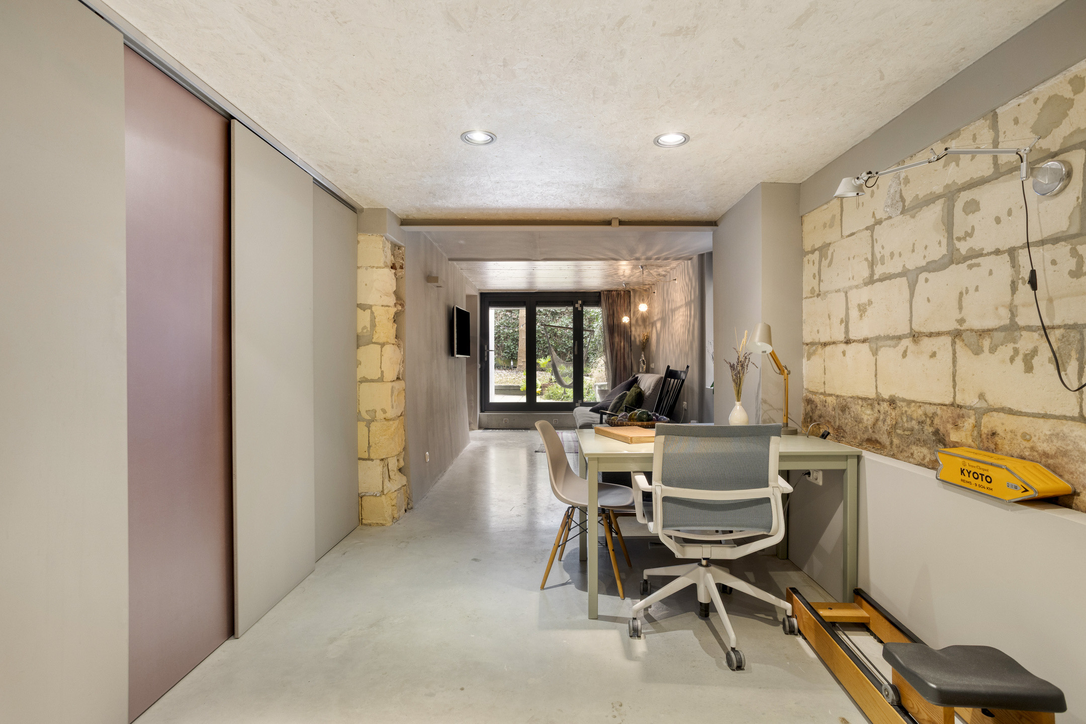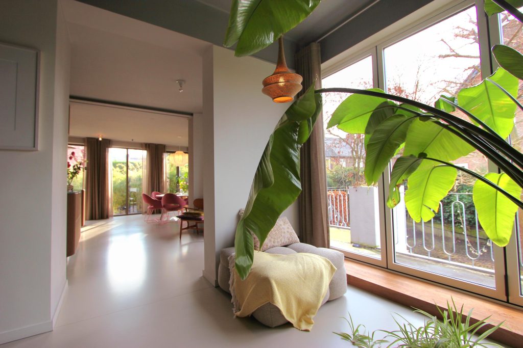 Achter een naadloos binnendeursysteem is in de woonkamer een praktische werkplek gerealiseerd. Eenzelfde systeem biedt toegang tot zowel een toilet én een garderobekast in de hal wat bijdraagt aan de strakke afwerking van de woning. Allen zijn naar ontwerp van architect Jo Janssen en uitgevoerd door een interieurbouwer.