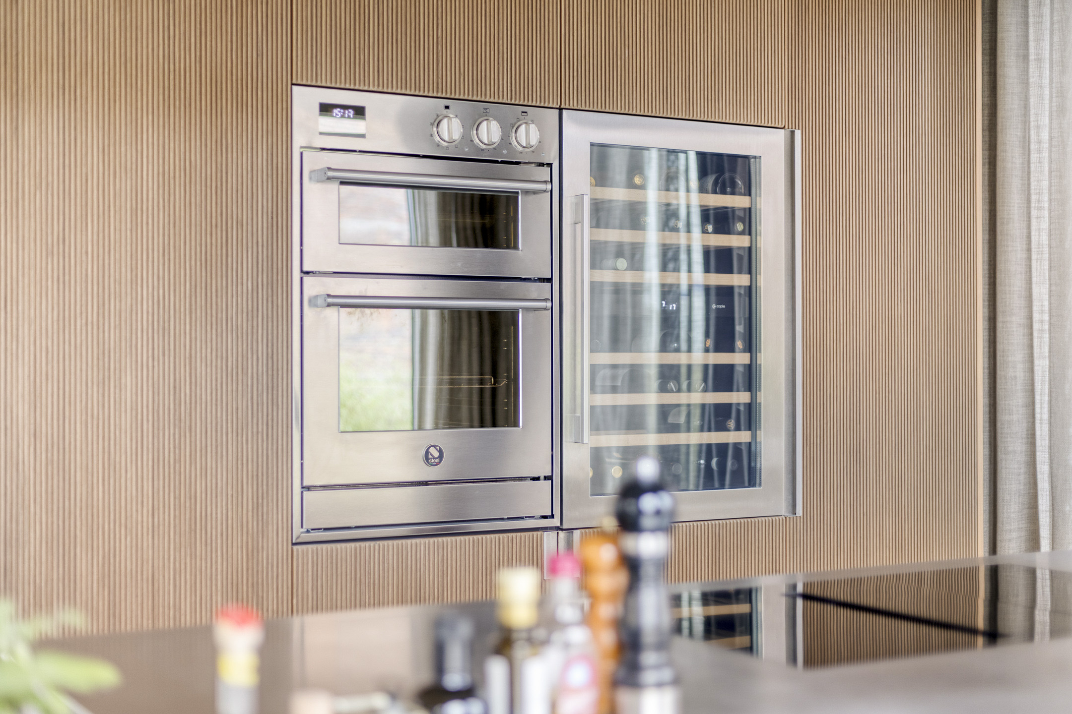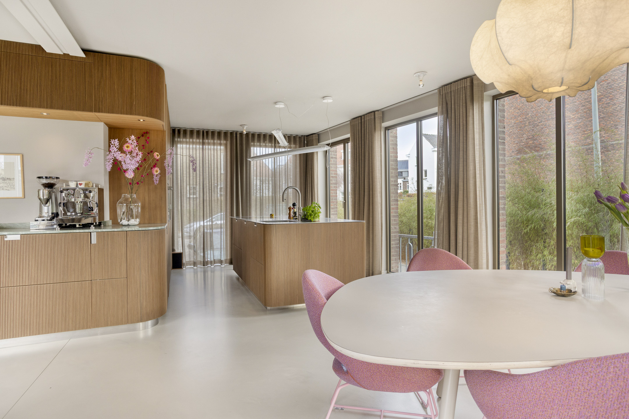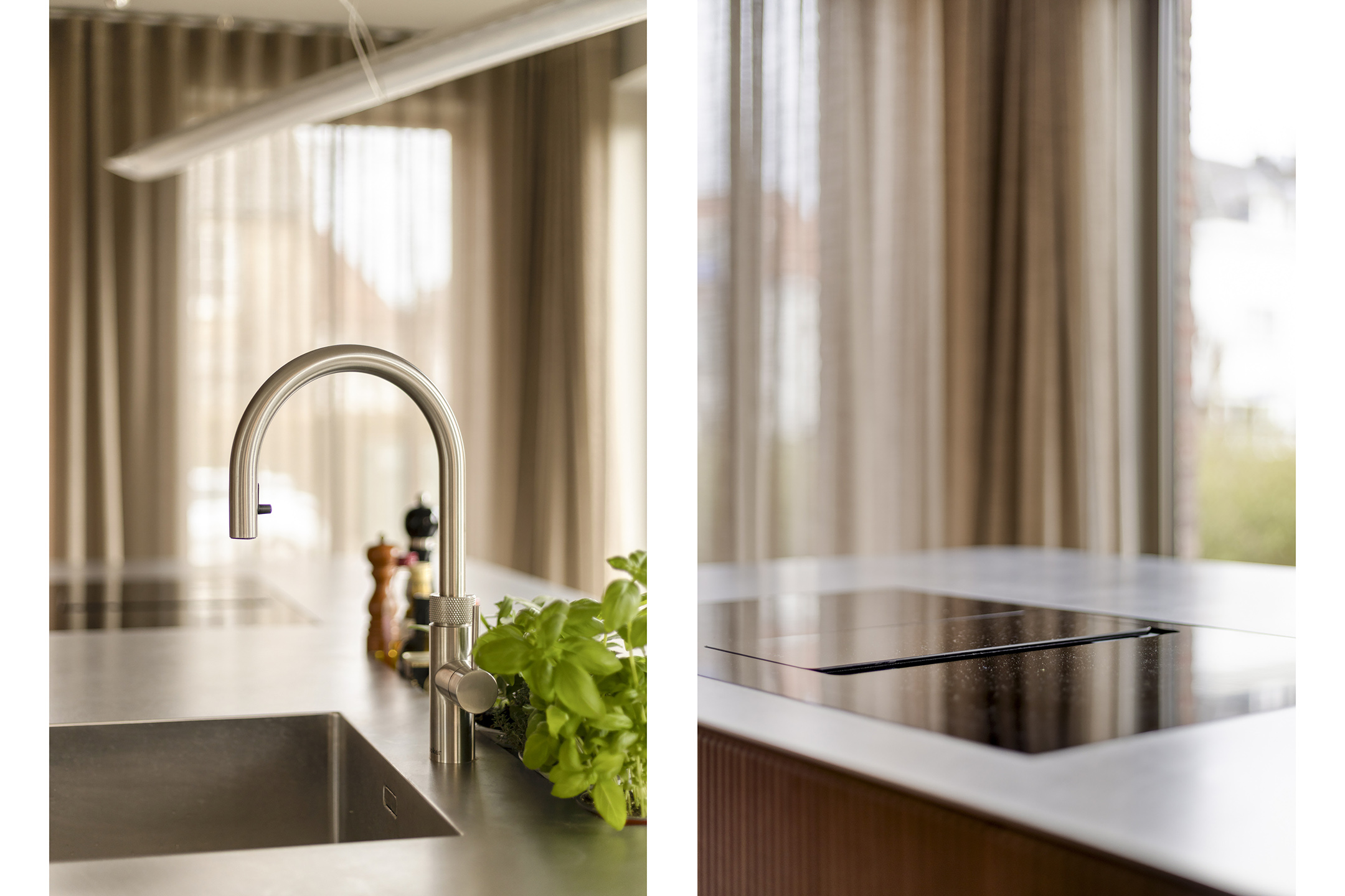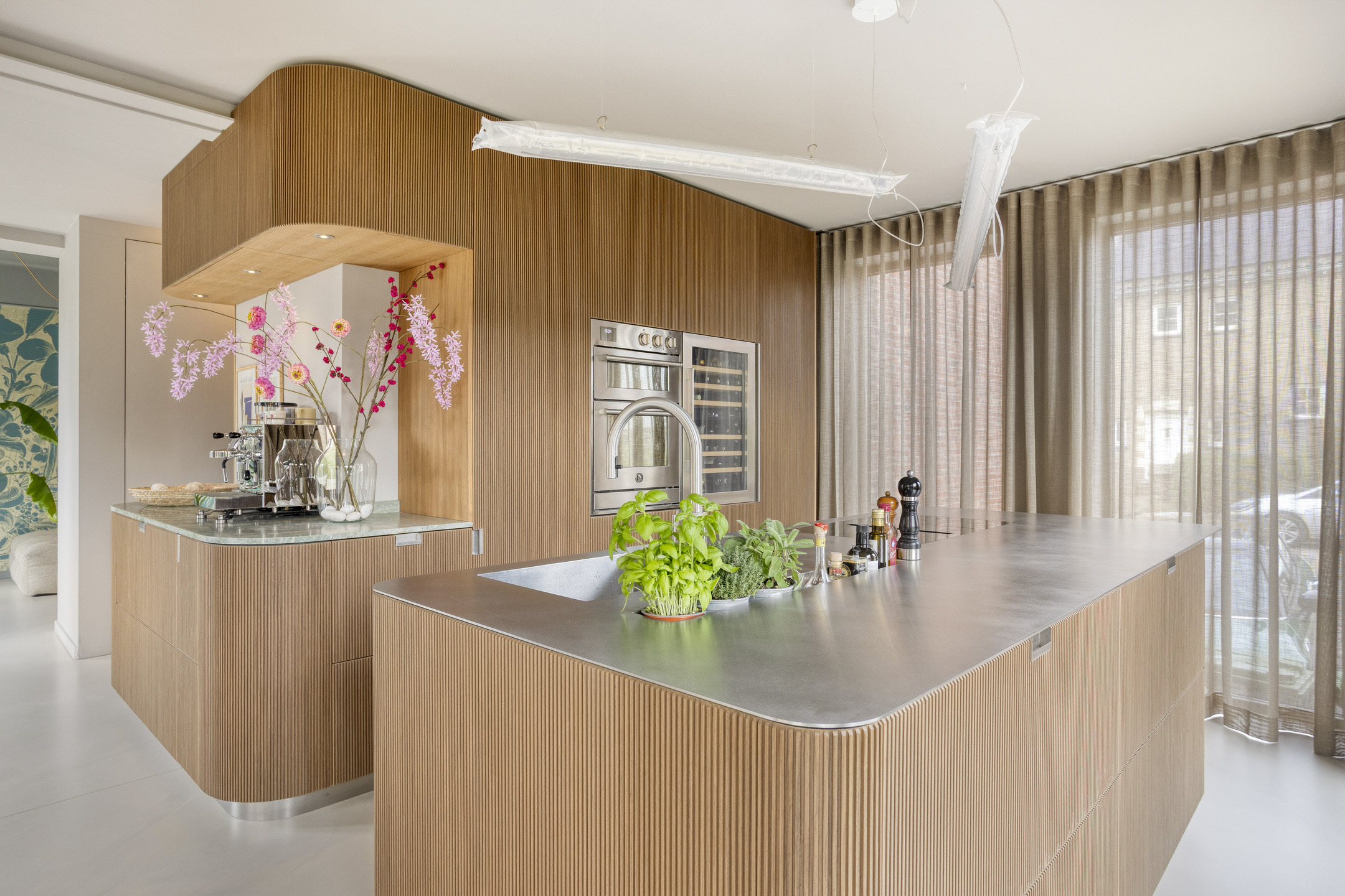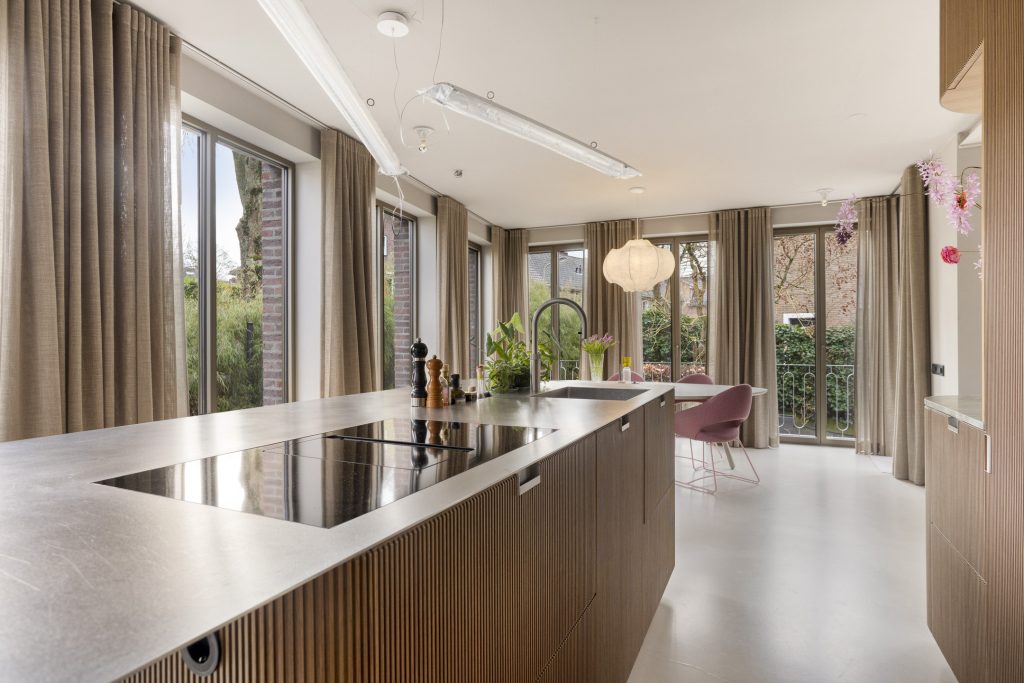 De keuken uit 2023 is tot in detail afgewerkt en uitgevoerd met afgeronde hoeken en een luxe kastafwerking van walnoothout, vervaardigd in Italië. Het kookeiland vormt een ware blikvanger: het werkblad is gemaakt van 4 mm dik, richtingloos geborsteld warmgewalst staal, voorzien van een verzonken kruidenbak. Een robuust en bijzonder materiaal dat tegen een stootje kan en tegelijk een zeer stijlvolle uitstraling heeft.