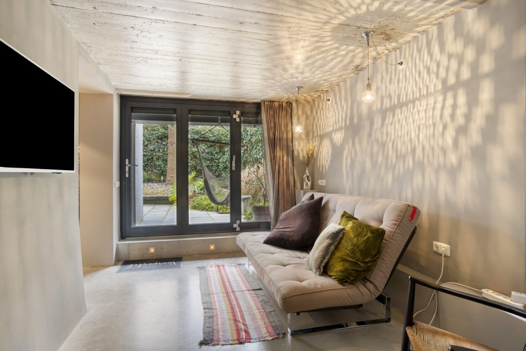 Aan het einde van de ruimte zorgen harmonicadeuren, net als op de parterre, niet alleen voor een heerlijk tuincontact, maar ook voor een opvallend prettige lichtinval. Hierdoor is dit souterrain uitermate geschikt voor diverse gebruiksdoeleinden, zoals een werkruimte, logeerkamer of zelfs een ruime slaapkamer (ideaal voor tienerkinderen). De aanwezigheid van een badkamer maakt het geheel extra comfortabel en compleet.