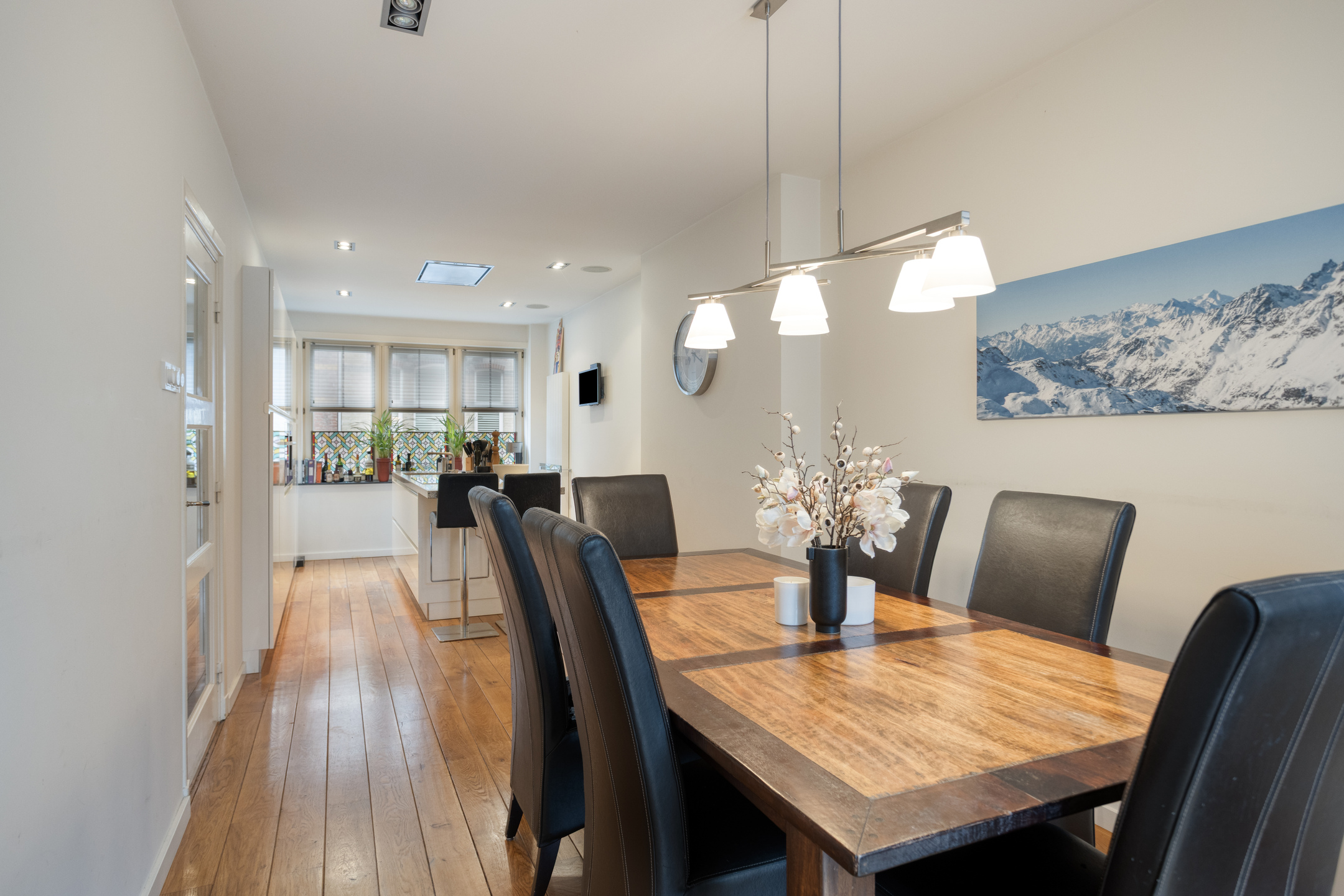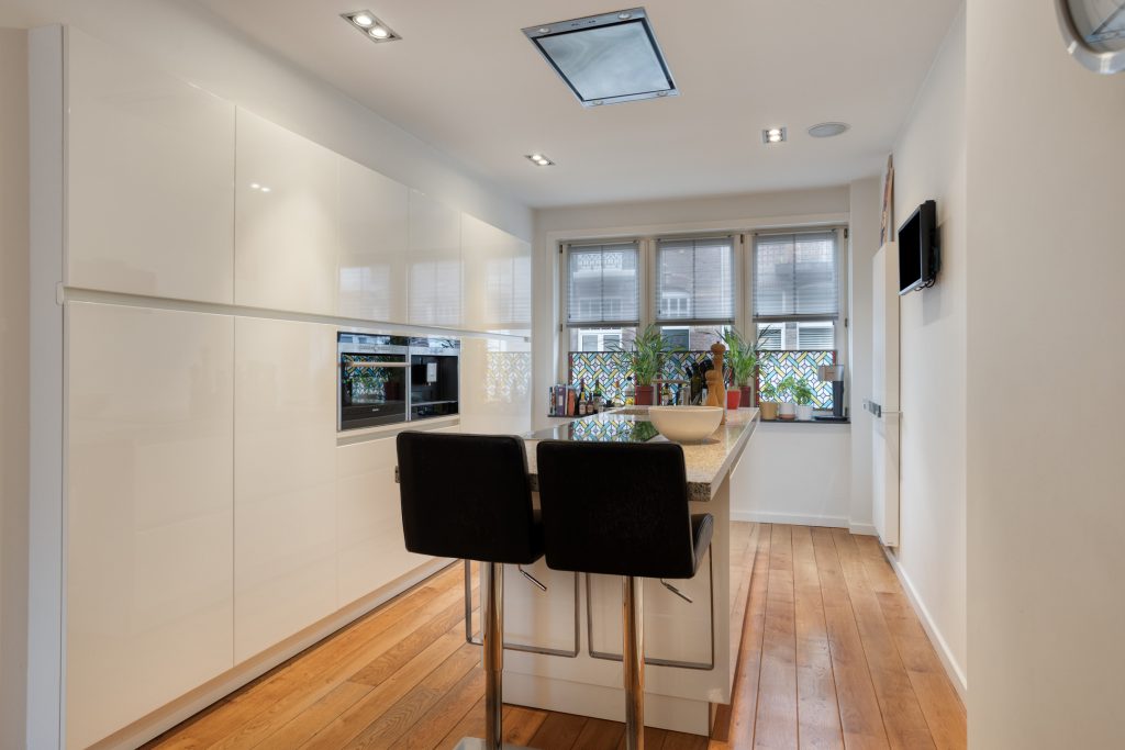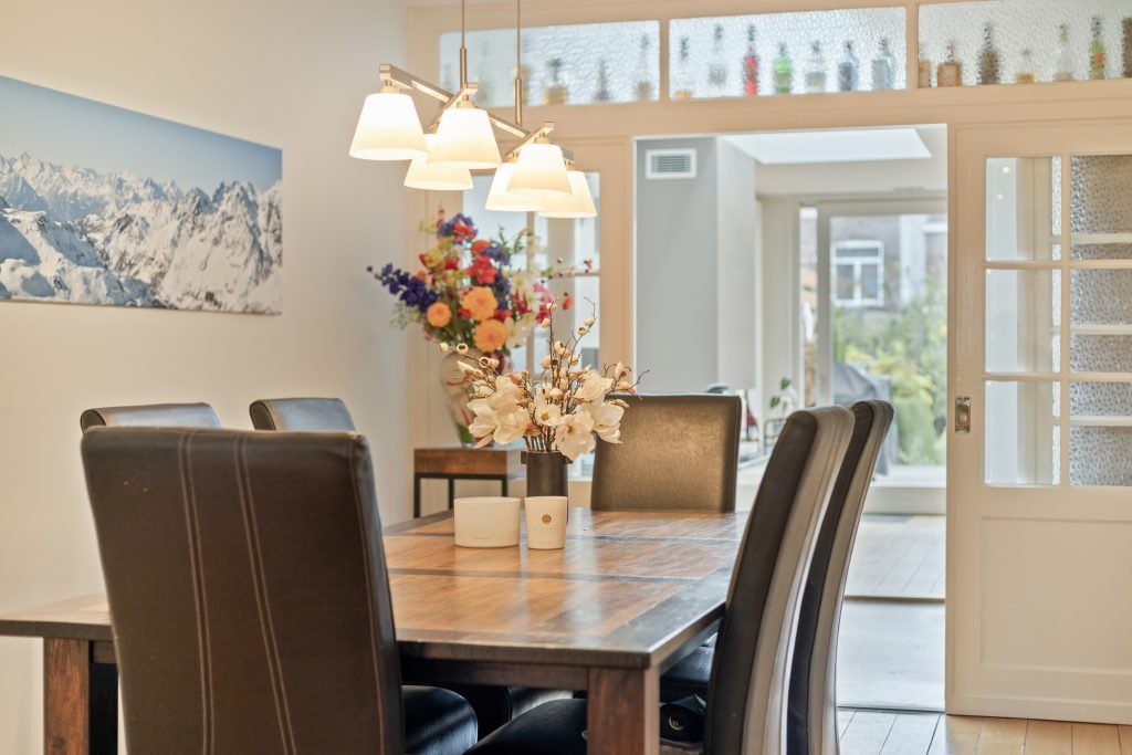 Vanuit de hal is de woonkamer en-suite met open keuken te bereiken. Wat u aan de buitenzijde niet verwacht is dat deze leefruimte maar liefst 16 meter diep is. Aan de voorzijde is de open keuken met kookeiland en modern inbouw apparatuur met ruim voldoende bergruimte. En suite deuren in de eetkamer geven toegang tot de zitkamer met werkplek en lichtstraat.
