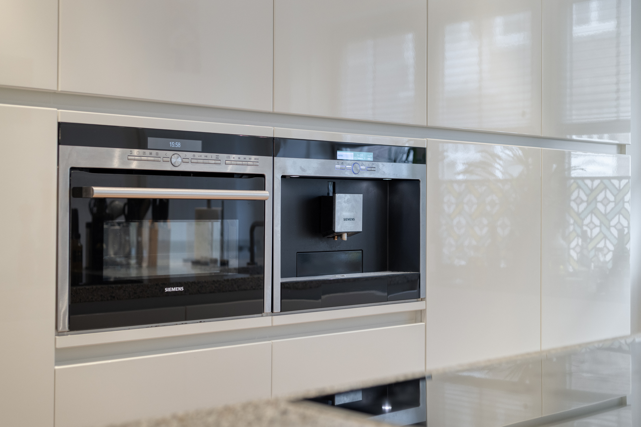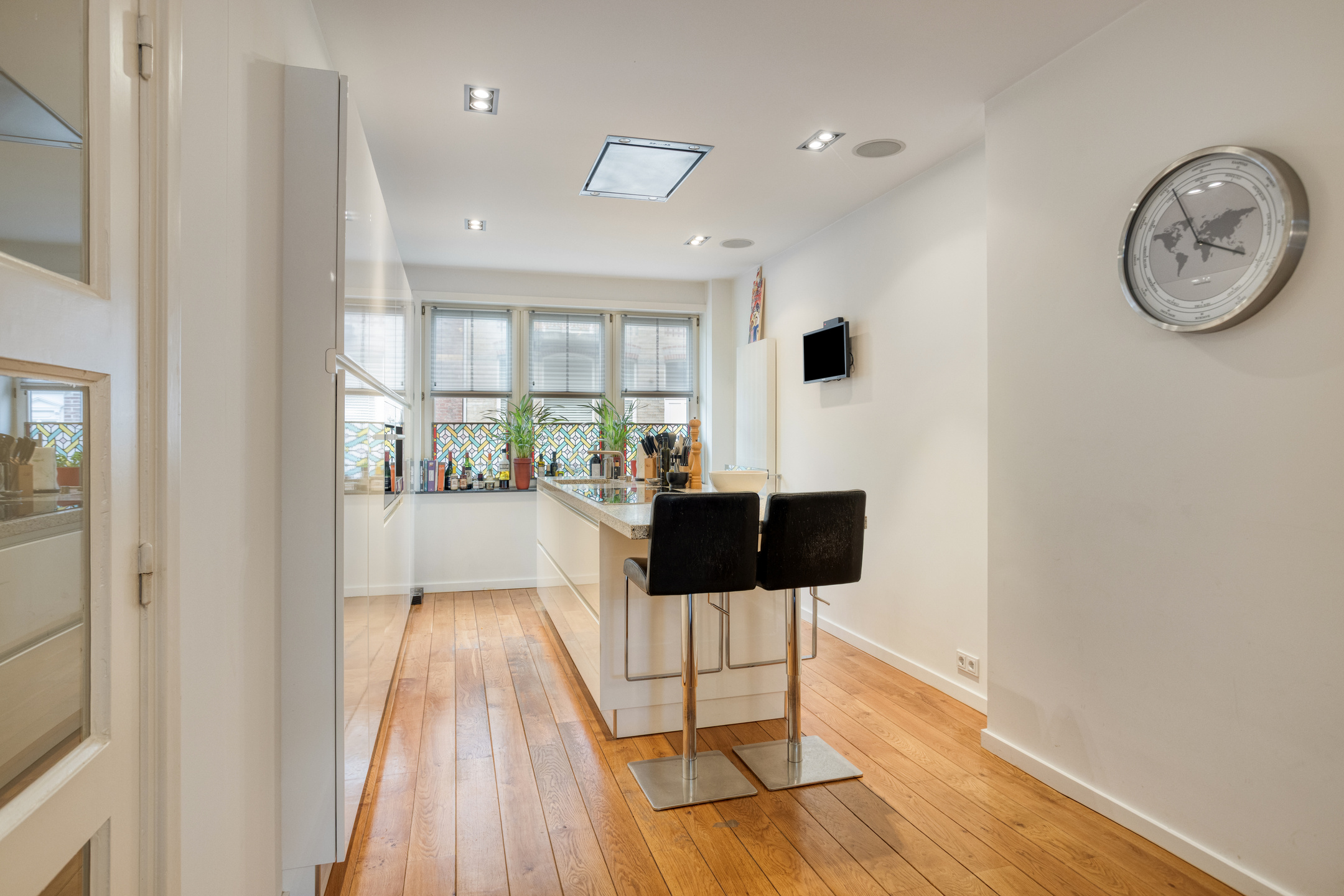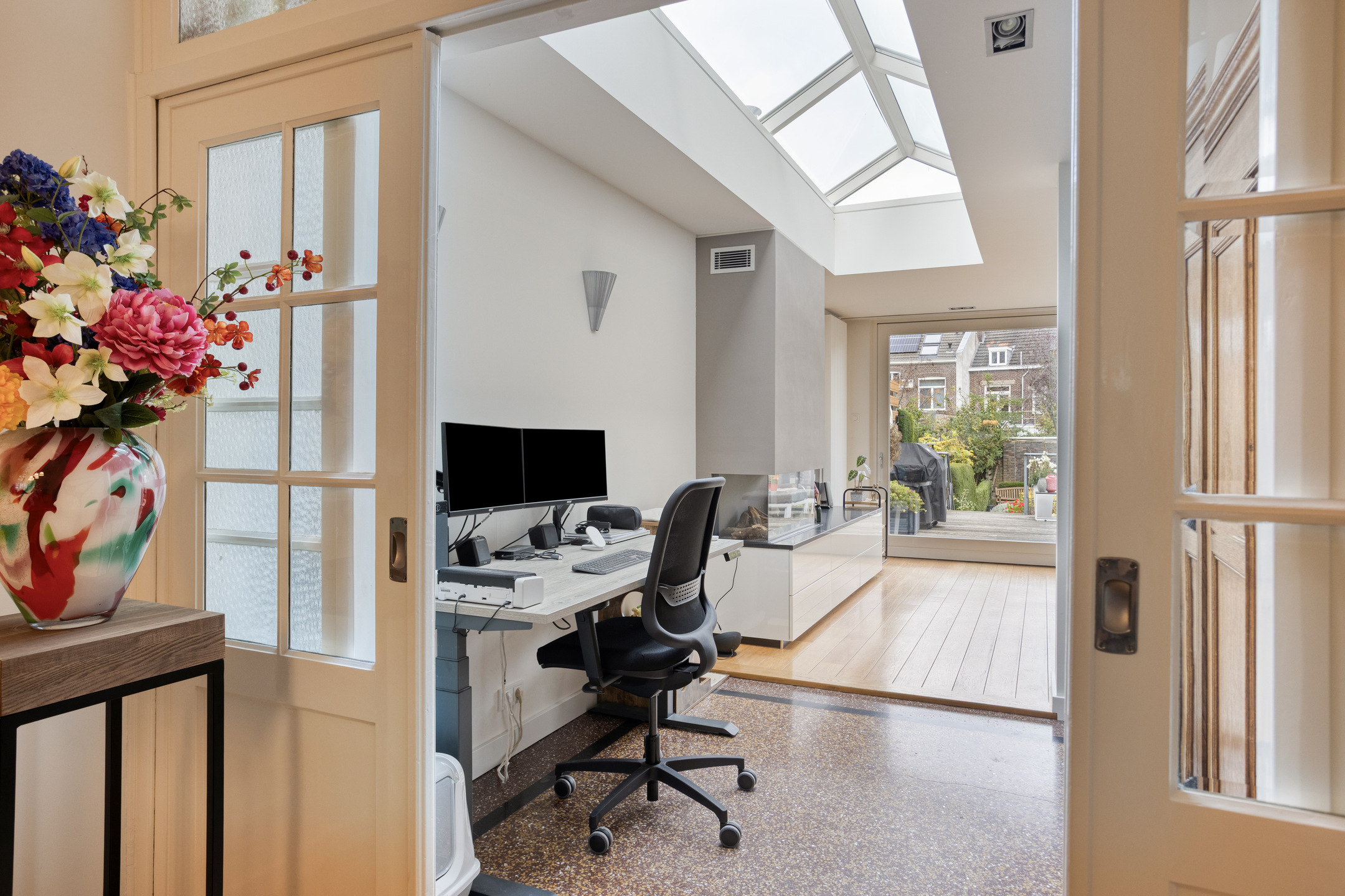 De werkplek is uitgerust met een terrazzovloer en de keuken en woonkamer zijn voorzien van een mooie parketvloer.