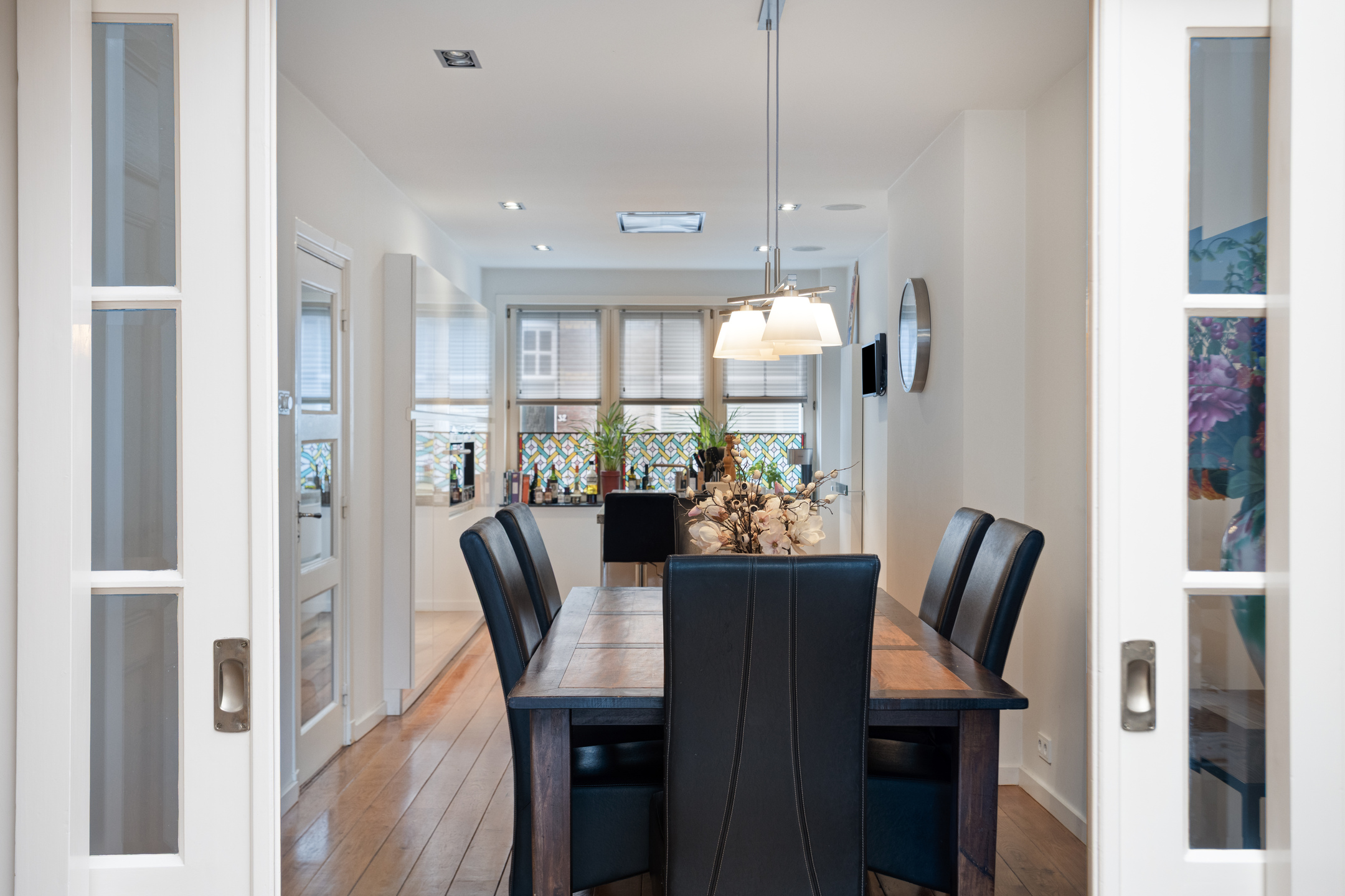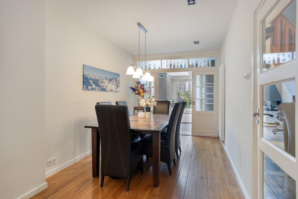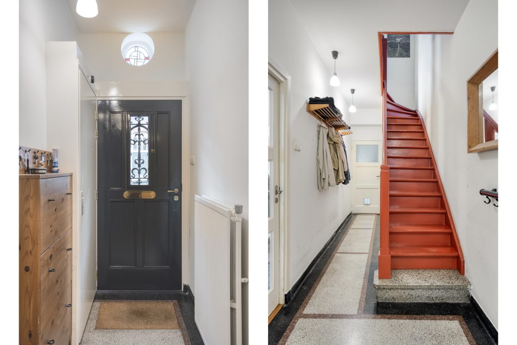 De woning heeft een prachtige entree die toegang geeft tot de ca. 8 meter diepe hal met terrazzo vloer. Het hoge plafond, de paneel deuren en het ronde glas in lood raampje zorgen voor een karakteristieke uitstraling.
