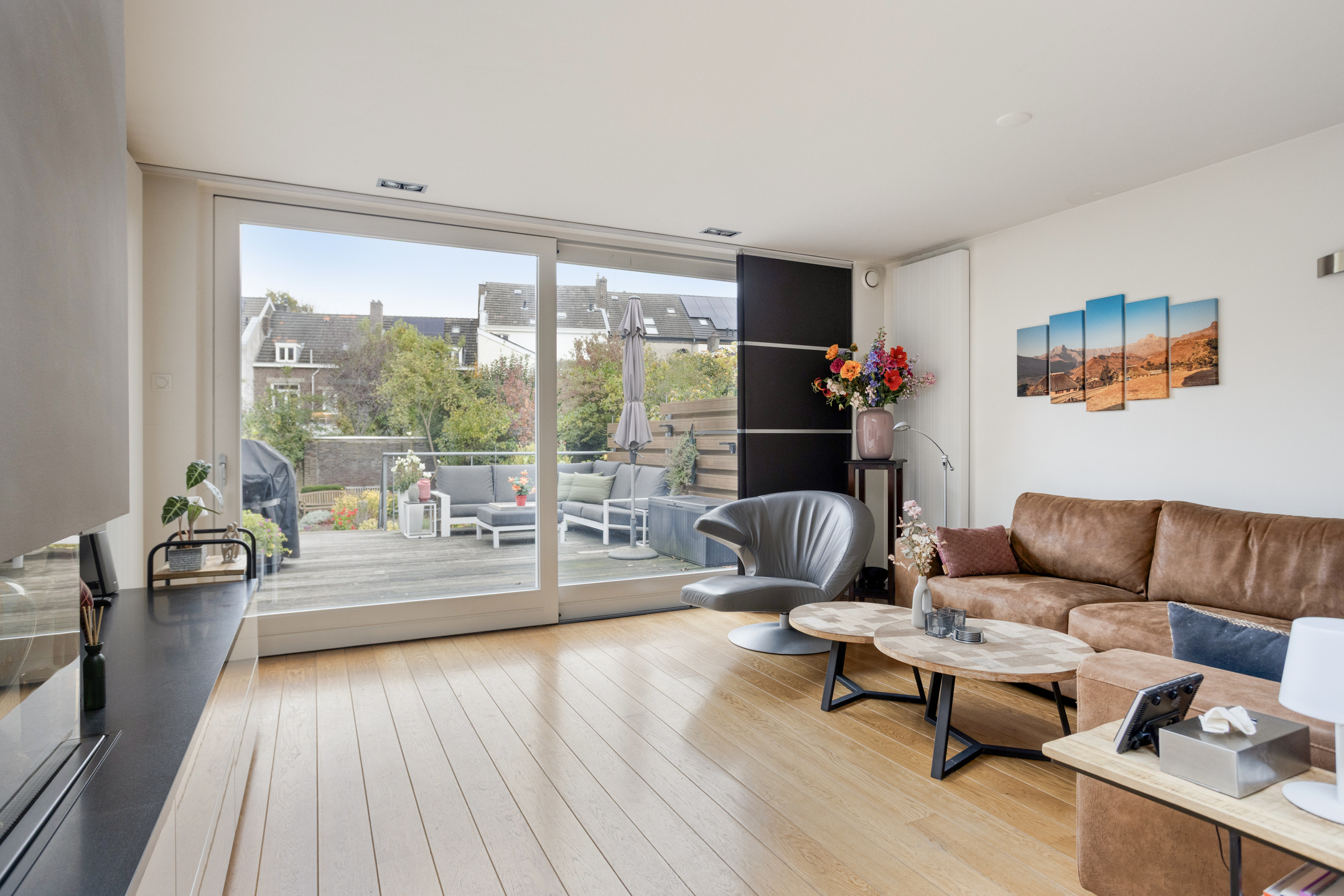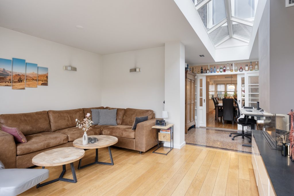 De woonkamer is tactisch aan de achterzijde gelegen, hier heb je namelijk via de riante schuifpui toegang tot en uitzicht op het terras en de groene tuin.