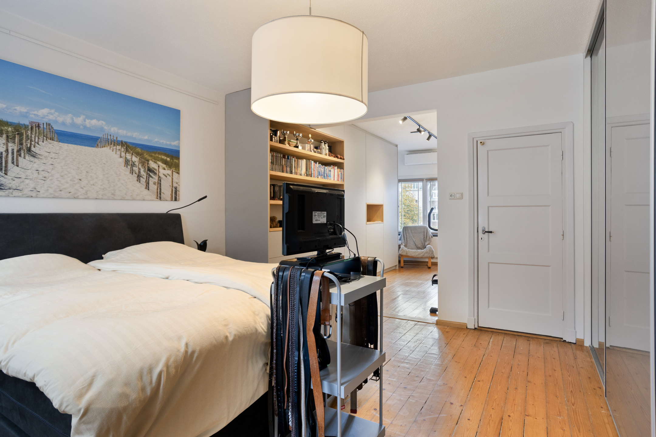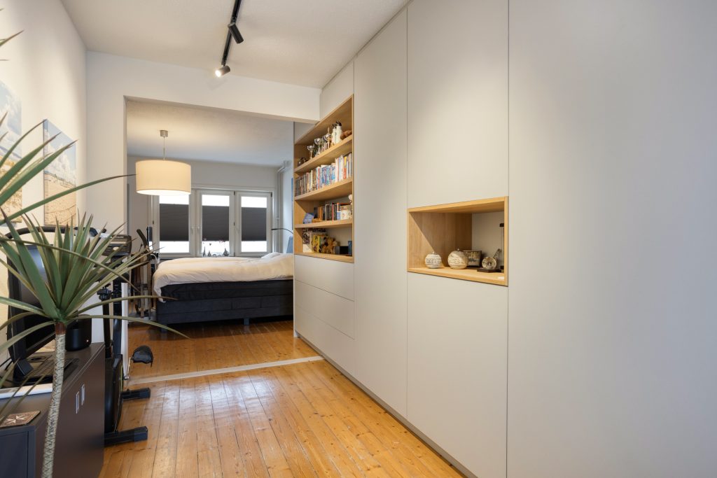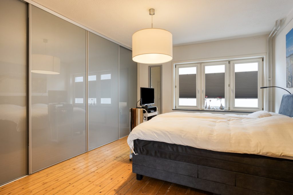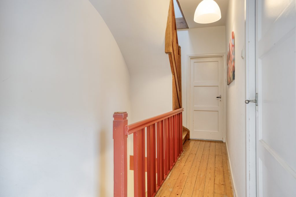 U volgt de trap naar de eerste verdieping, waar de overloop toegang geeft tot een ruime slaapkamer en de moderne badkamer. De master bedroom is liefst 28m² groot en voorzien van een inbouw kastenwand, uiteraard bestaat de mogelijkheid om hier weer twee slaapkamers van te maken.