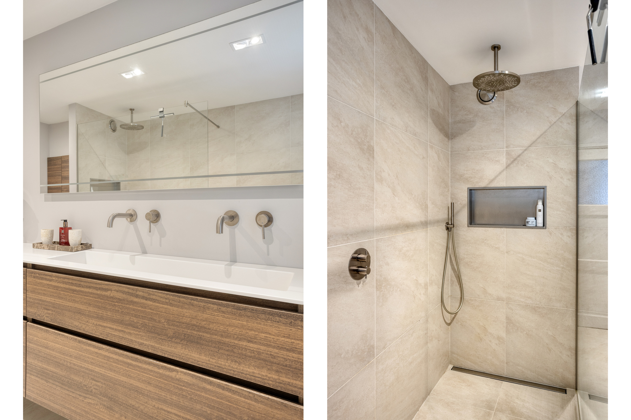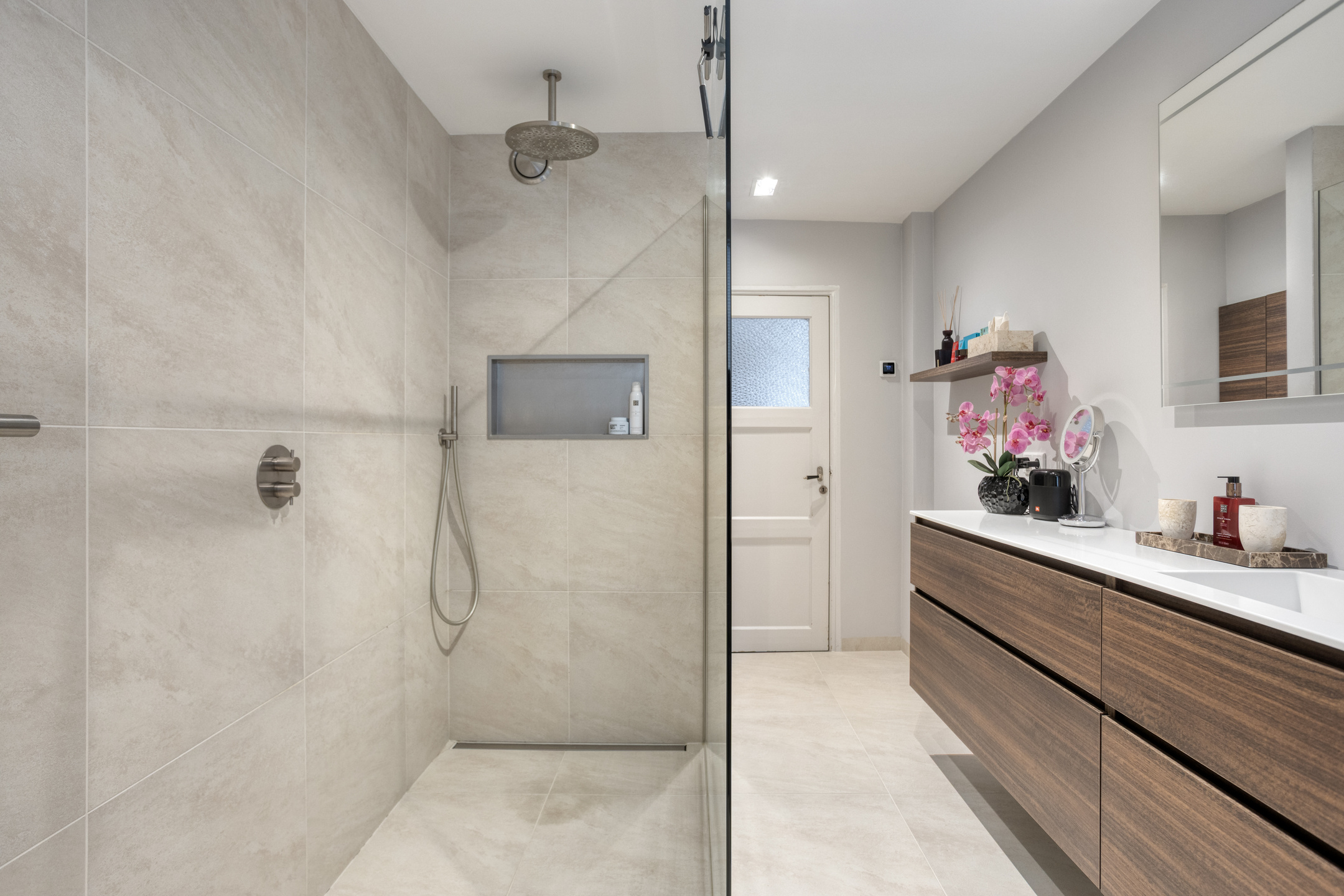 De deur geeft toegang tot de aan de achterkant gelegen badkamer. De badkamer is geheel gemoderniseerd en volledig van deze tijd; een prachtige beige tegelvloer- en wand, een royale inloop regendouche en dubbele wastafel in een stijlvol meubel.