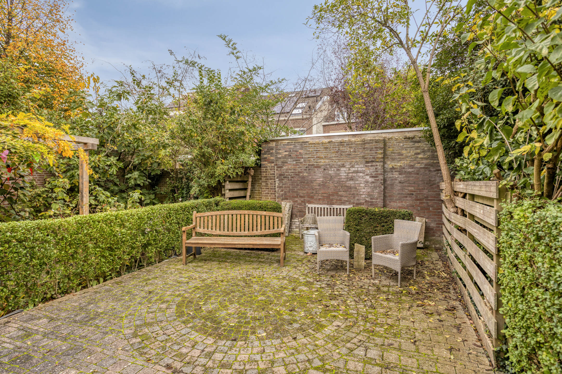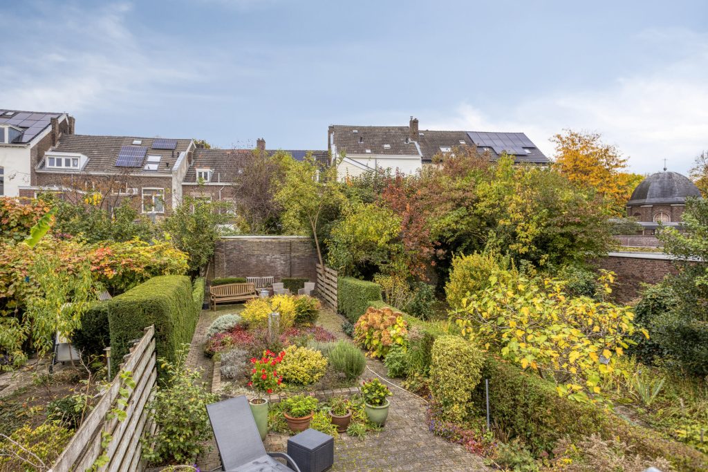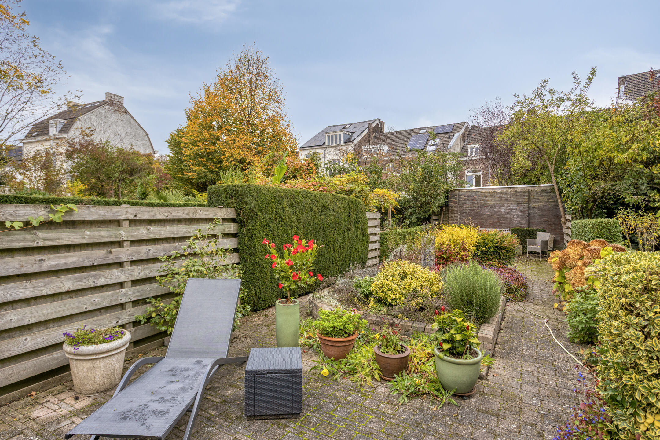 In deze tuin heeft u genoeg ruimte om een loungeset én een tafel met stoelen te plaatsen. Al in de ochtend zit u in de zon en dankzij de diepte van de tuin geniet u de rest van de dag ook van voldoende zon uren.