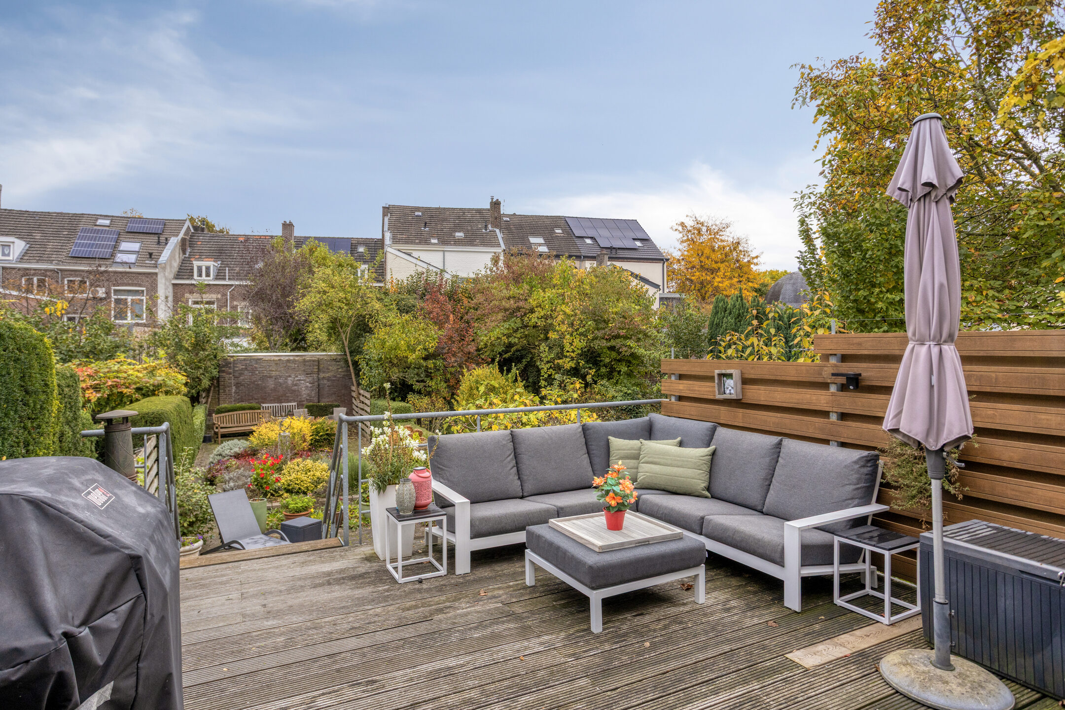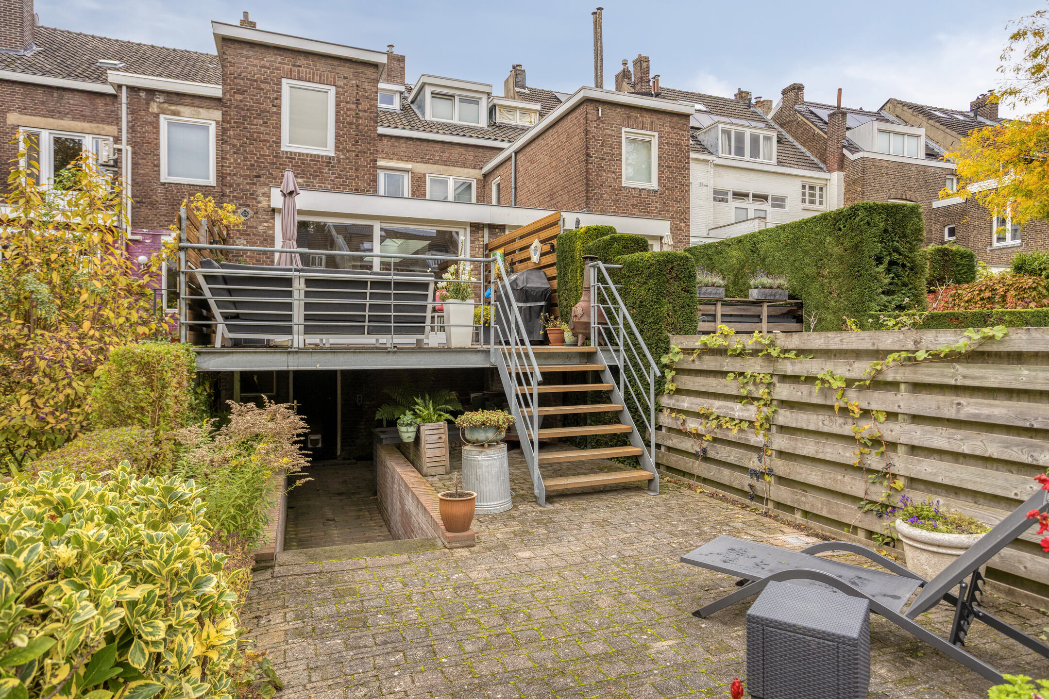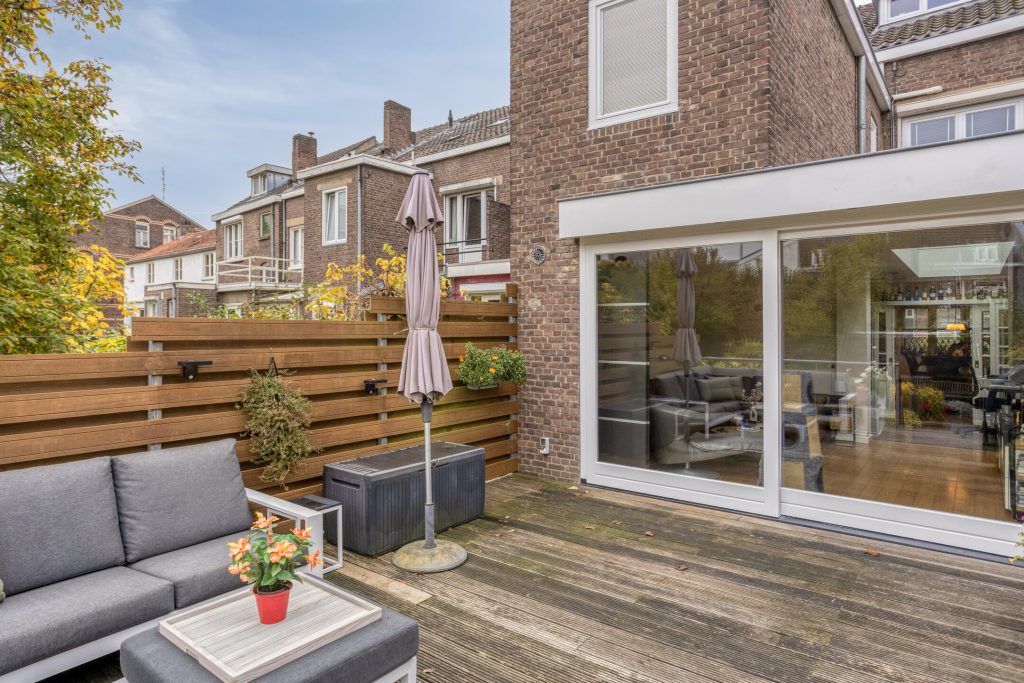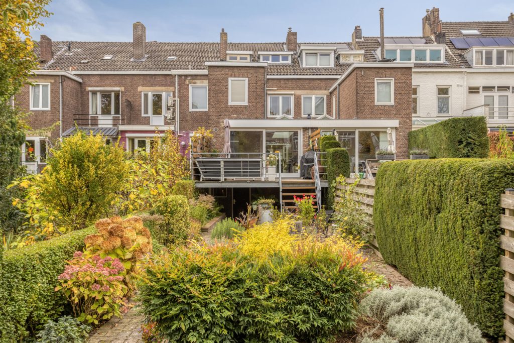 In deze tuin heeft u genoeg ruimte om een loungeset én een tafel met stoelen te plaatsen. Al in de ochtend zit u in de zon en dankzij de diepte van de tuin geniet u de rest van de dag ook van voldoende zon uren.