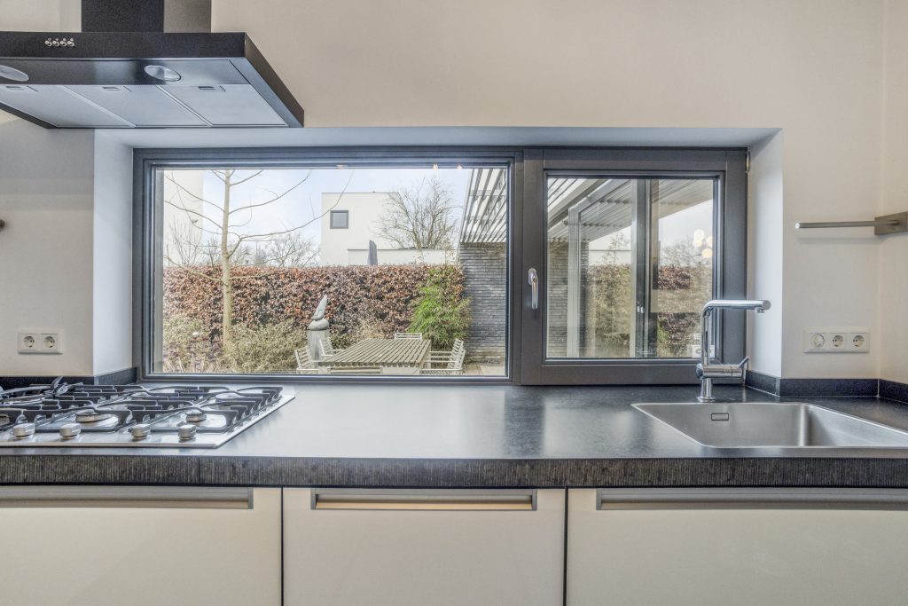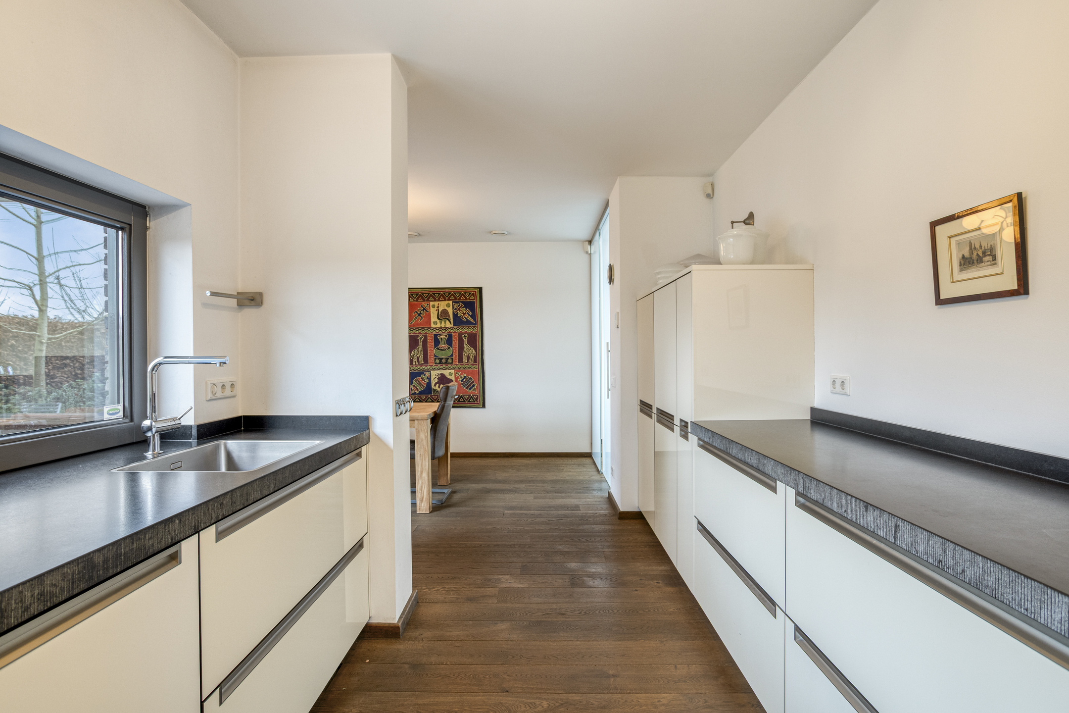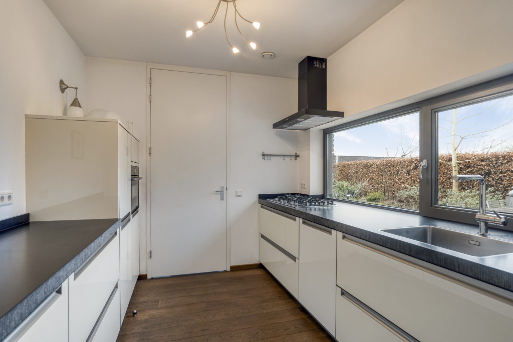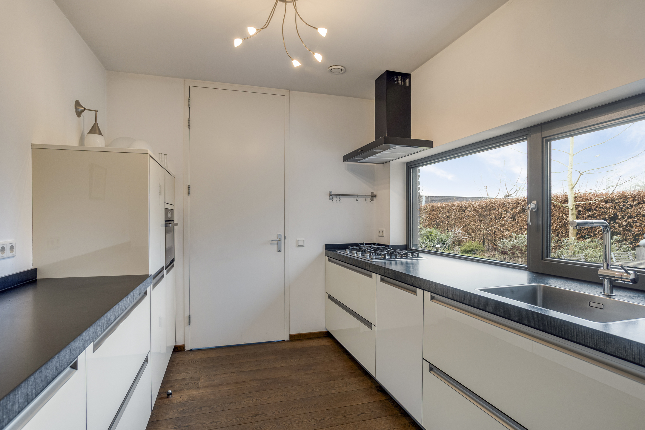 De tijdloze keuken met hardstenen werkblad is compleet uitgevoerd en voorzien van diverse inbouwapparatuur, waaronder een gaskookplaat met moderne afzuigkap, koel- en vrieskast, combi oven/magnetron en vaatwasser en ruim voldoende opbergmogelijkheden. Aansluitend aan de keuken bevindt zich de praktische bijkeuken met toegang tot zowel de tuin als de garage.