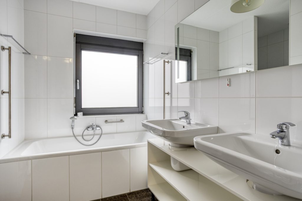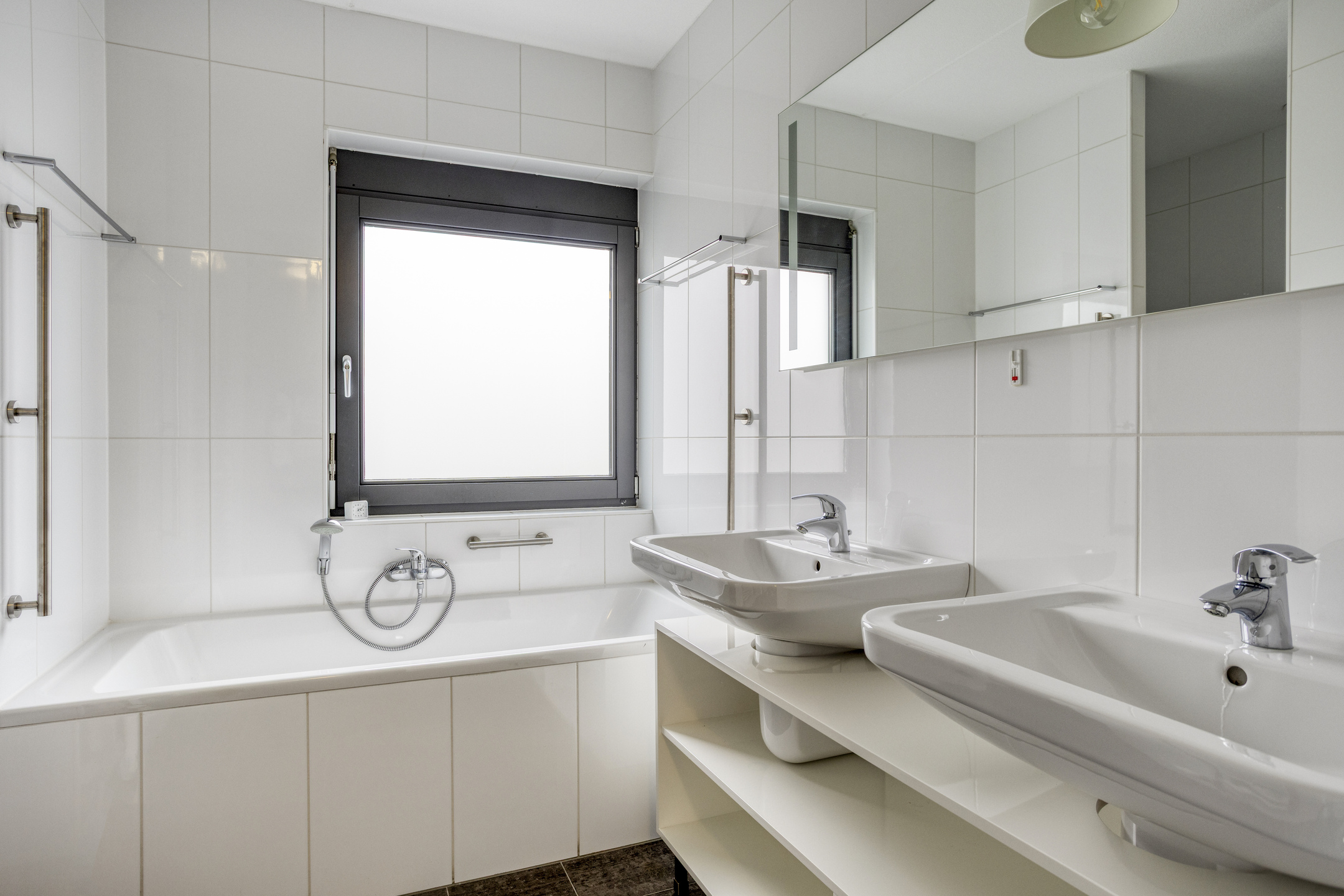 De volledig betegelde badkamer is uitgerust met een ligbad, inloopdouche en dubbele wastafel. Het toilet is separaat op de overloop gelegen.
