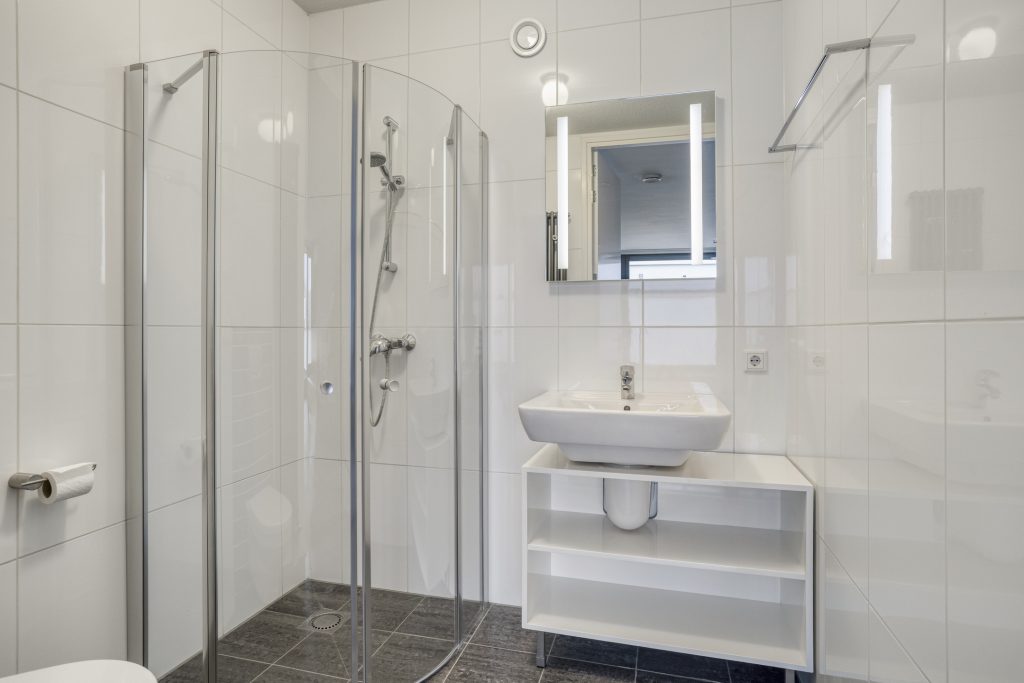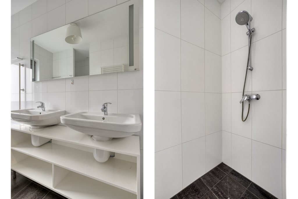 De tweede badkamer is eveneens volledig betegeld en voorzien van een inloopdouche, wastafel en een derde toilet.