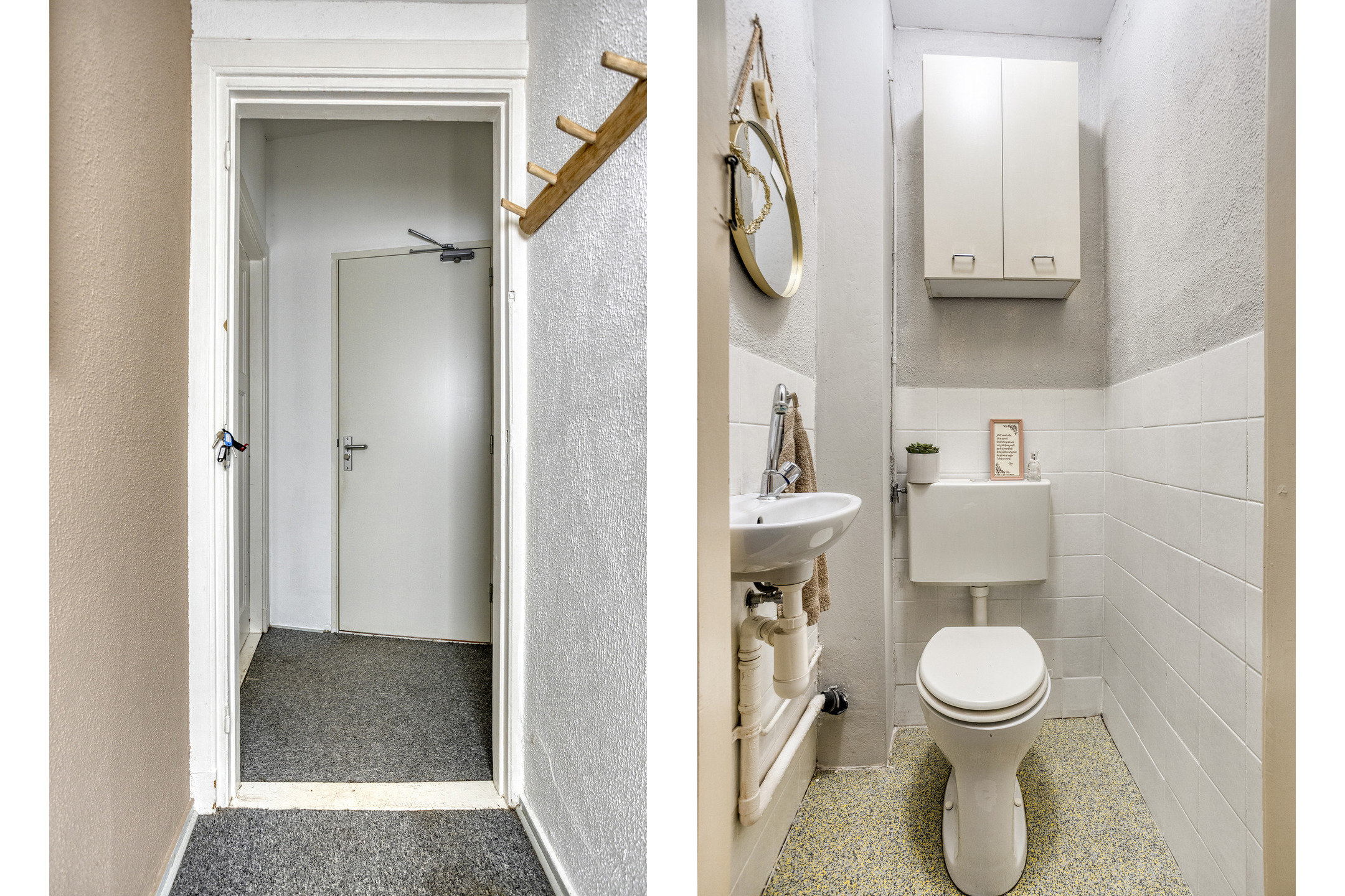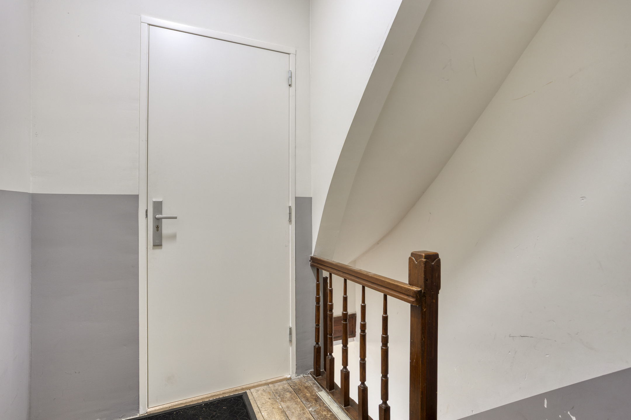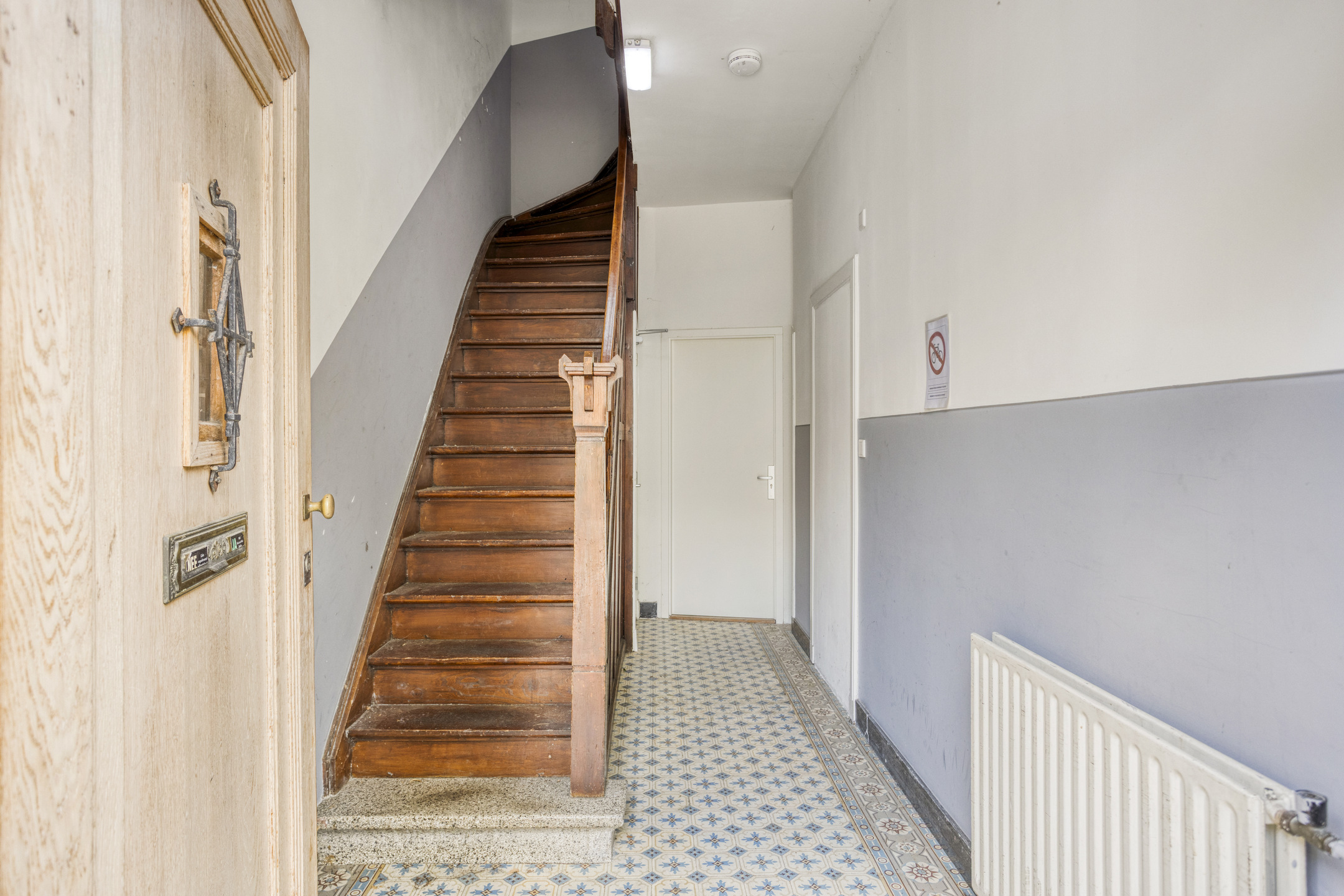 U komt binnen in de gezamenlijke hal met Portugese tegelvloer en houten trapopgang, hier krijgt u toegang tot de kelder en het appartement op de begane grond.