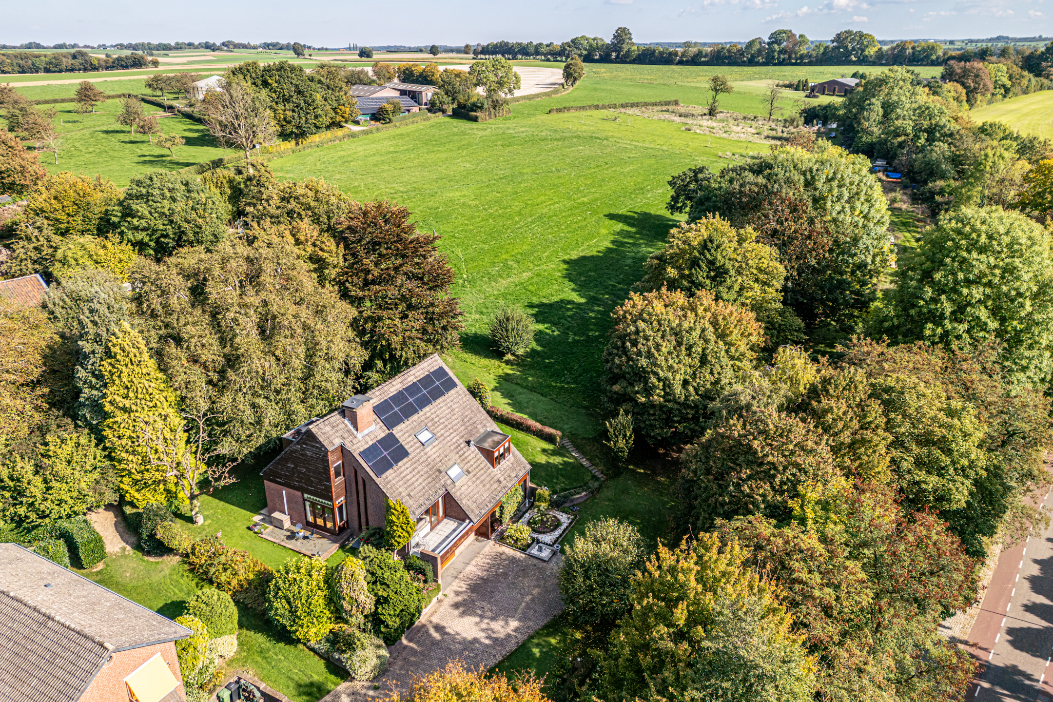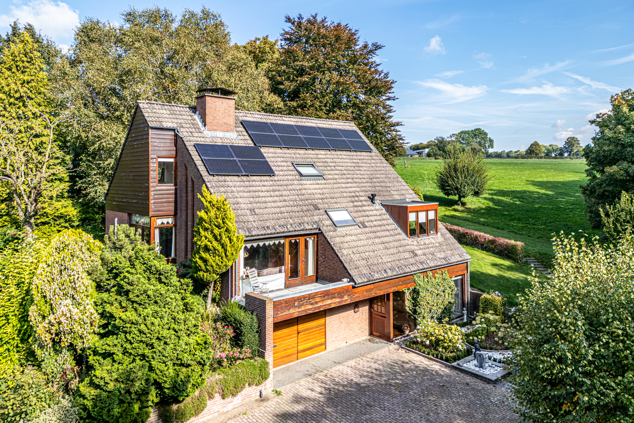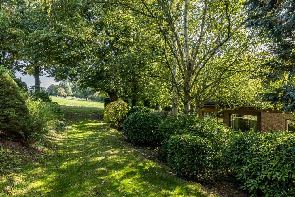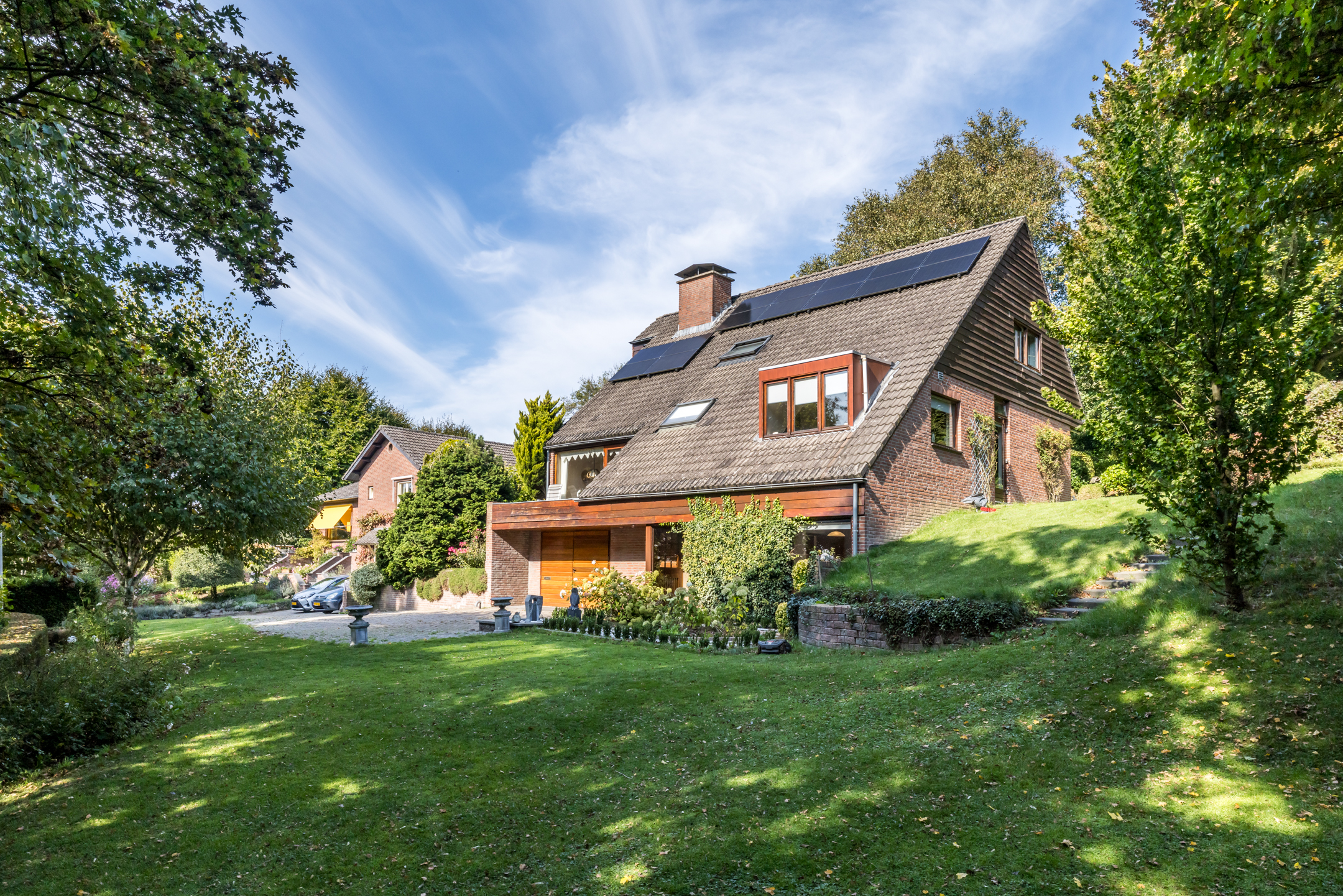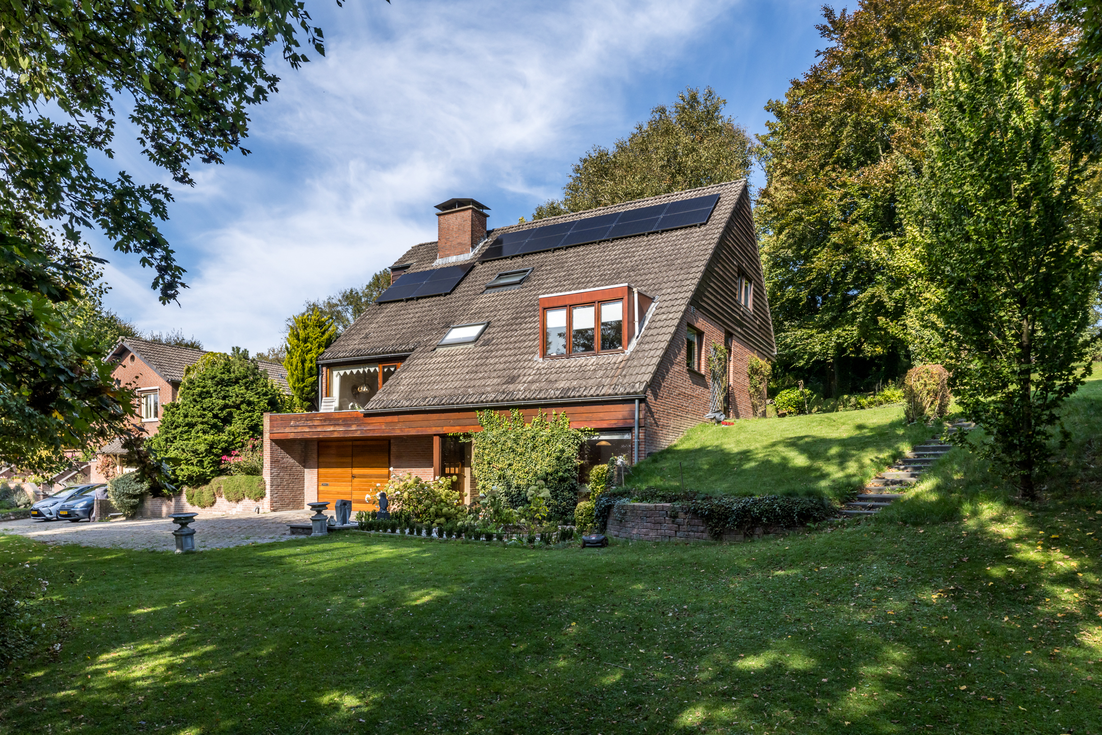 Het woonhuis wordt omringd door een royale, hellende tuin met veel groen en privacy. Aan de voorzijde, bij de garage en entree, is ruime parkeergelegenheid voor uzelf en voor gasten. Een robotmaaier volgt zijn weg over het gazon en hoge bomen zorgen voor fijne schaduwplekken in de tuin. De terrassen op niveau van de woonkamer bieden volop ruimte om van de zon te genieten. De aansluitende weide van circa 3700 m² wordt optioneel te koop aangeboden, perfect voor het houden van dieren of het aanleggen van bijvoorbeeld een voedselbos.