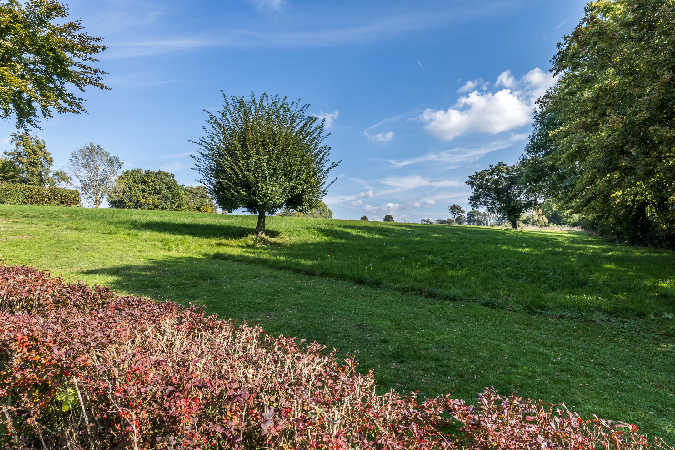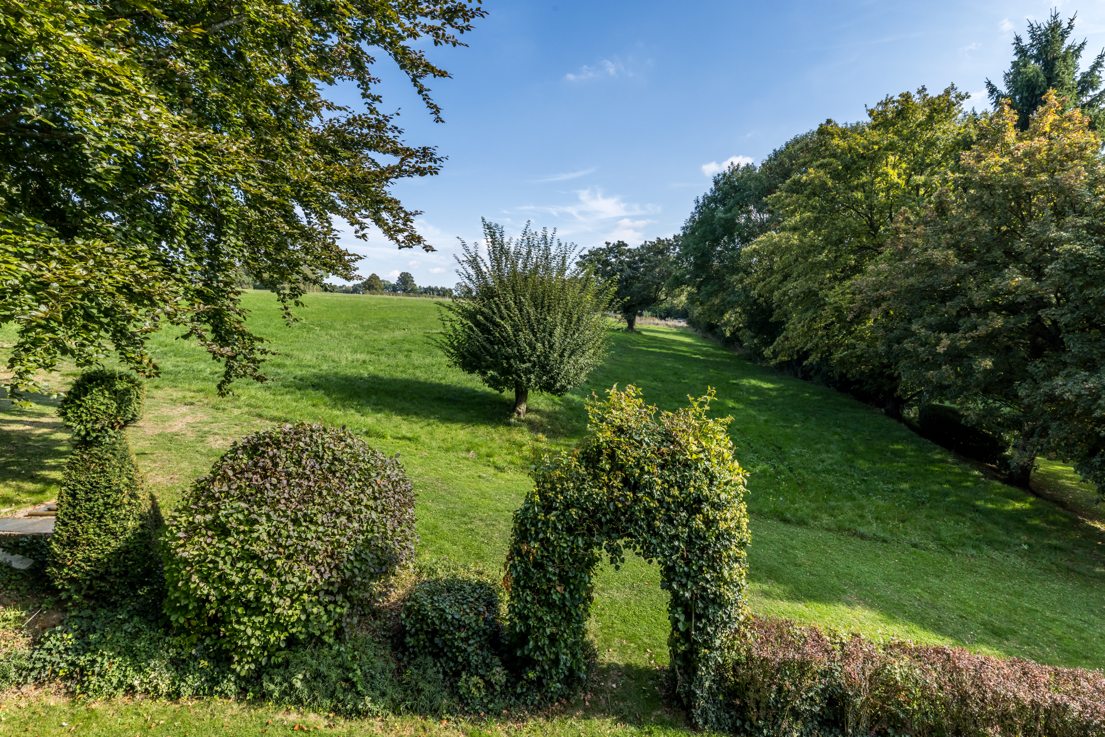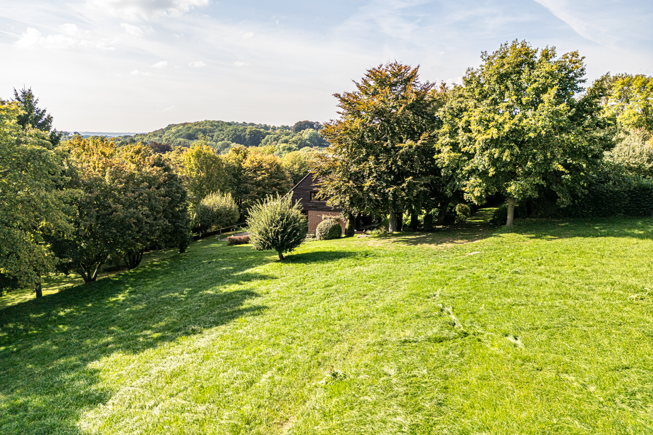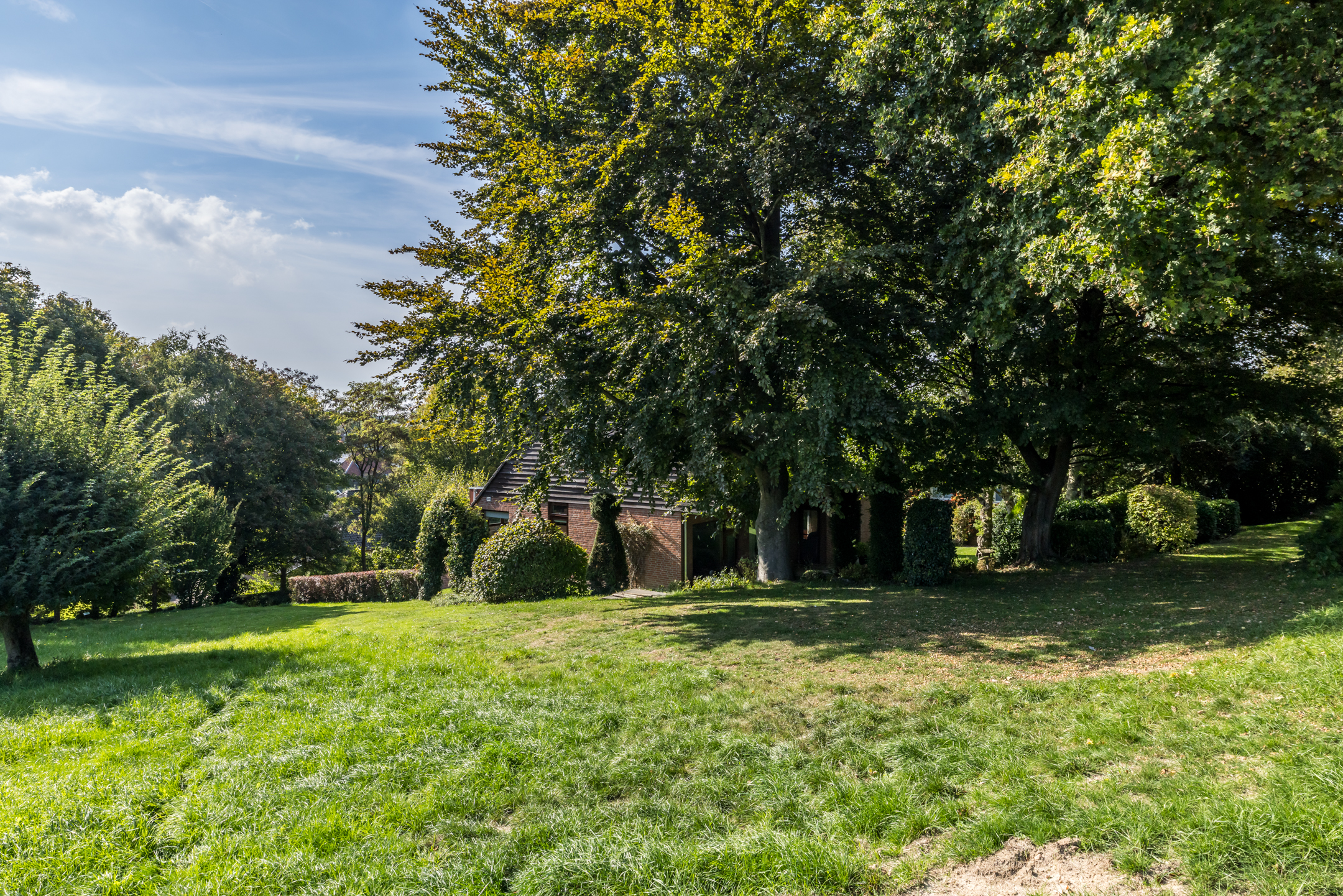 Het woonhuis wordt omringd door een royale, hellende tuin met veel groen en privacy. Aan de voorzijde, bij de garage en entree, is ruime parkeergelegenheid voor uzelf en voor gasten. Een robotmaaier volgt zijn weg over het gazon en hoge bomen zorgen voor fijne schaduwplekken in de tuin. De terrassen op niveau van de woonkamer bieden volop ruimte om van de zon te genieten. De aansluitende weide van circa 3700 m² wordt optioneel te koop aangeboden, perfect voor het houden van dieren of het aanleggen van bijvoorbeeld een voedselbos.