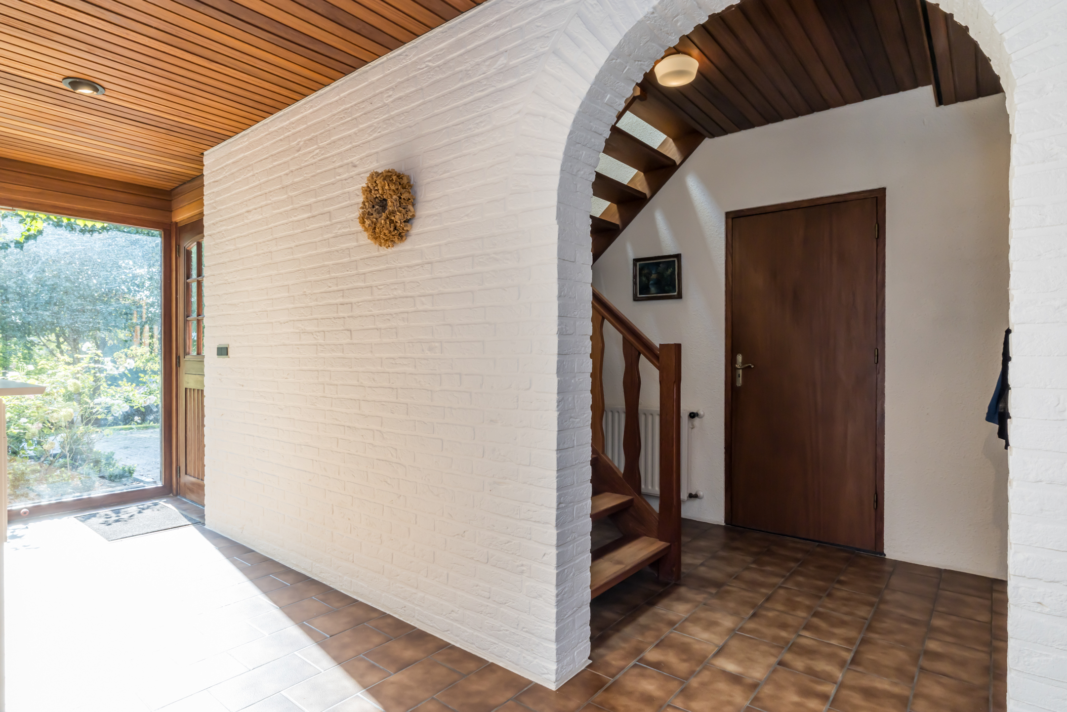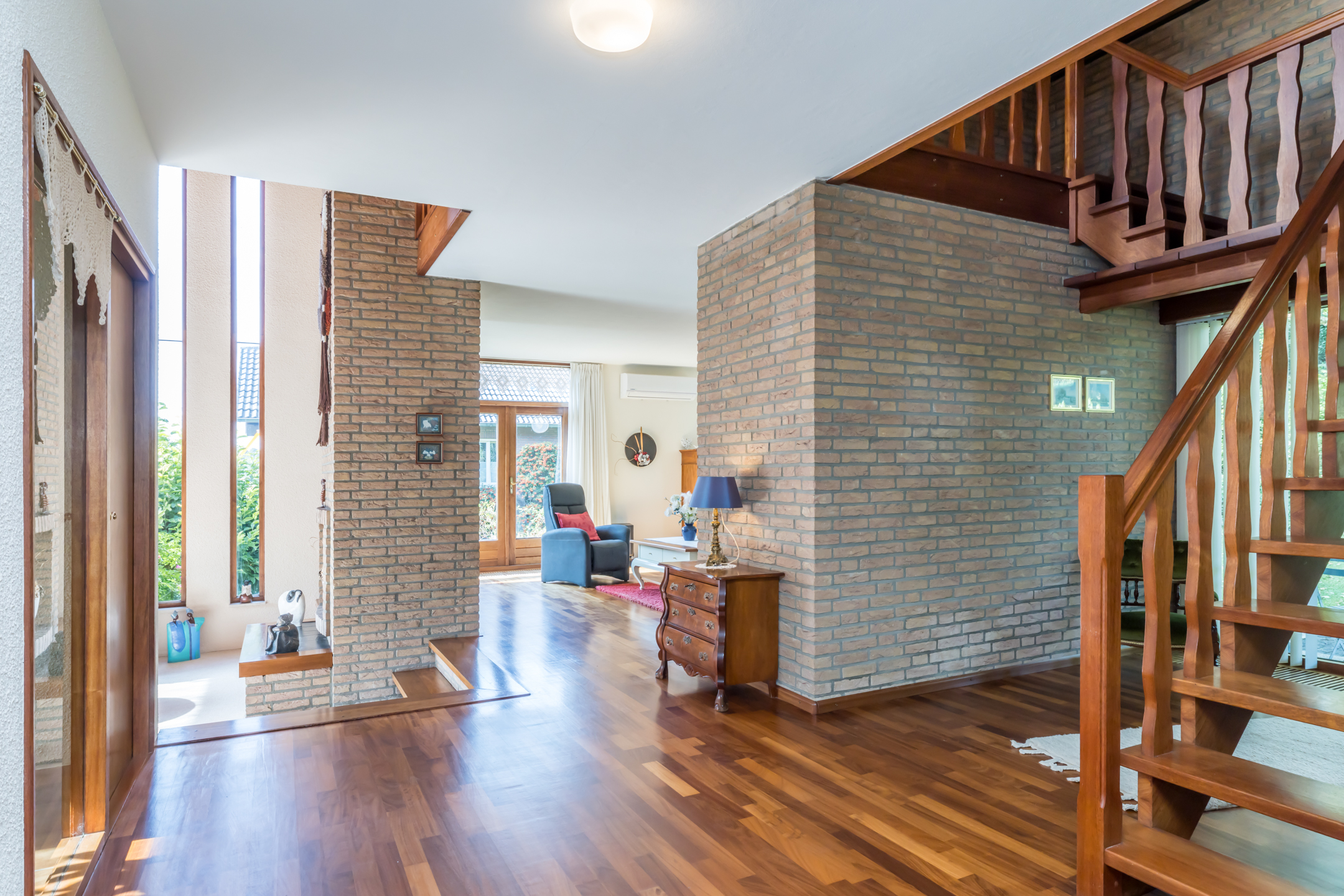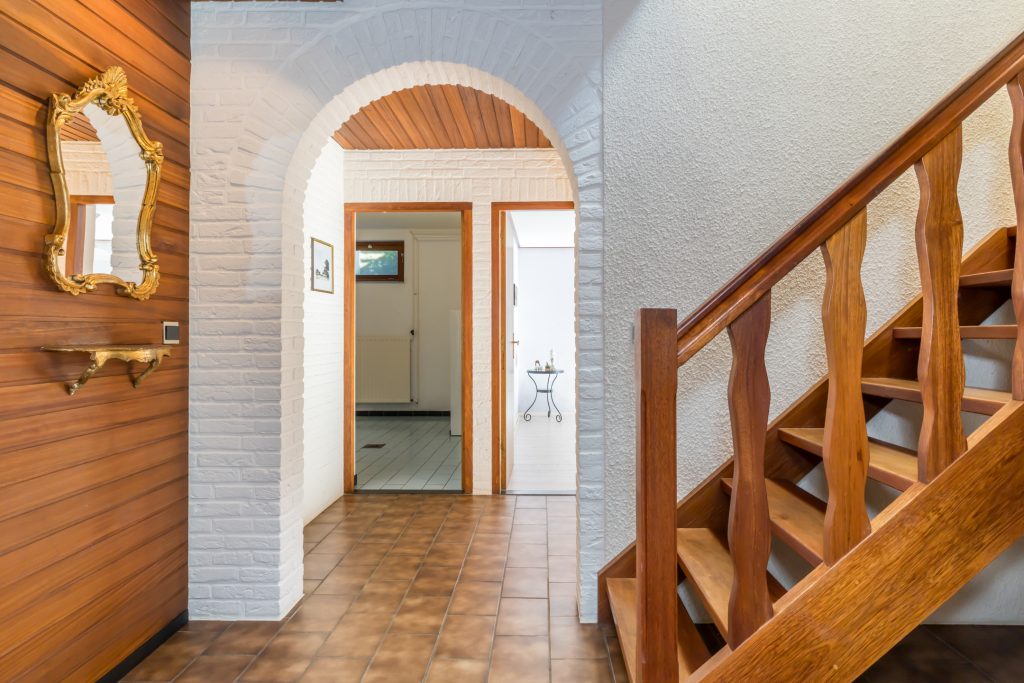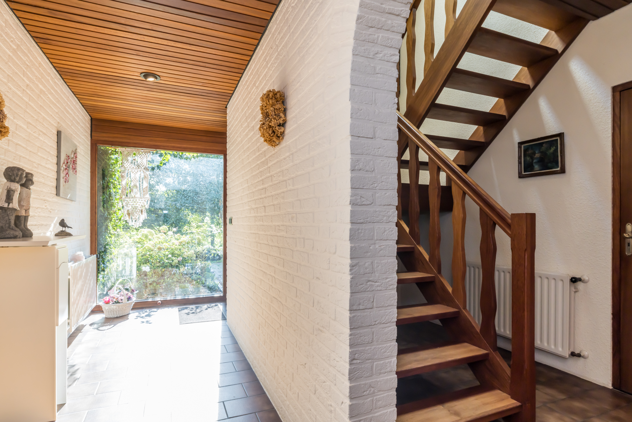 Een groot dakraam zorgt voor veel lichtinval, bij de bordestrap en in de hal op de begane grond. Vanuit hier heeft u niet alleen toegang tot de woonkamer en keuken, maar ook tot het gastentoilet.