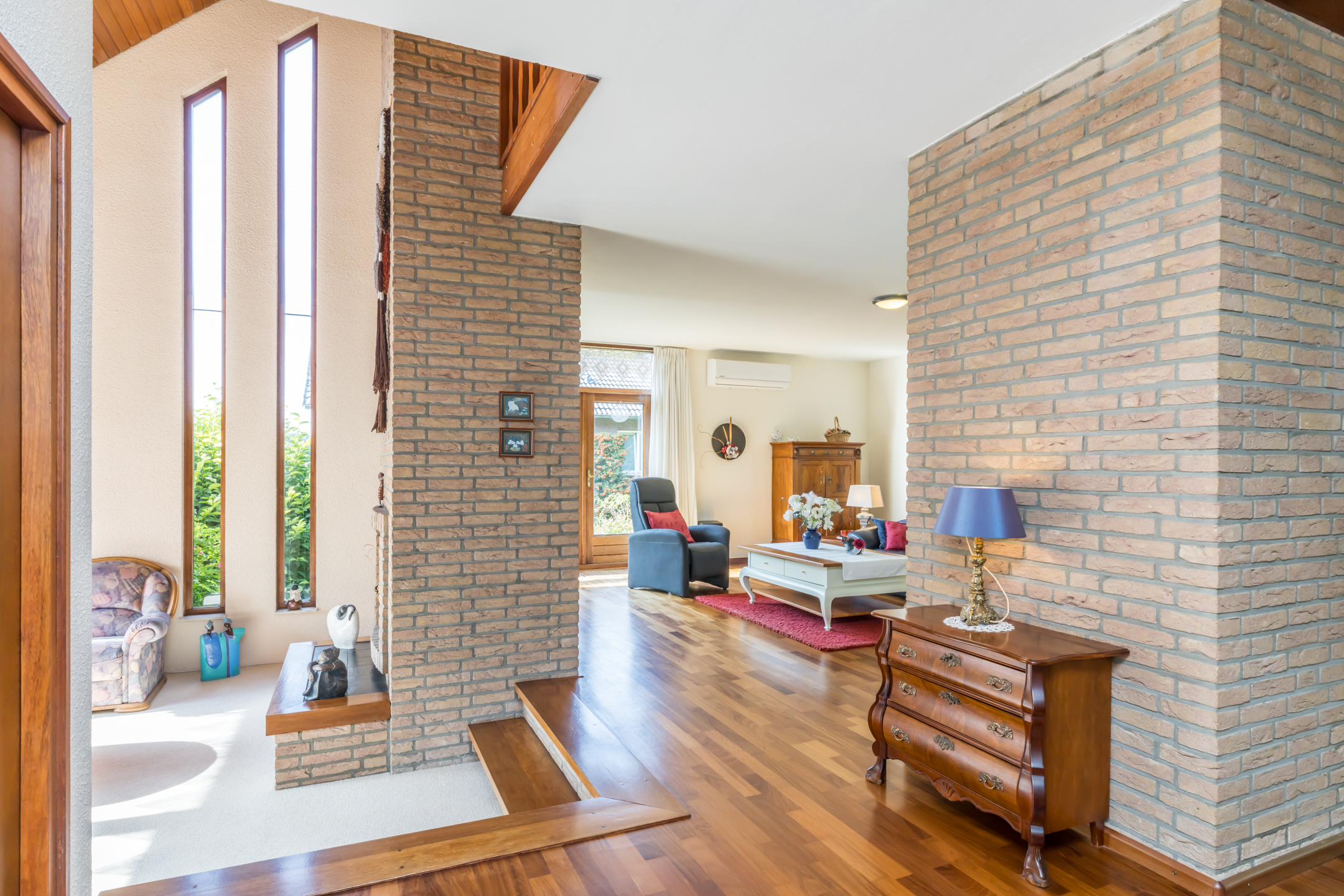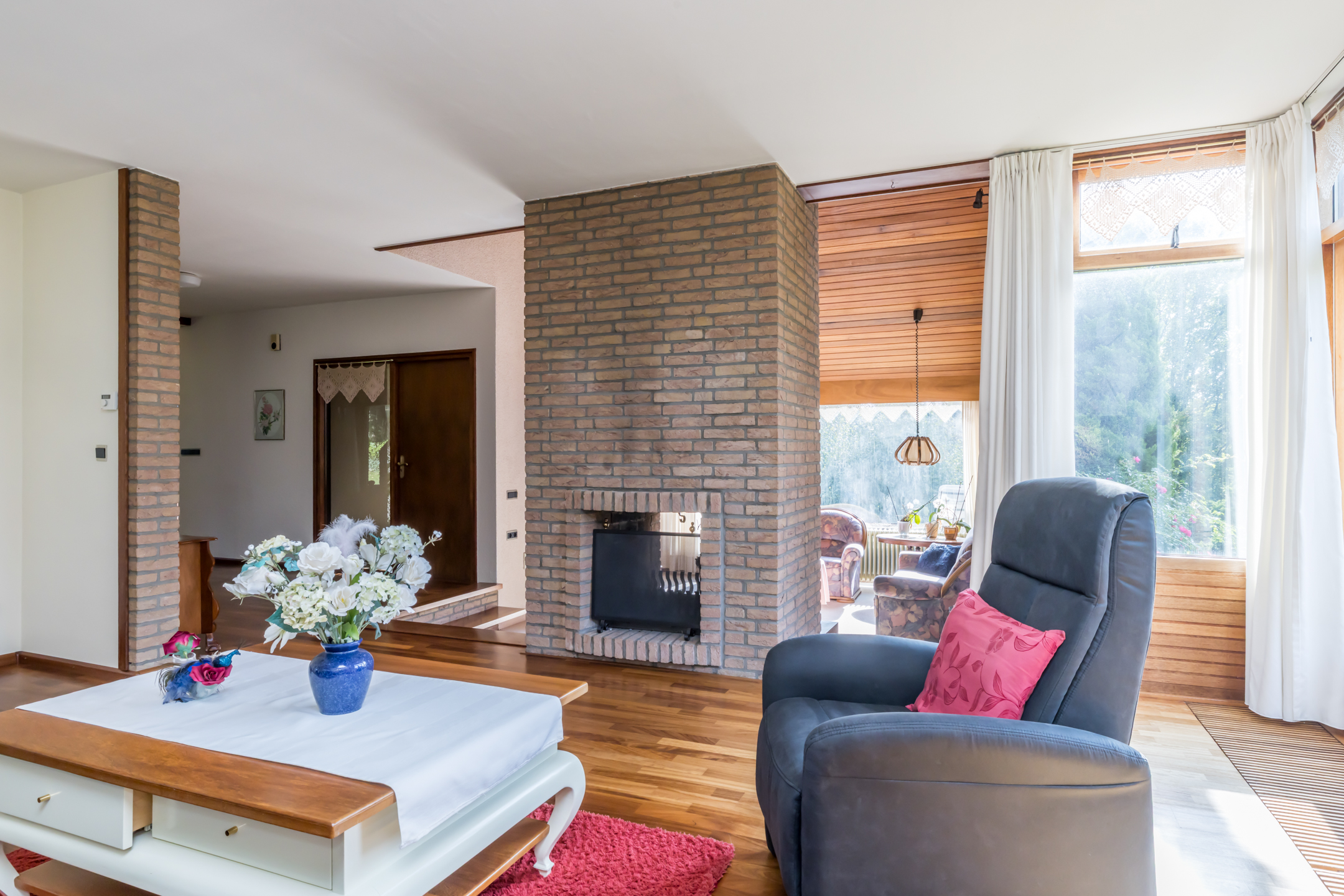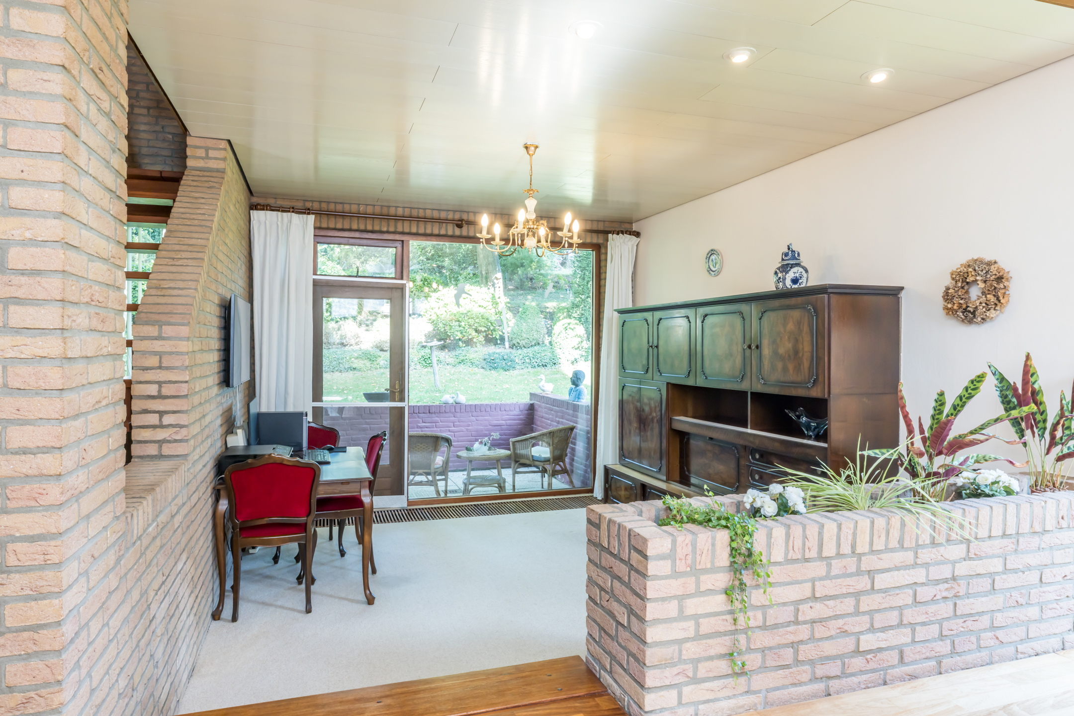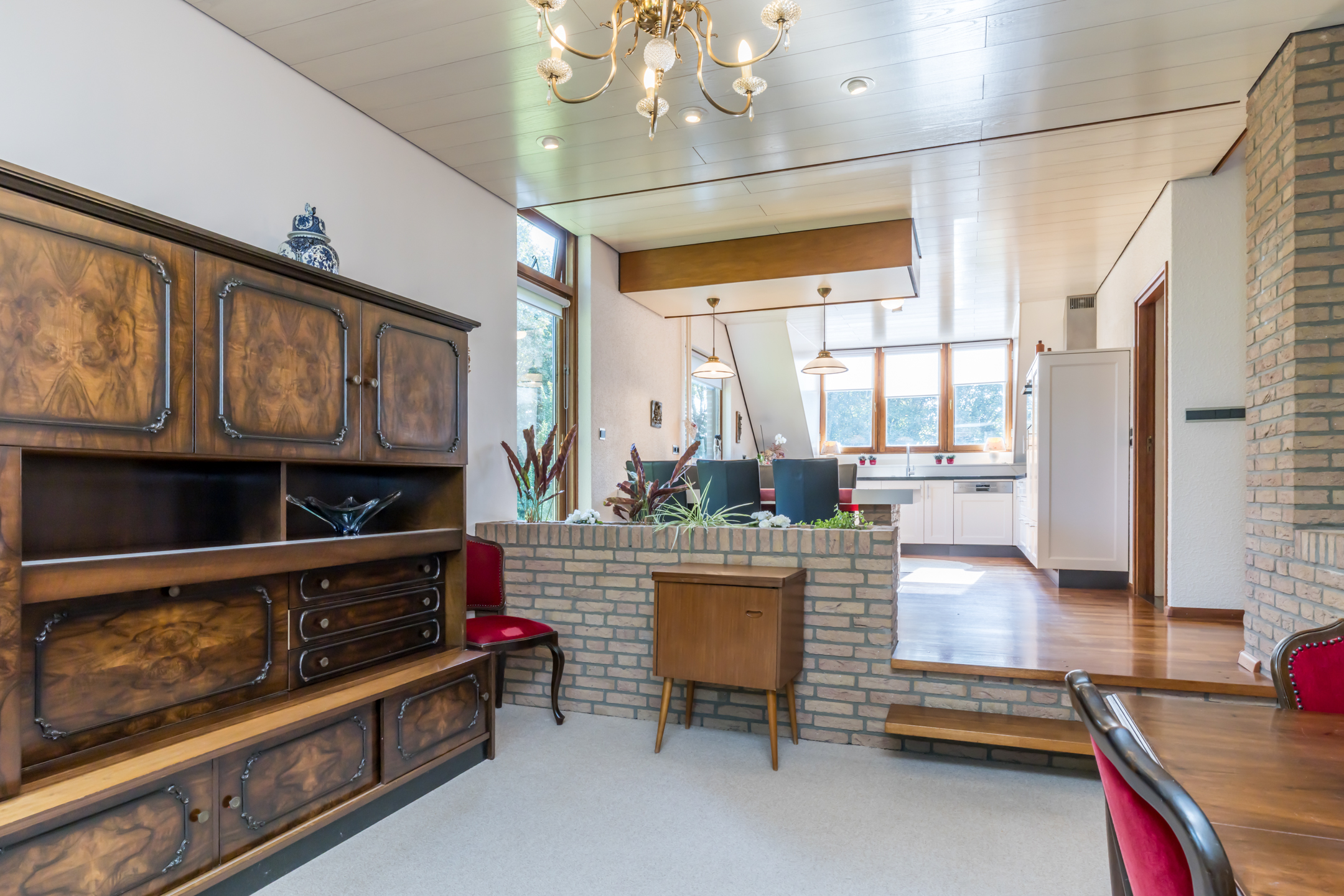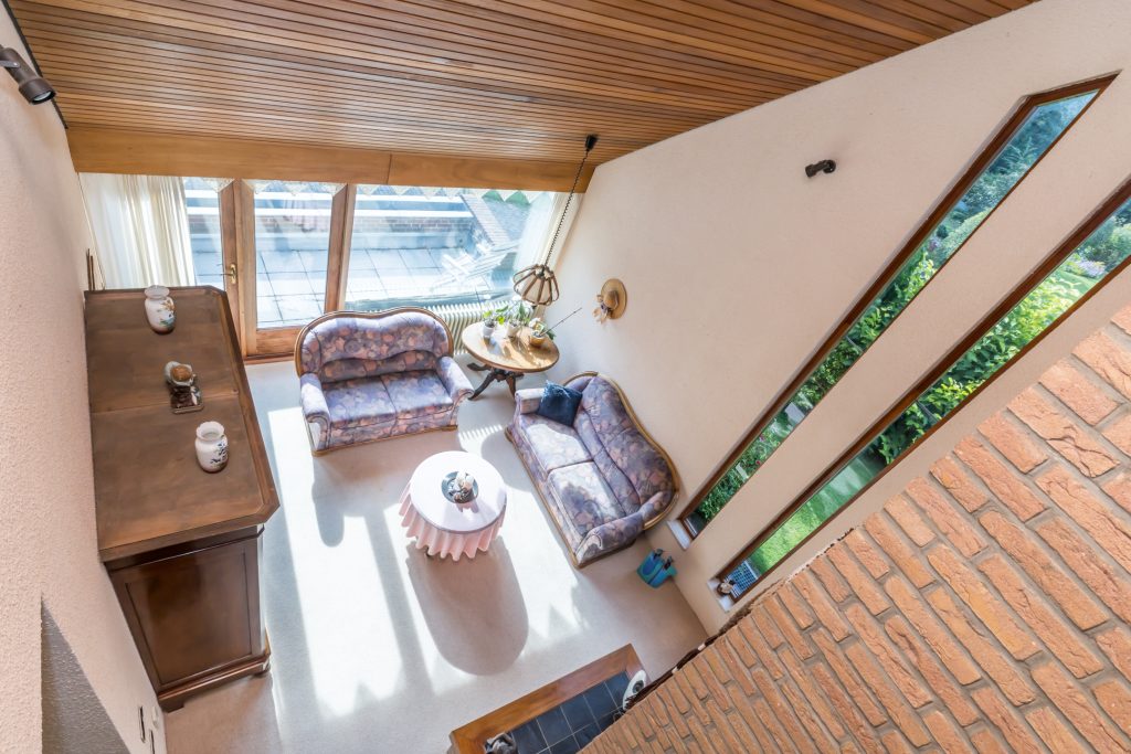 De woonkamer is een speels ingedeelde leefruimte met een zitkamer, een werk-/studeergedeelte en een zitkuil met hoge vide. De typische architectuur van de jaren ’70 en ’80, met grote ramen en verschillende hoogtes, zorgt voor een leefruimte waar een gezin alle ruimte heeft. De gemetselde schouw met doorkijkhaard scheidt de zitkamer van de zitkuil. Er is toegang tot het balkon aan de voorzijde, het tuinterras aan de achter- en zijkant, én tot de prachtige tuin.