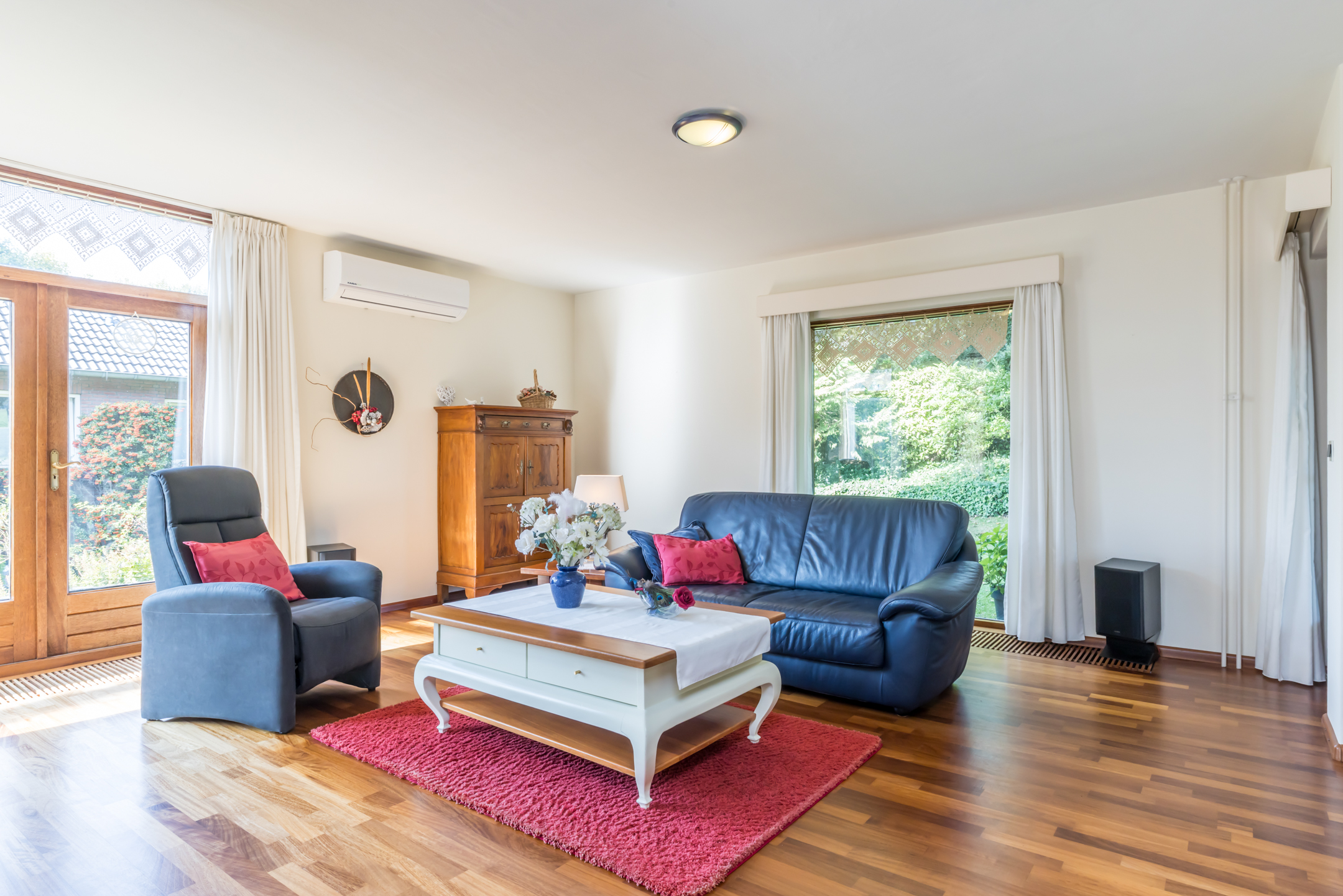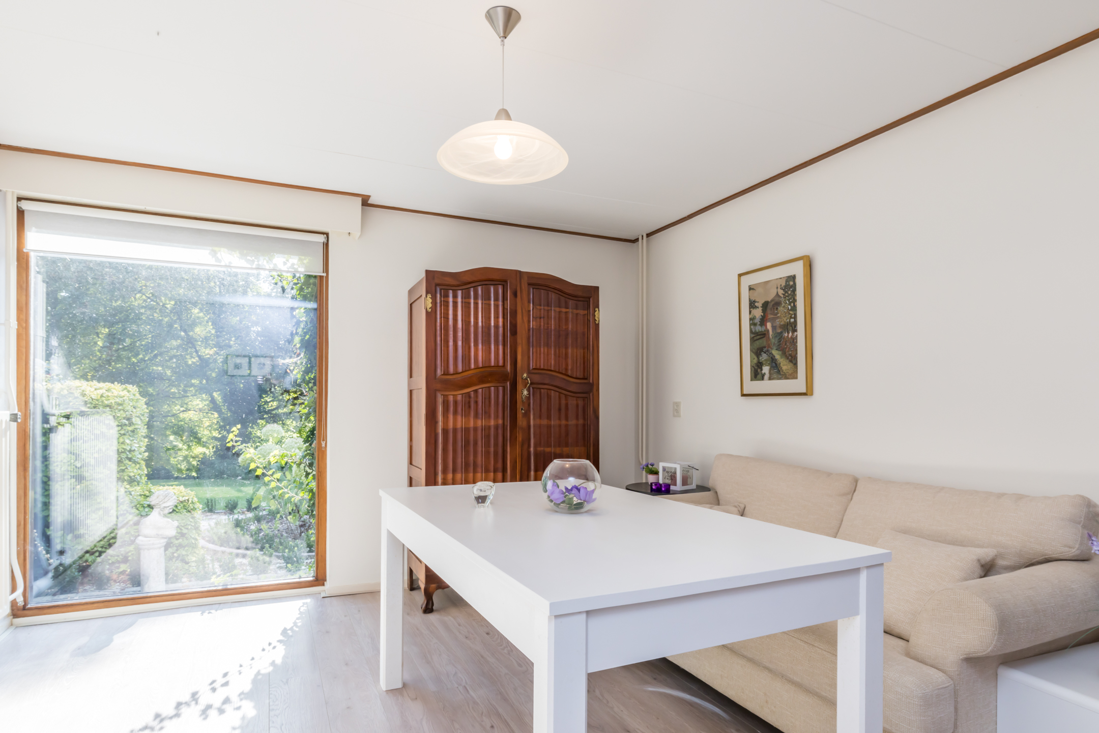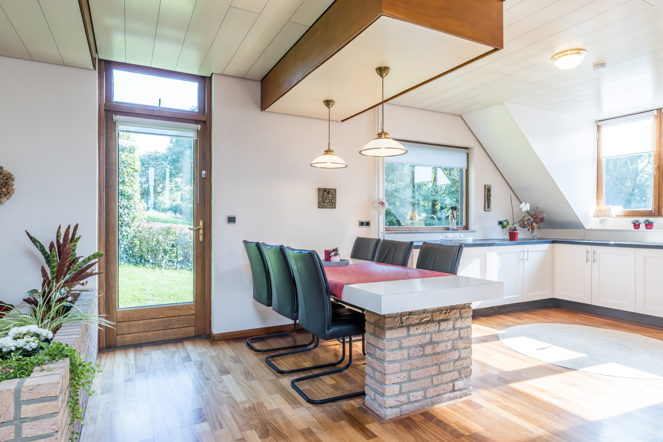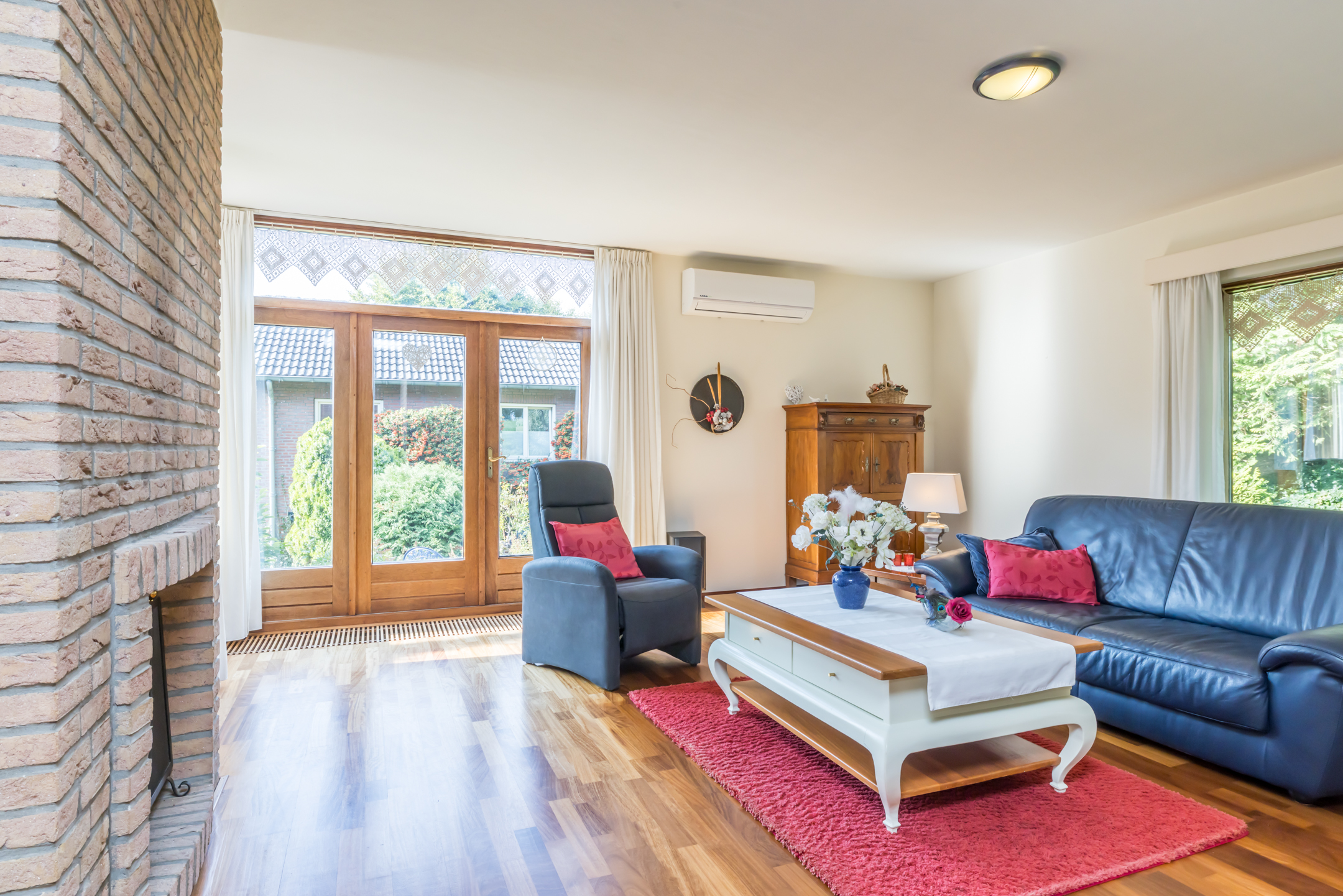 De woonkamer is een speels ingedeelde leefruimte met een zitkamer, een werk-/studeergedeelte en een zitkuil met hoge vide. De typische architectuur van de jaren ’70 en ’80, met grote ramen en verschillende hoogtes, zorgt voor een leefruimte waar een gezin alle ruimte heeft. De gemetselde schouw met doorkijkhaard scheidt de zitkamer van de zitkuil. Er is toegang tot het balkon aan de voorzijde, het tuinterras aan de achter- en zijkant, én tot de prachtige tuin.