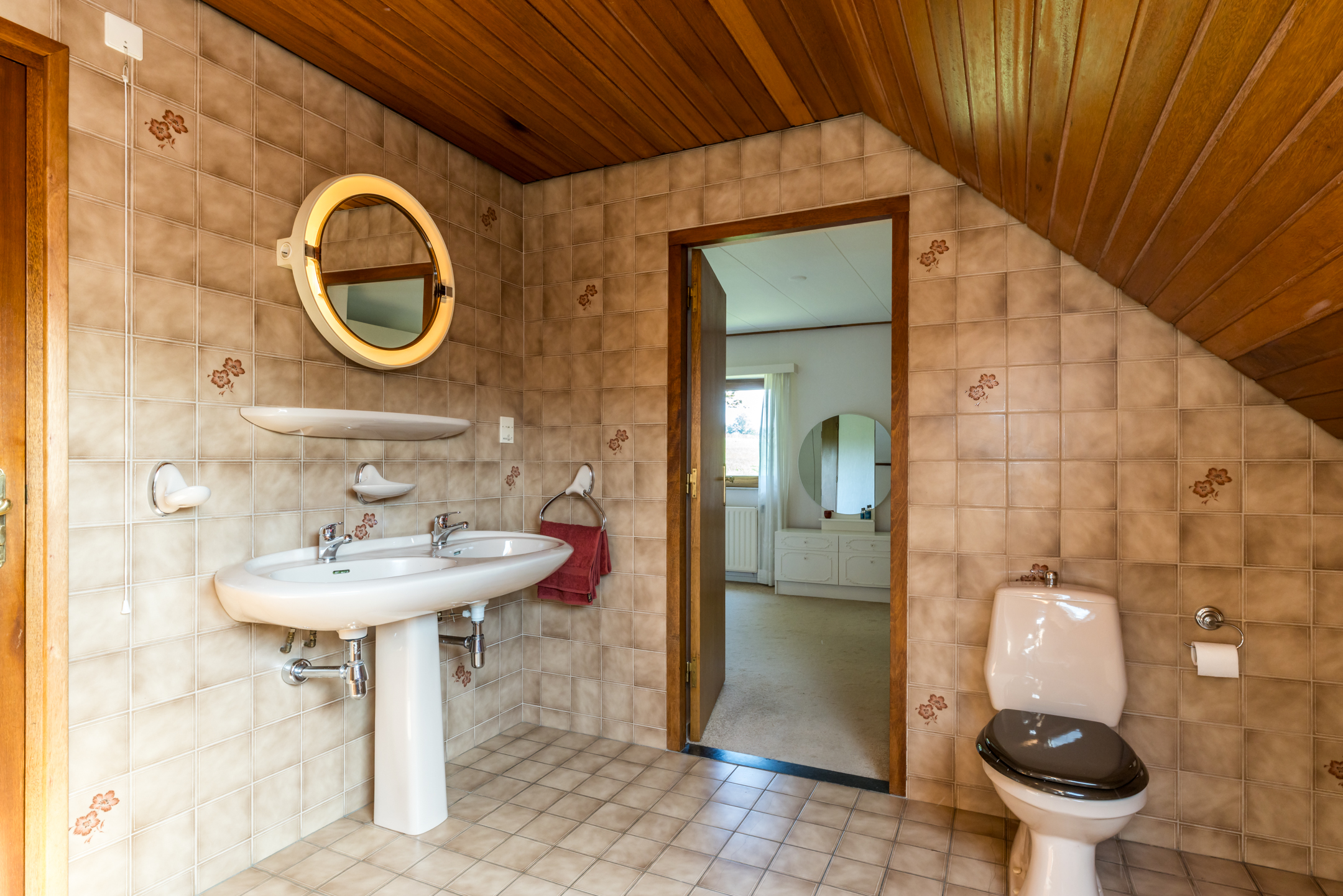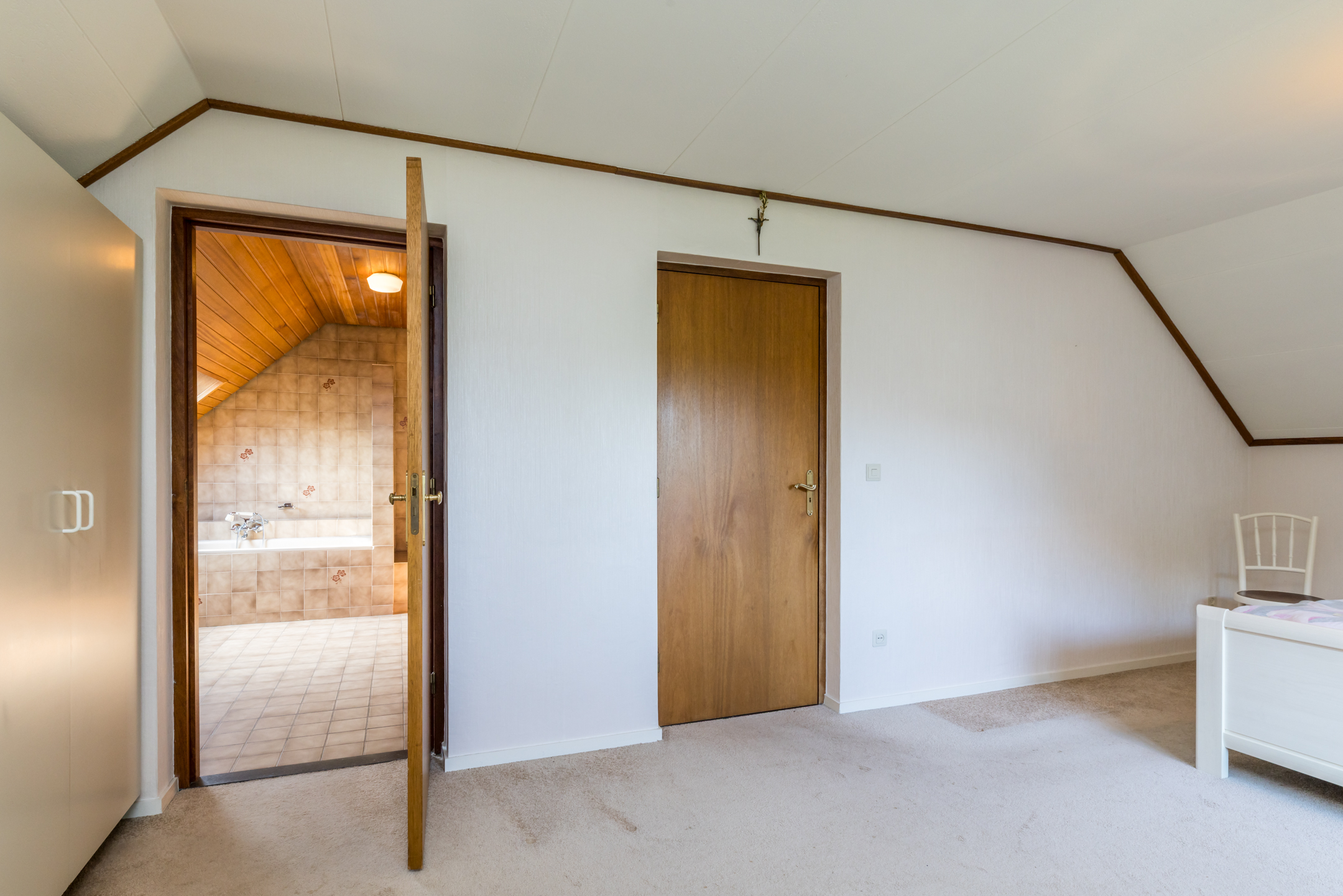 De prachtige trap gaat verder naar de overloop, die toegang biedt tot de master bedroom en twee kinderkamers. De master bedroom is een zeer royale ruimte met een vaste kastenwand en een directe toegang tot de badkamer. Hier ziet u een optimale indeling met een ligbad, aparte douche, een dubbele wastafel en een tweede toilet. Erg handig is dat de badkamer ook vanaf de overloop bereikbaar is.