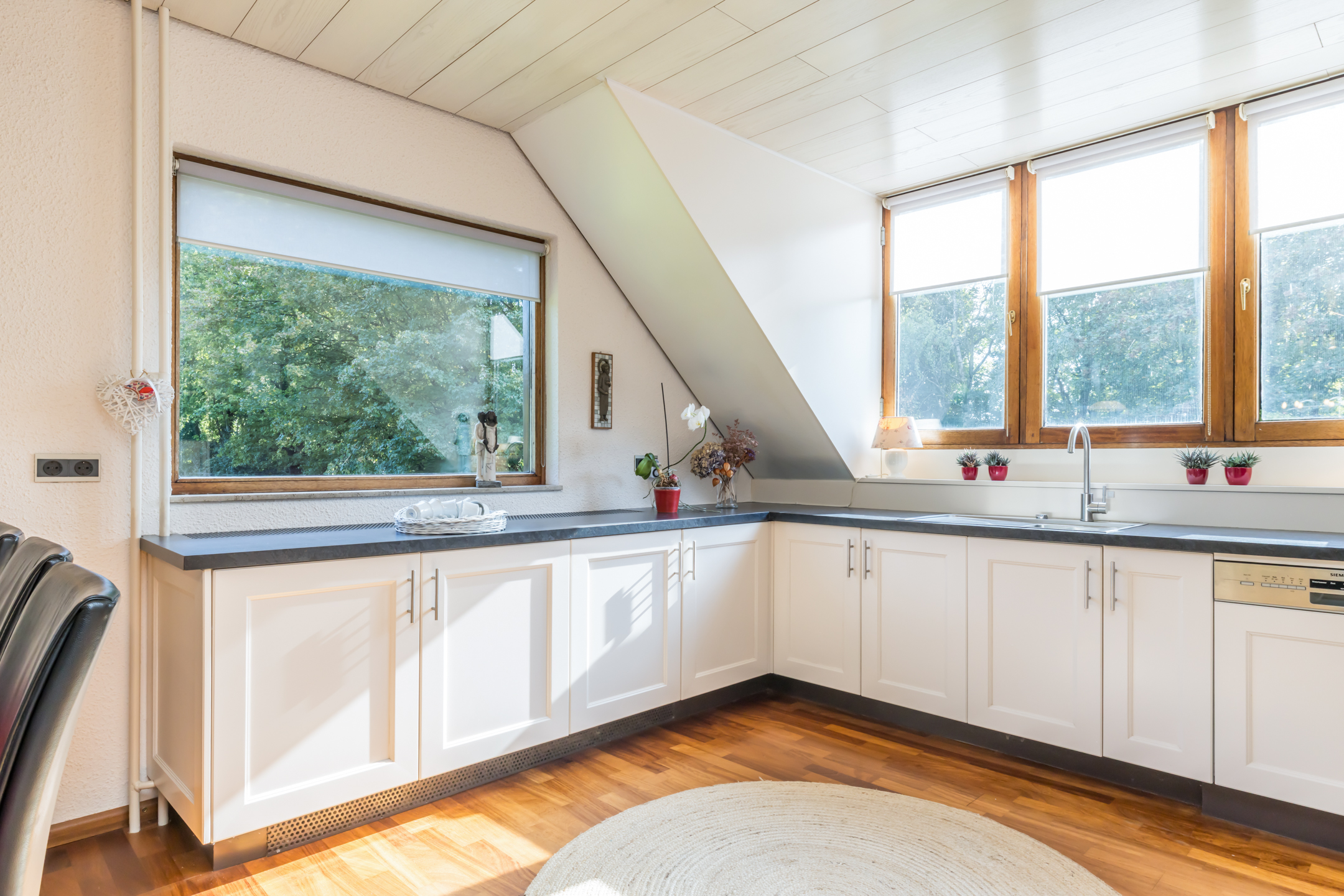 Wat nu het werk-/studeergedeelte is, was oorspronkelijk de eetkamer. Nu fungeert de keuken als eetkeuken, met een vaste 6-persoonstafel en een zeer royale U-opstelling in een lichte kleurstelling. Deze keuken biedt niet alleen volop bergruimte, maar is ook voorzien van alle benodigde inbouwapparatuur. Grote ramen aan twee zijden zorgen voor het allermooiste uitzicht als u in de keuken staat.