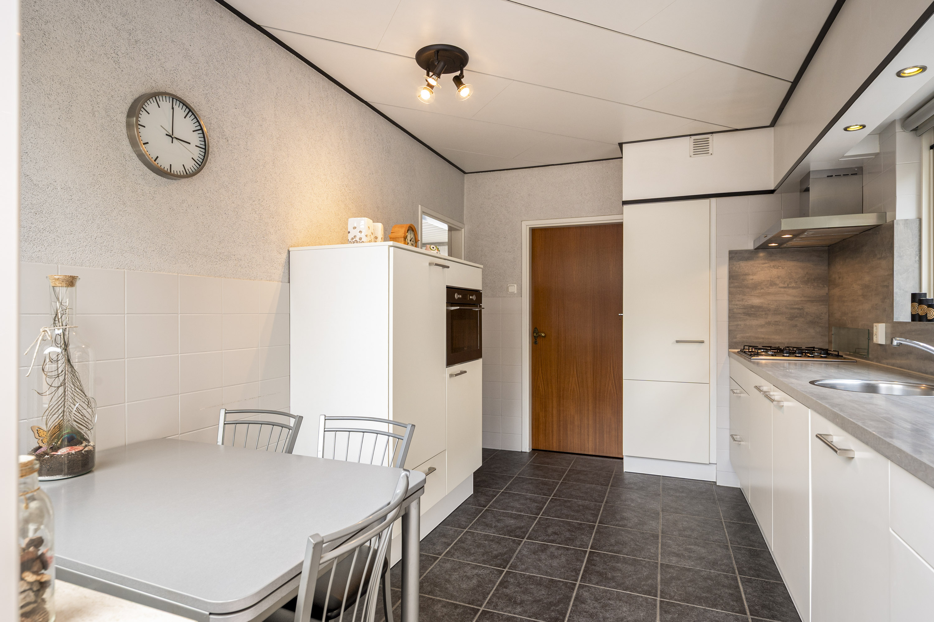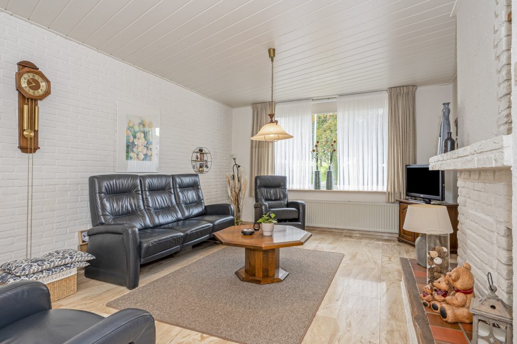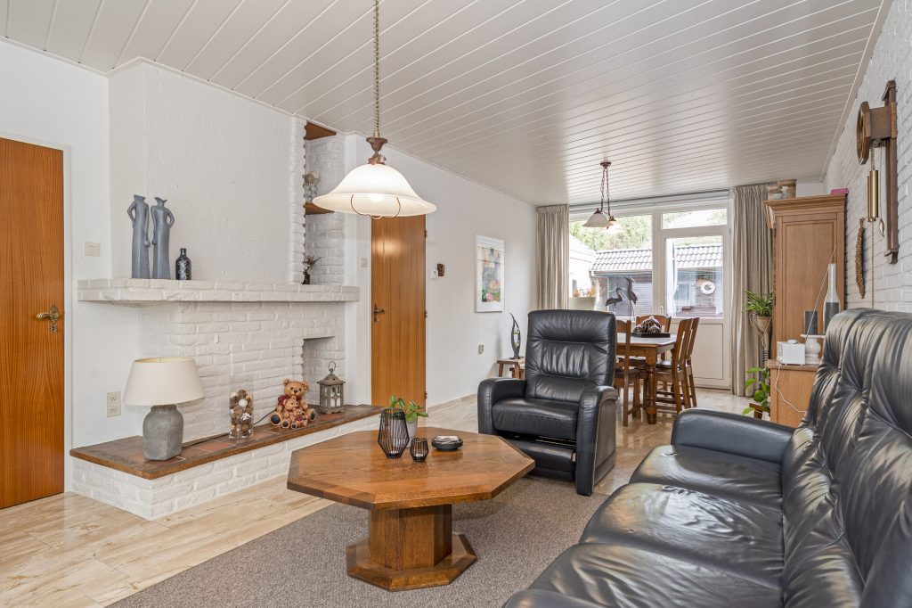 Via de overdekte entree betreedt u de hal alwaar zich de meterkast, garderobe/bergkast en de toiletruimte met fonteintje bevinden. De hal biedt toegang tot de 1e verdieping, de woonkamer en de gesloten keuken. De lichte woonkamer van ca. 31 m² biedt toegang tot de tuin en aan de voorzijde geniet u van vrij uitzicht over de groene omgeving. De woonkamer staat in verbinding met de gesloten keuken van ca. 11 m², welke optimaal tuincontact biedt en voorzien is van een nette inbouwkeuken met combi-oven, vaatwasser, gootsteen, 4-pits gaskookplaat, afzuigkap en koelkast. Daarnaast is er een mogelijkheid om een haard aan te sluiten in de woonkamer.