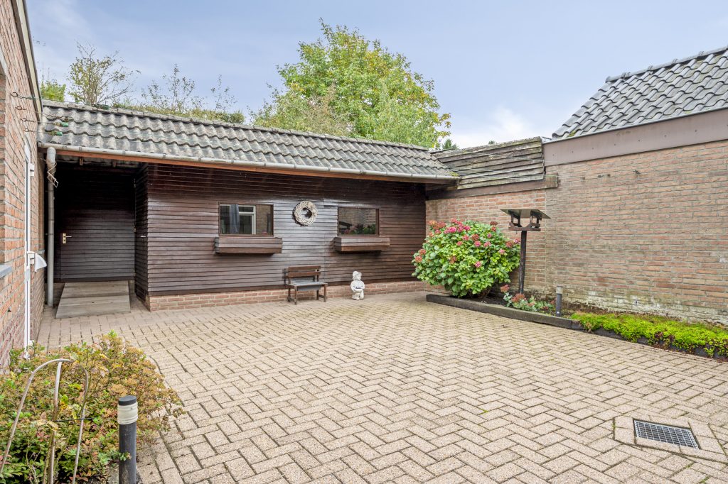 Vanuit de woonkamer en de keuken bereikt u de op het oosten gelegen onderhoudsvrije tuin. Op het terras kunt u optimaal genieten van alle rust die deze omgeving te bieden heeft. Vanuit het terras is er toegang tot de oprit, de garage en de houten stalling. De garage van ca. 23 m² is voorzien van een elektrische poort, aansluiting voor witgoedapparatuur, wasbakje en beschikt over een handige bergvliering. De houten schuur en berging bieden in combinatie met de huisweide diverse mogelijkheden. Zo is onder andere het houden van dieren een optie.